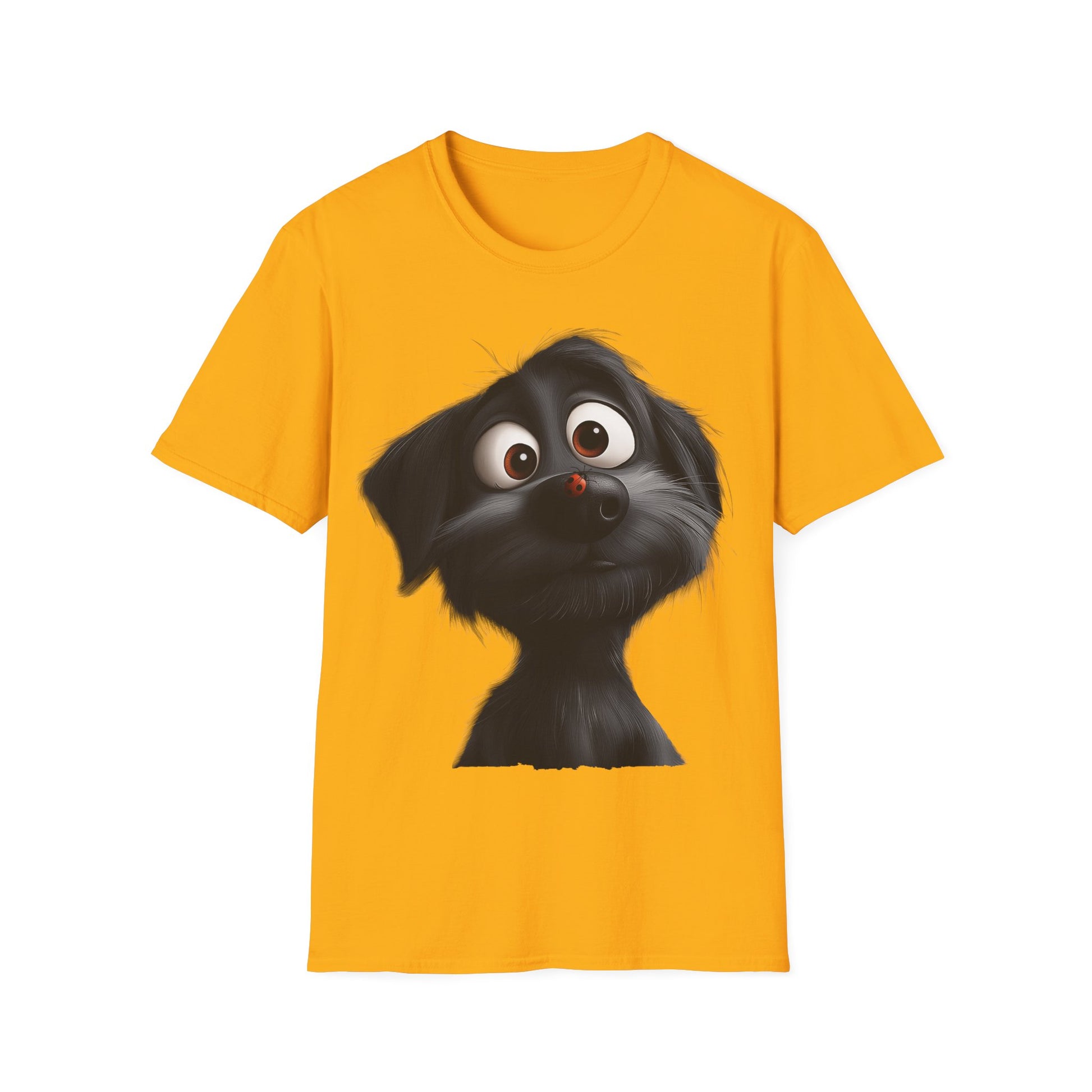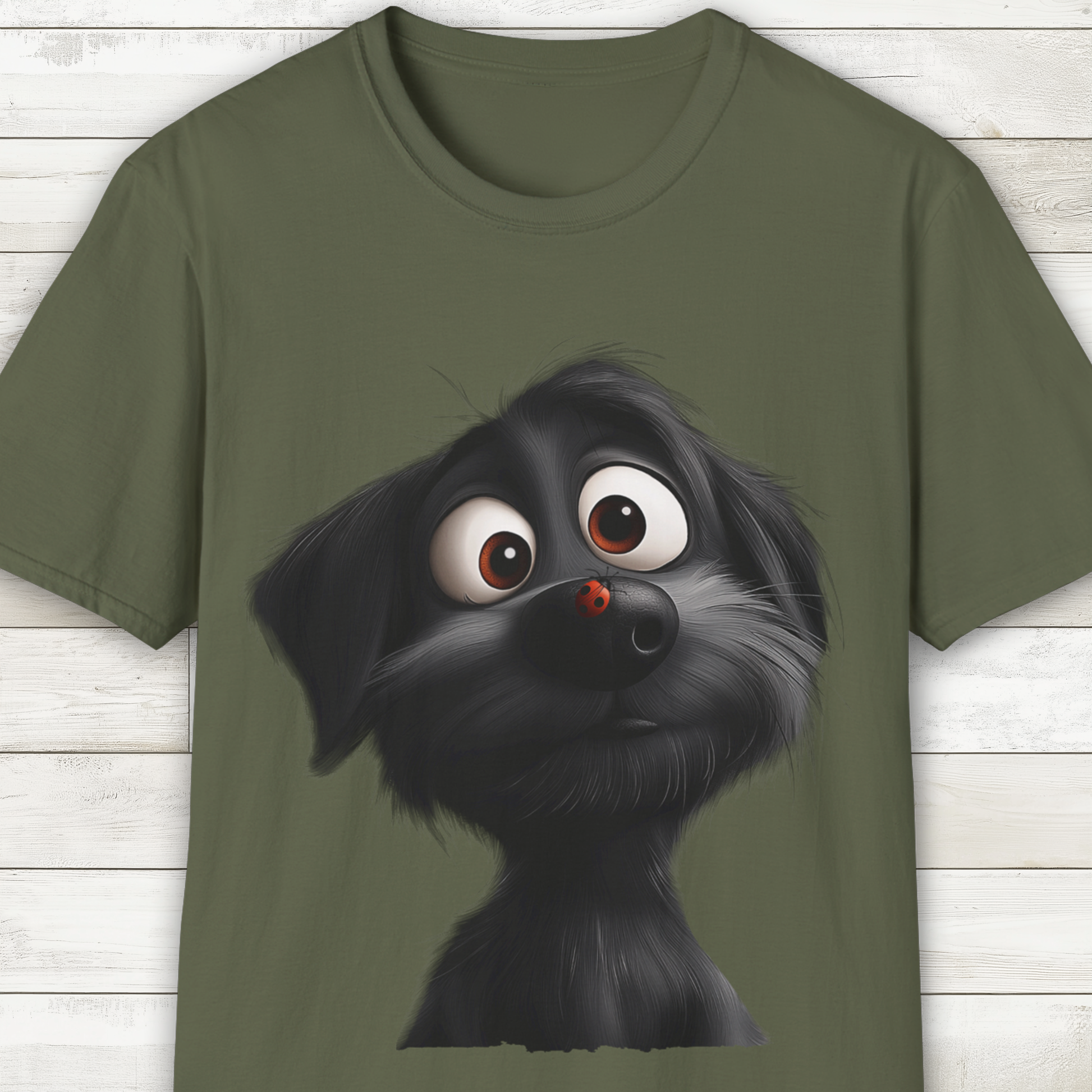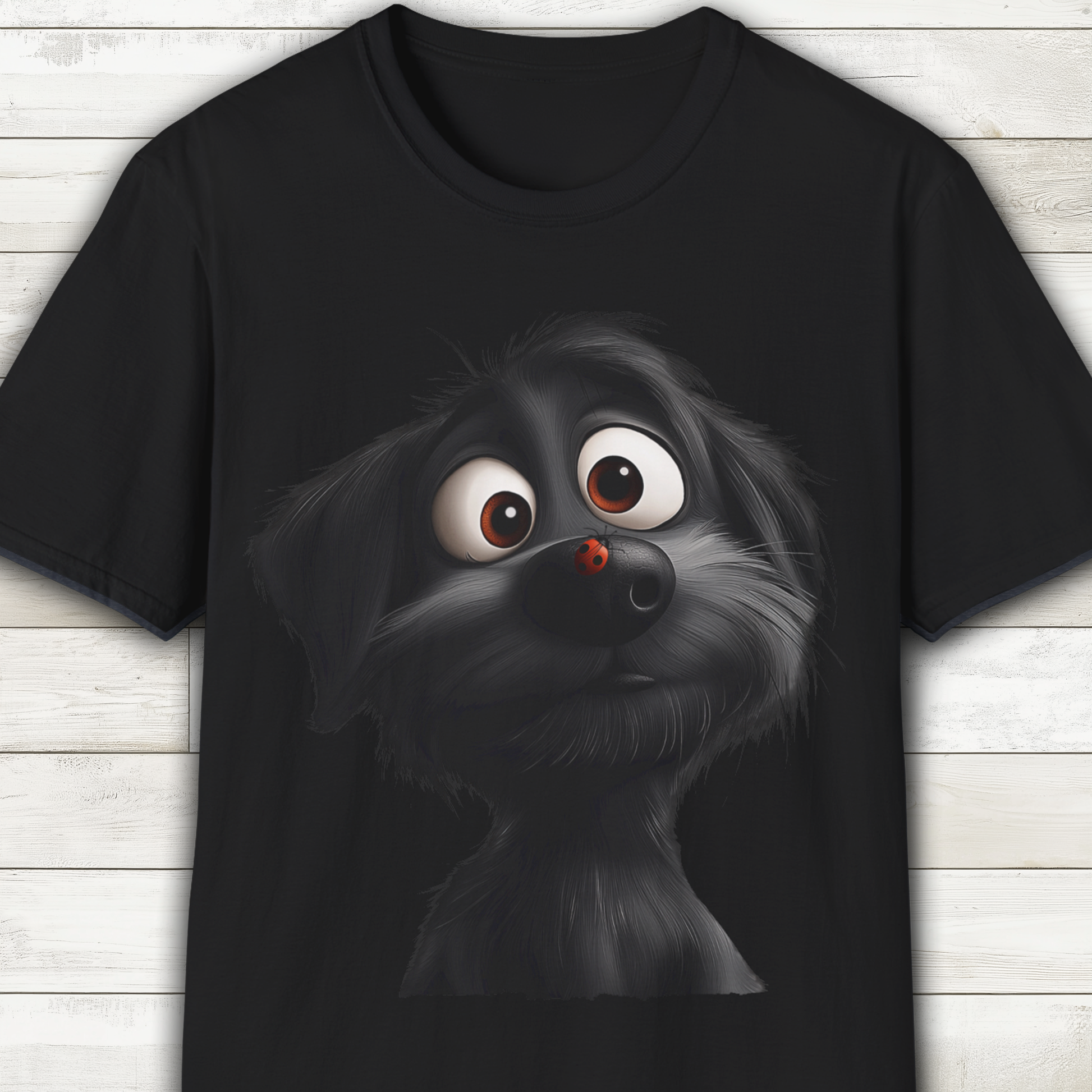 This adorable T-shirt features a charming black dog with a tiny red ladybug perched on its nose, exuding cuteness and innocence. It is perfect for dog lovers or anyone who enjoys whimsical, animal-inspired artwork. It is ideal for casual wear or as a fun gift for dog enthusiasts.