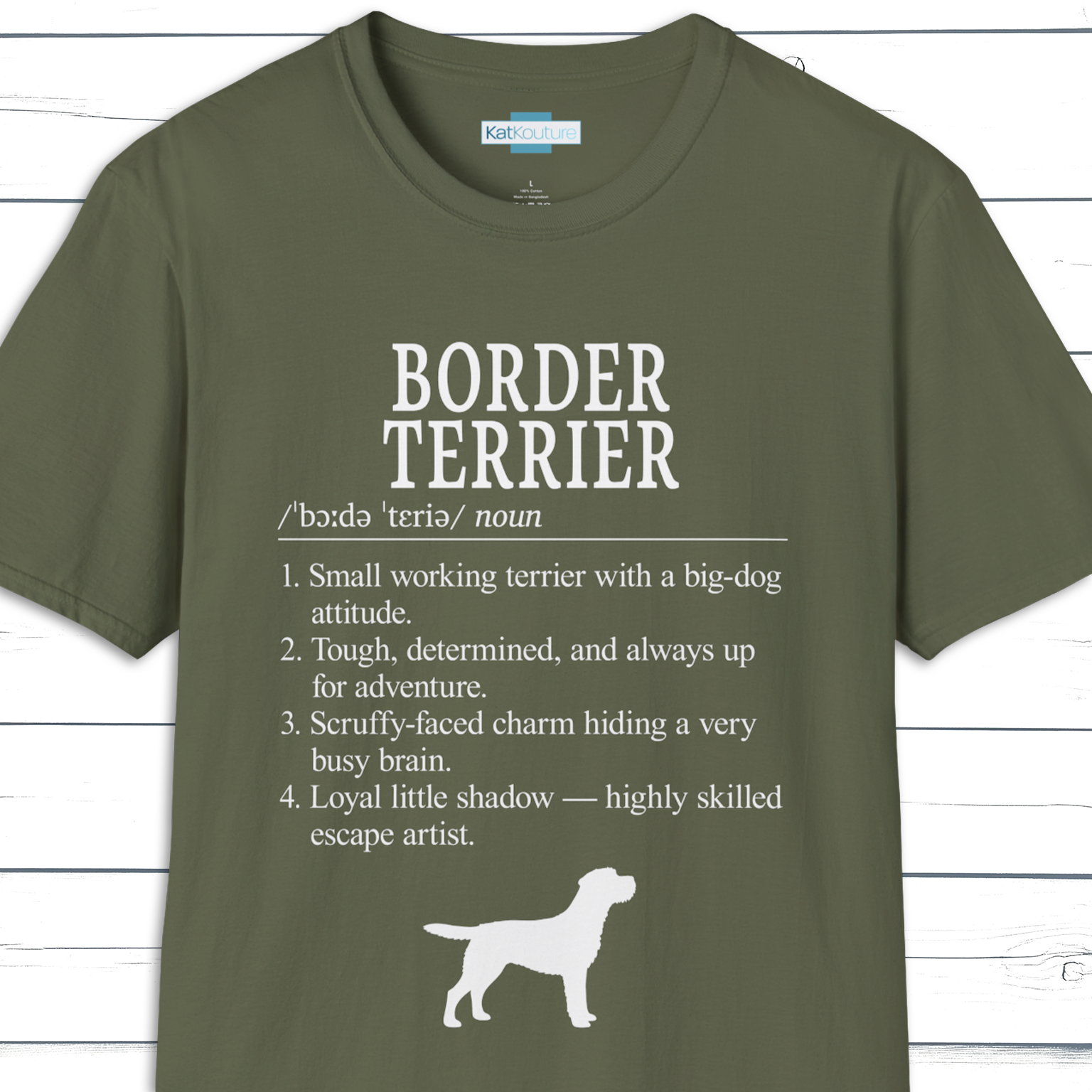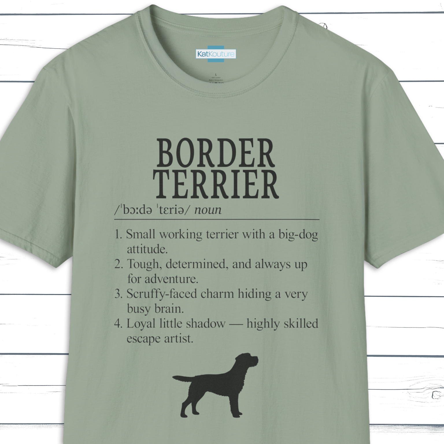 Part of KatKouture’s Dictionary Dogs Collection, this Border Terrier Definition T-Shirt celebrates the breed’s fearless spirit, scruffy charm, and endlessly determined nature in a clean, minimalist dictionary-style design. Featuring classic typography, IPA pronunciation, and four thoughtfully written traits, it blends true Border Terrier character with a subtle touch of humor.