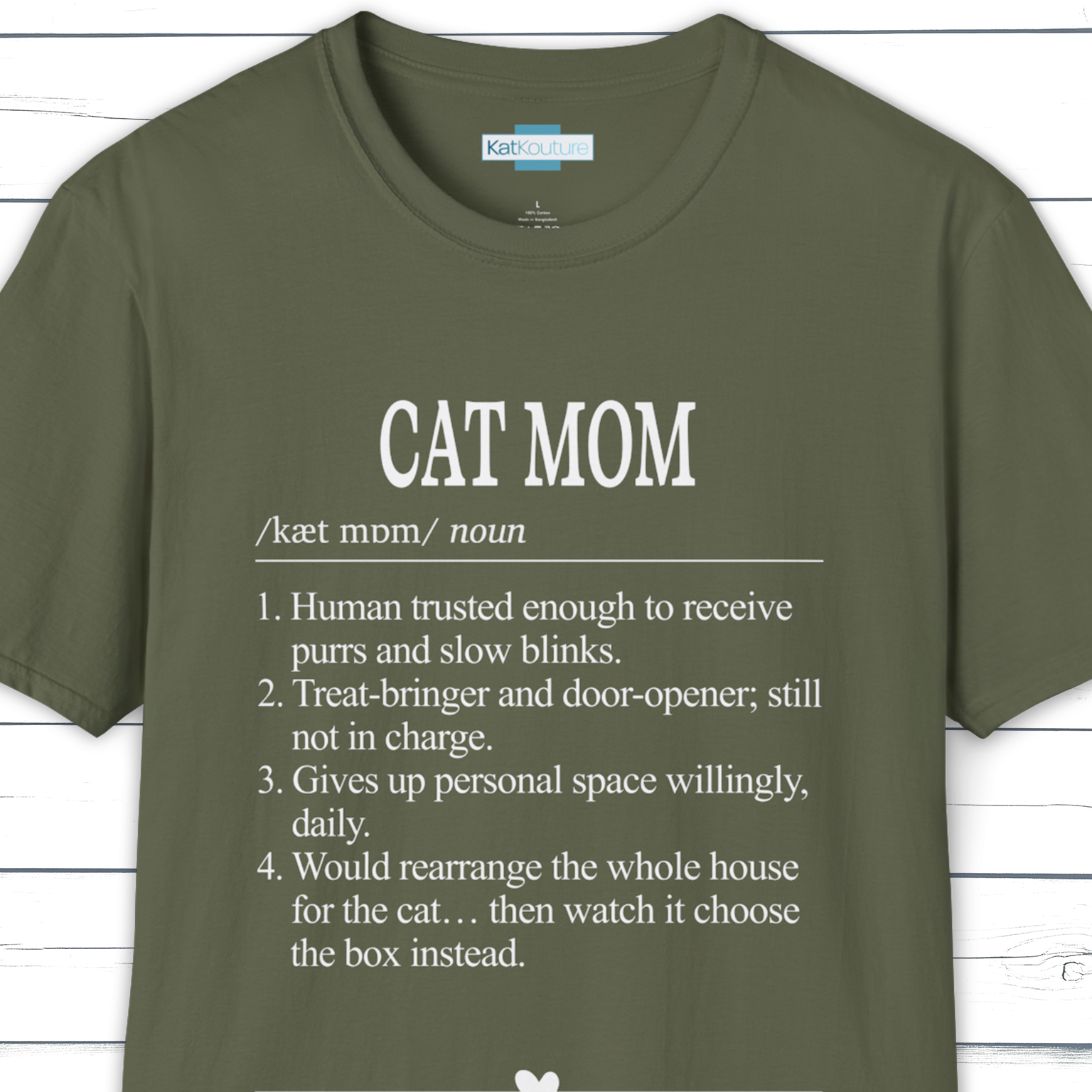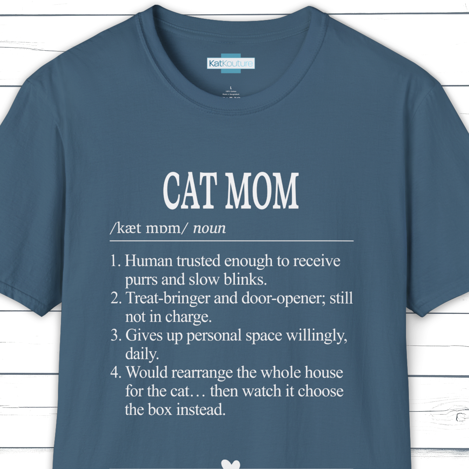 Cat moms get it. This minimalist dictionary-style tee is a clean, clever nod to the everyday chaos and quiet devotion that comes with being chosen by a cat. Featuring a neat “Cat Mom” heading, IPA pronunciation, and four relatable definitions, it’s the kind of design that looks smart up close and still reads bold from a distance.