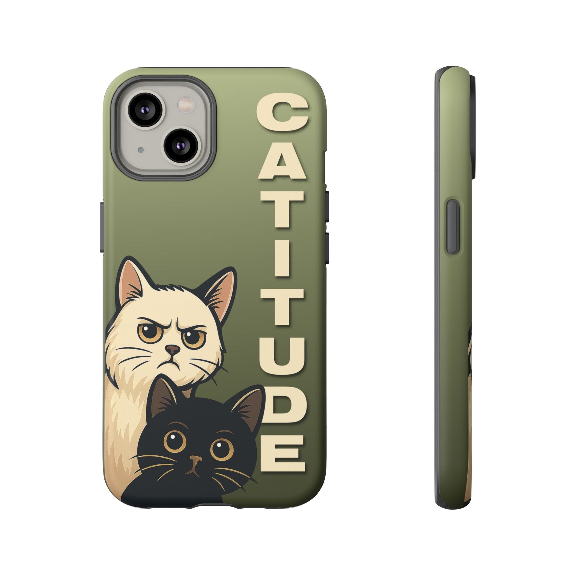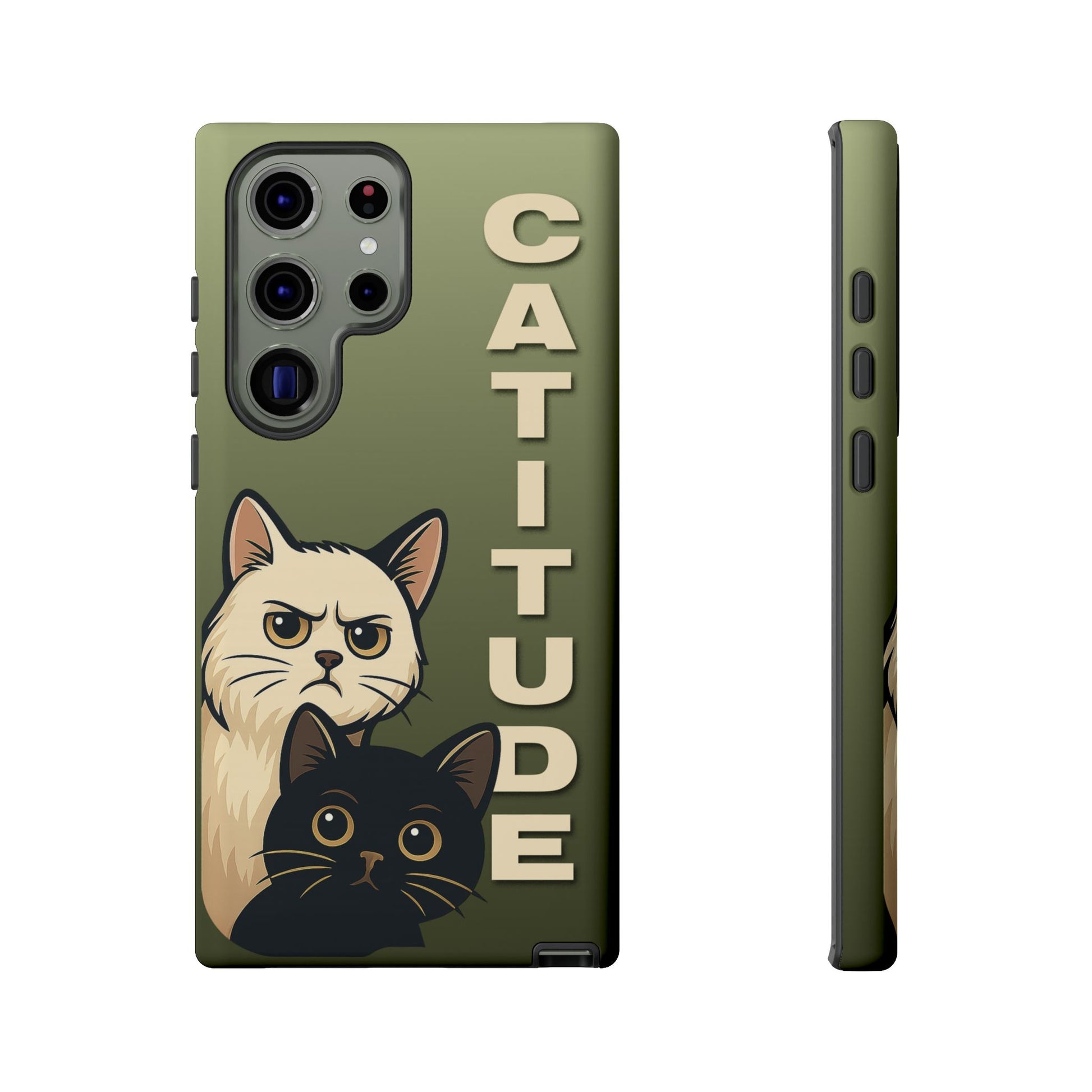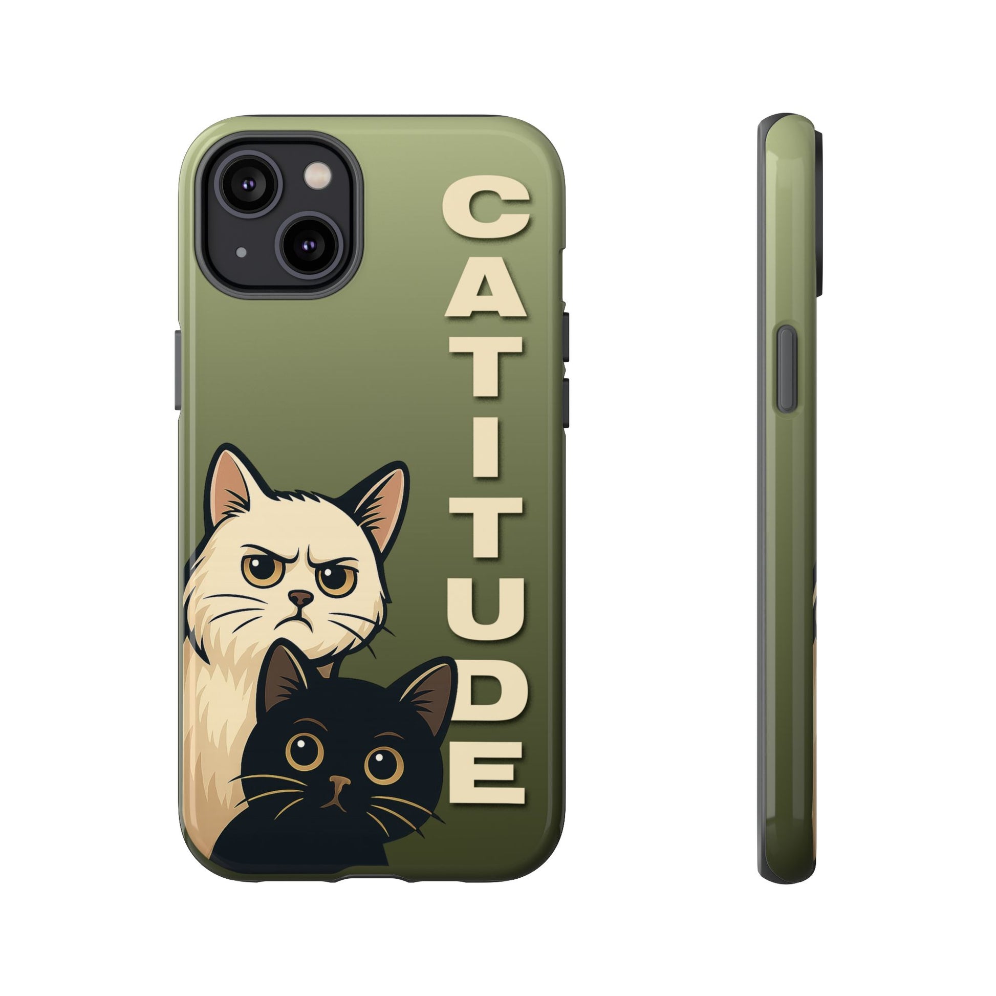 Show off your feline sass with this bold Catitude phone case, featuring a grumpy cream cat and a wide-eyed black kitten with serious attitude. The design pops against a muted military green background with bold vertical text, giving it a playful yet edgy vibe.