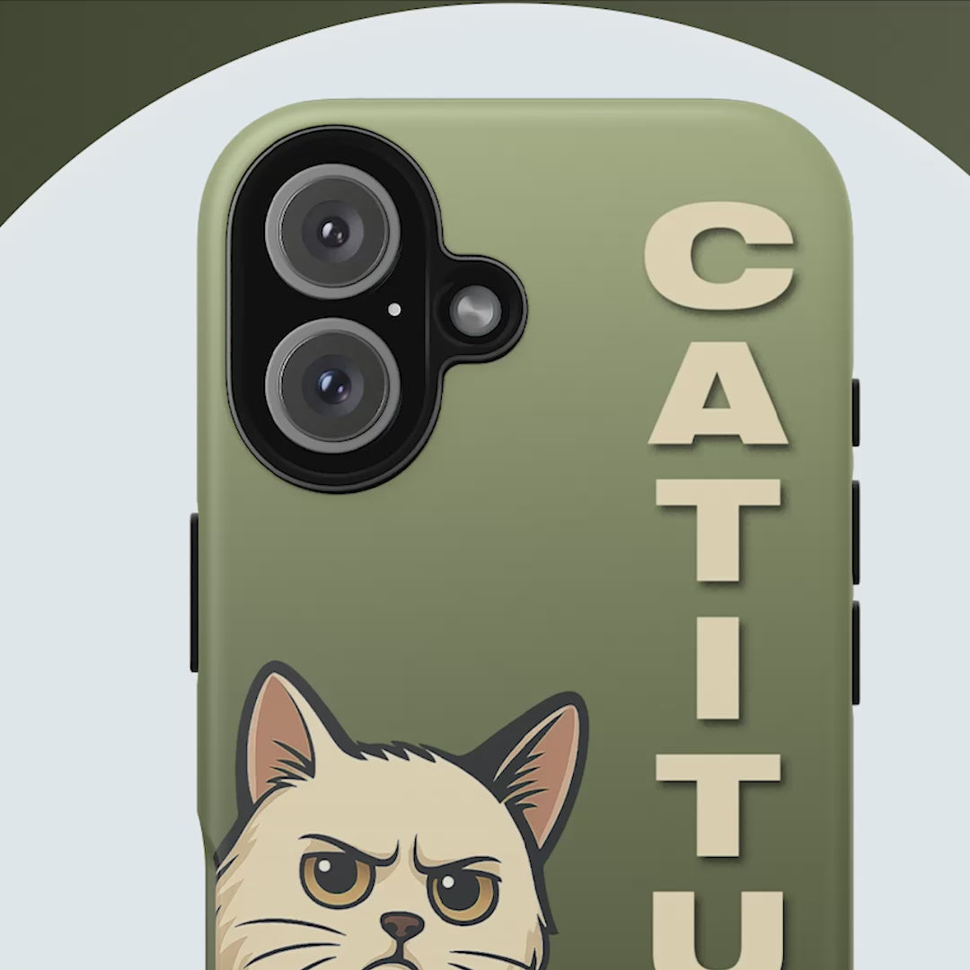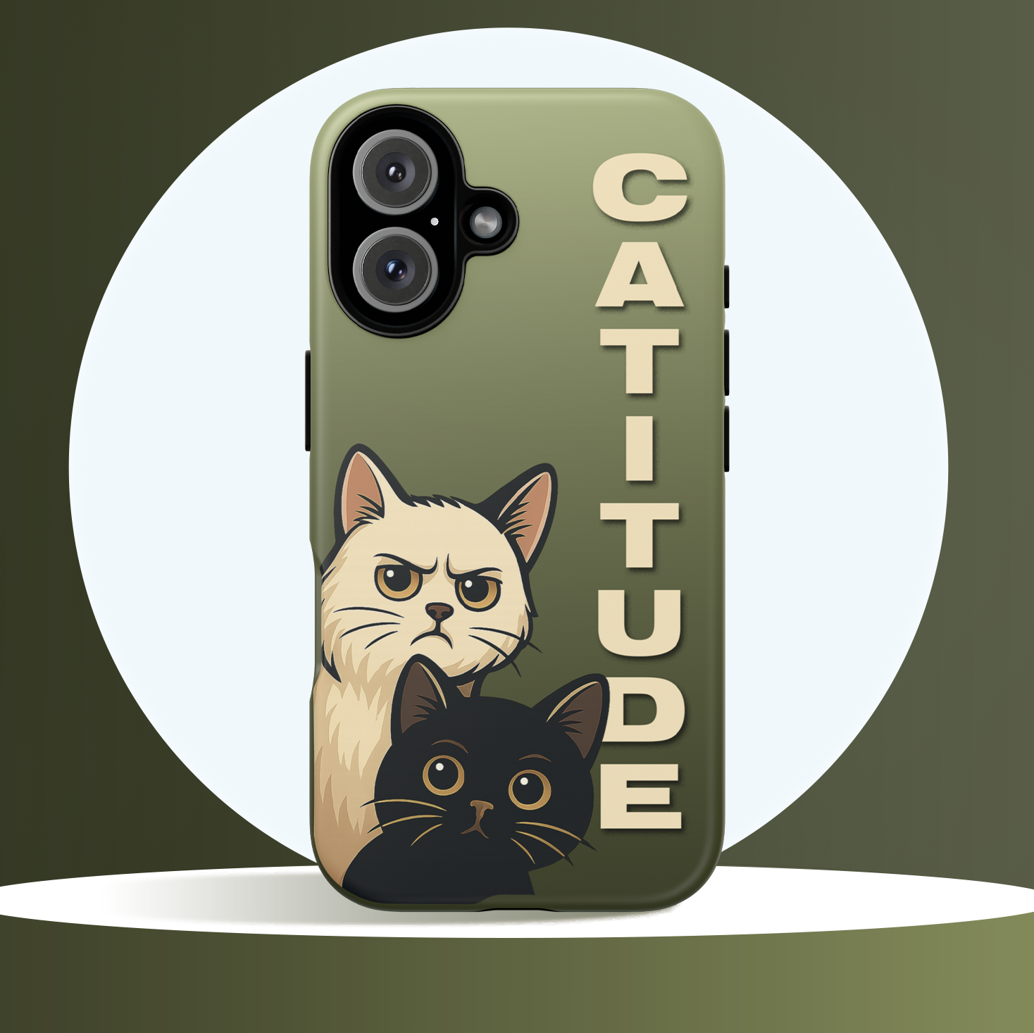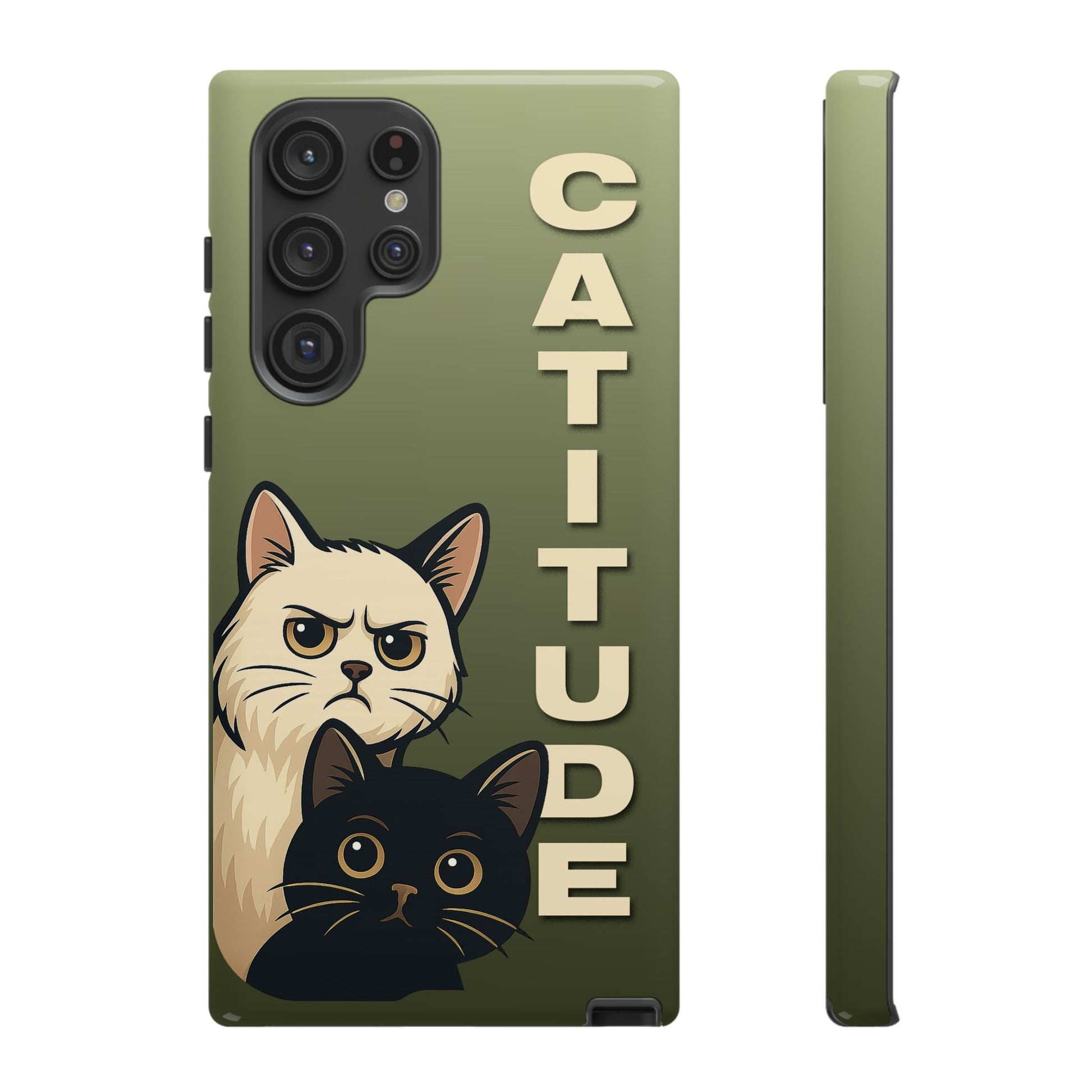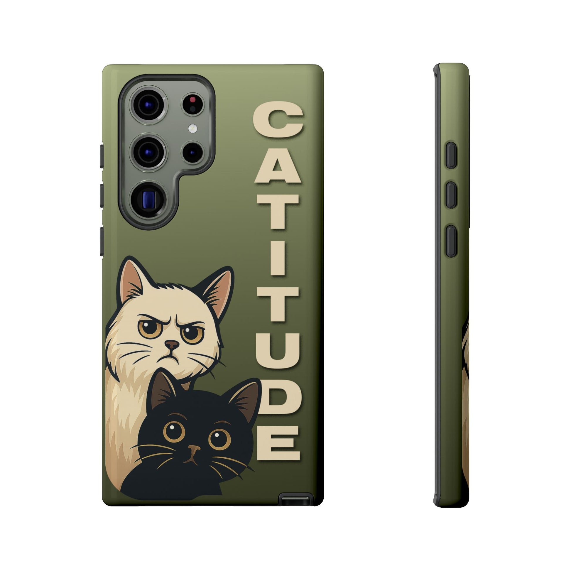 Show off your feline sass with this bold Catitude phone case, featuring a grumpy cream cat and a wide-eyed black kitten with serious attitude. The design pops against a muted military green background with bold vertical text, giving it a playful yet edgy vibe.