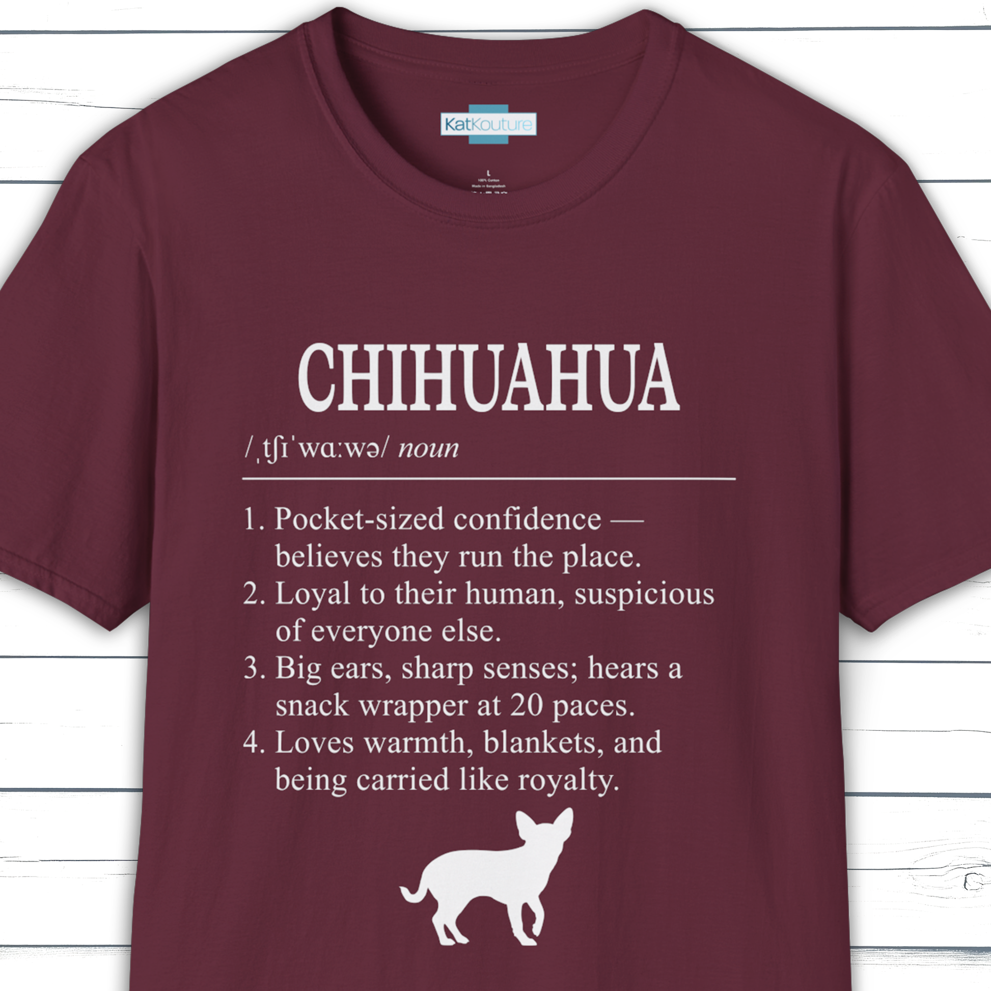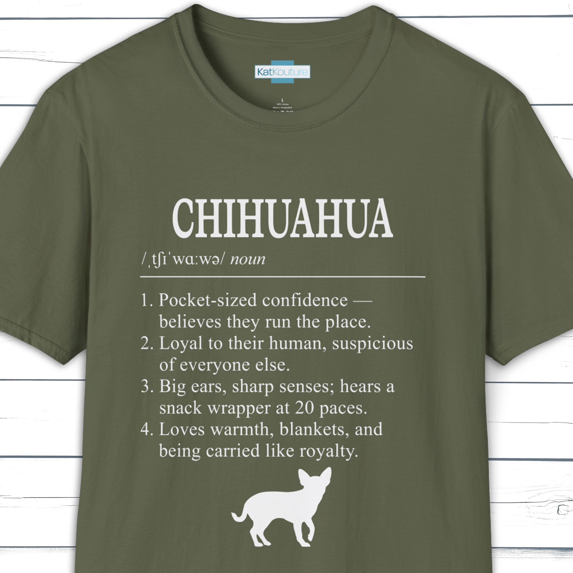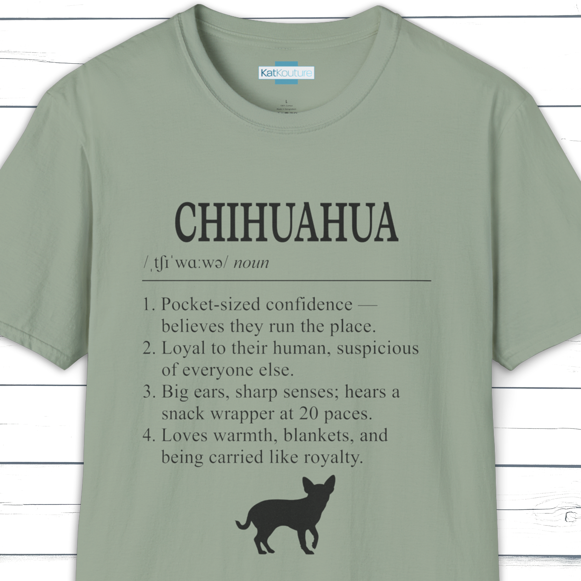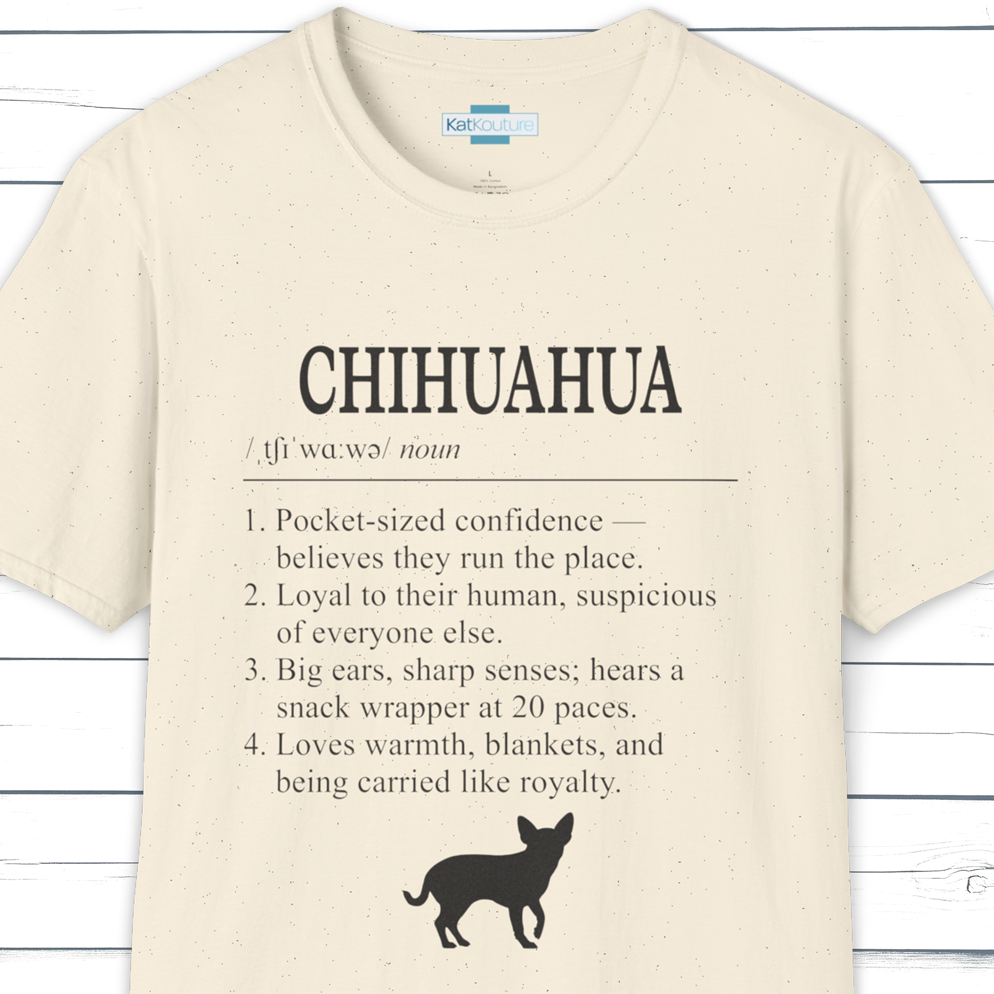 Part of KatKouture’s Dictionary Dogs Collection — a refined typographic design capturing the Chihuahua’s tiny size and huge personality. Presented in a classic dictionary layout with IPA pronunciation and four sharply observed traits.