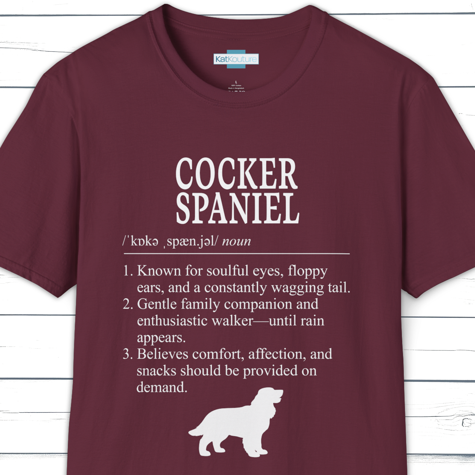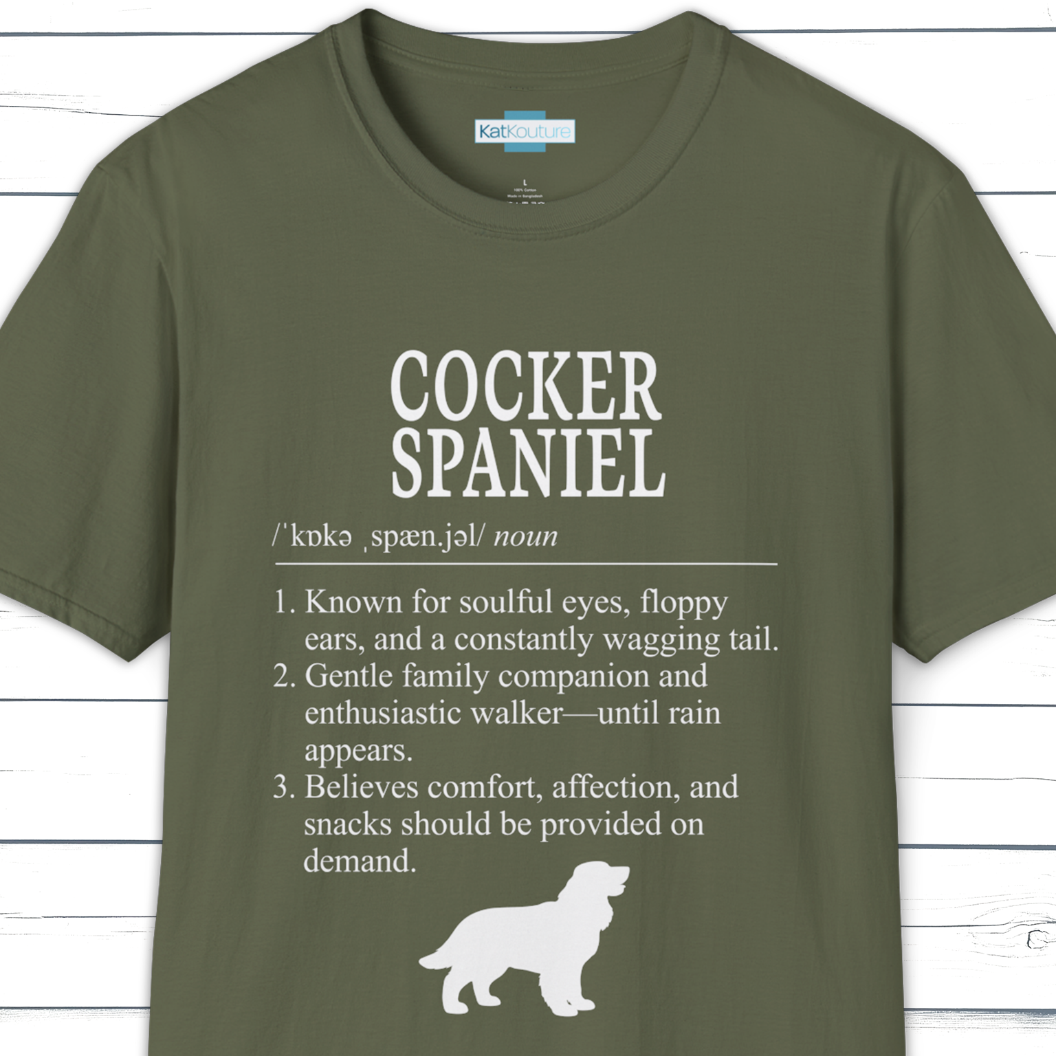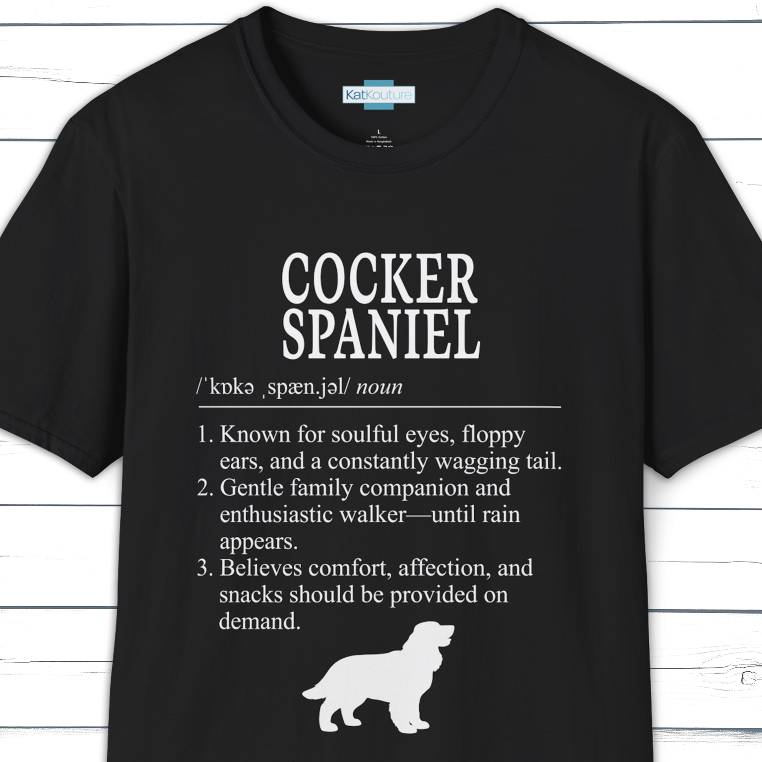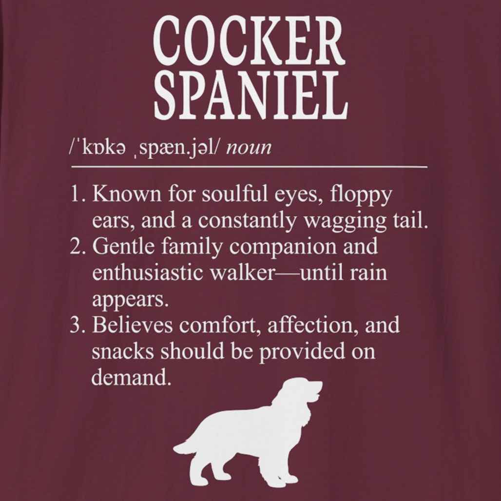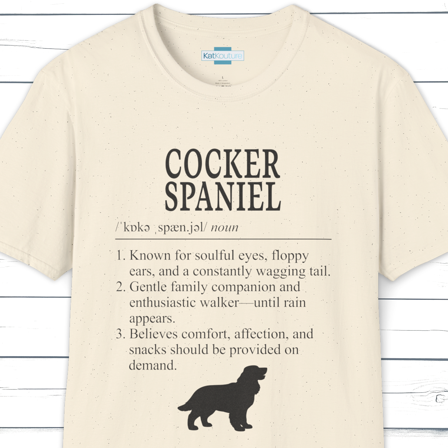 Part of KatKouture’s Dictionary Dogs Collection, this Cocker Spaniel definition T-shirt captures the breed’s sweet nature, lively spirit, and unmistakable floppy-eared charm in a clean, minimalist dictionary-style design. Featuring classic typography, IPA pronunciation, and three thoughtfully written traits, it blends real breed personality with a subtle wink of wit.