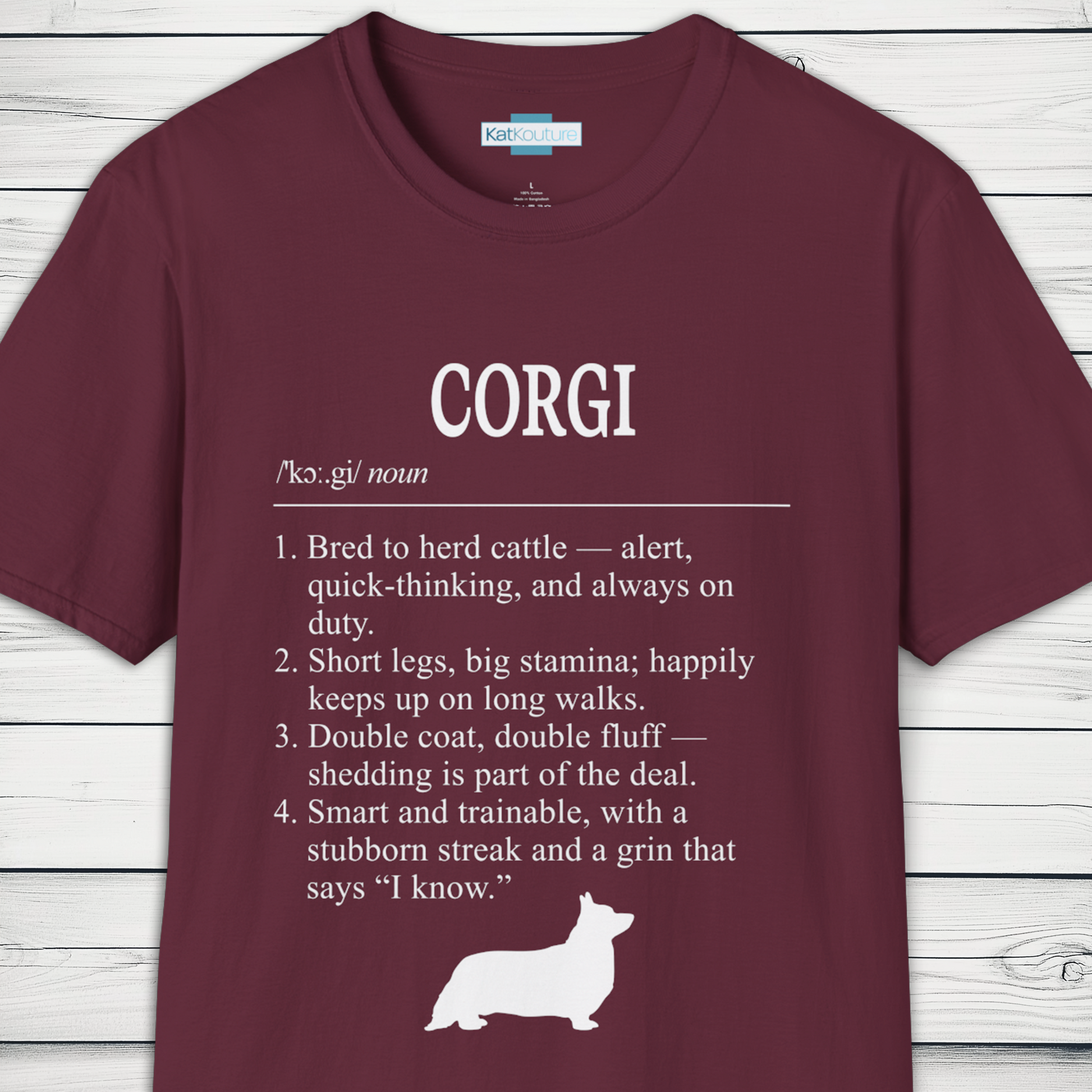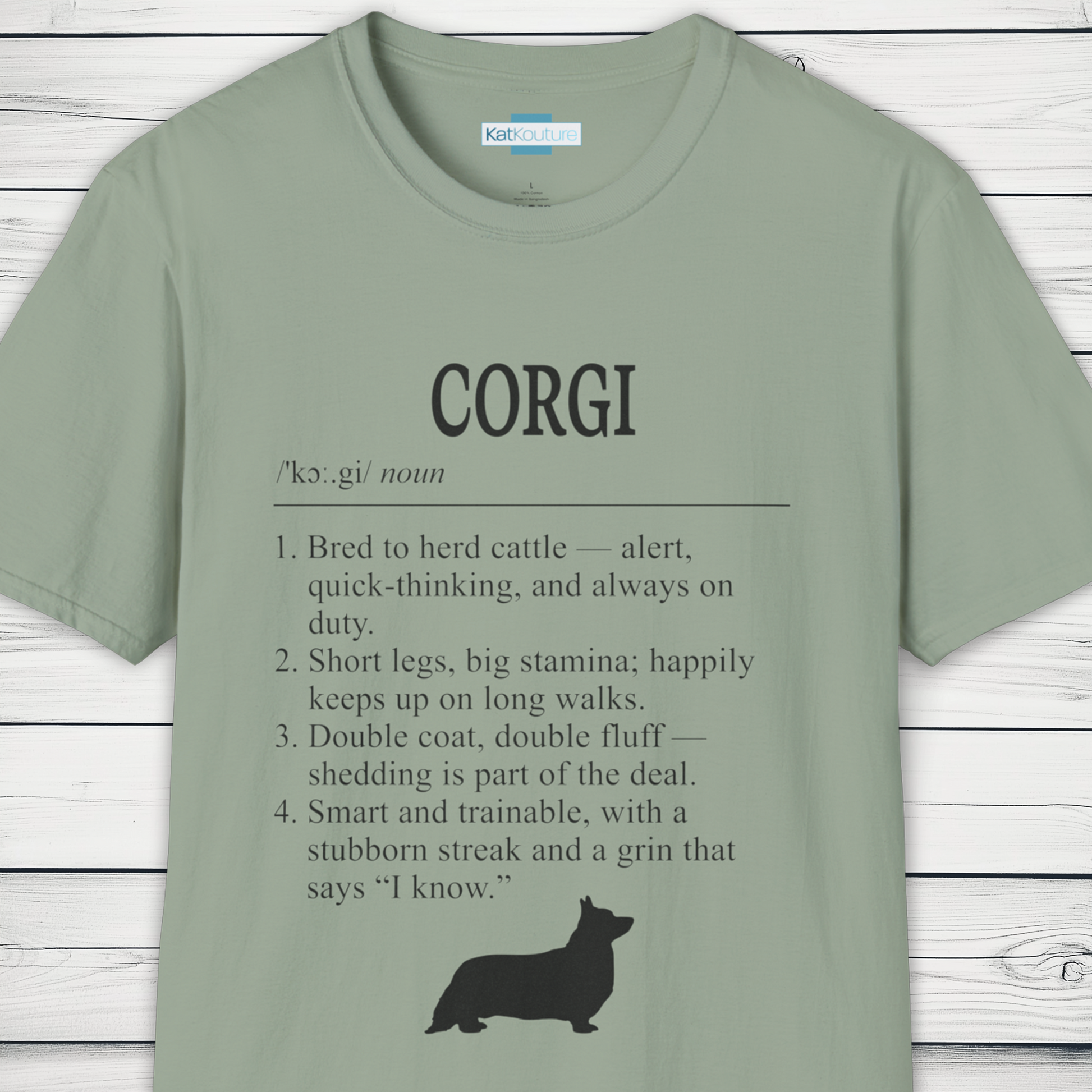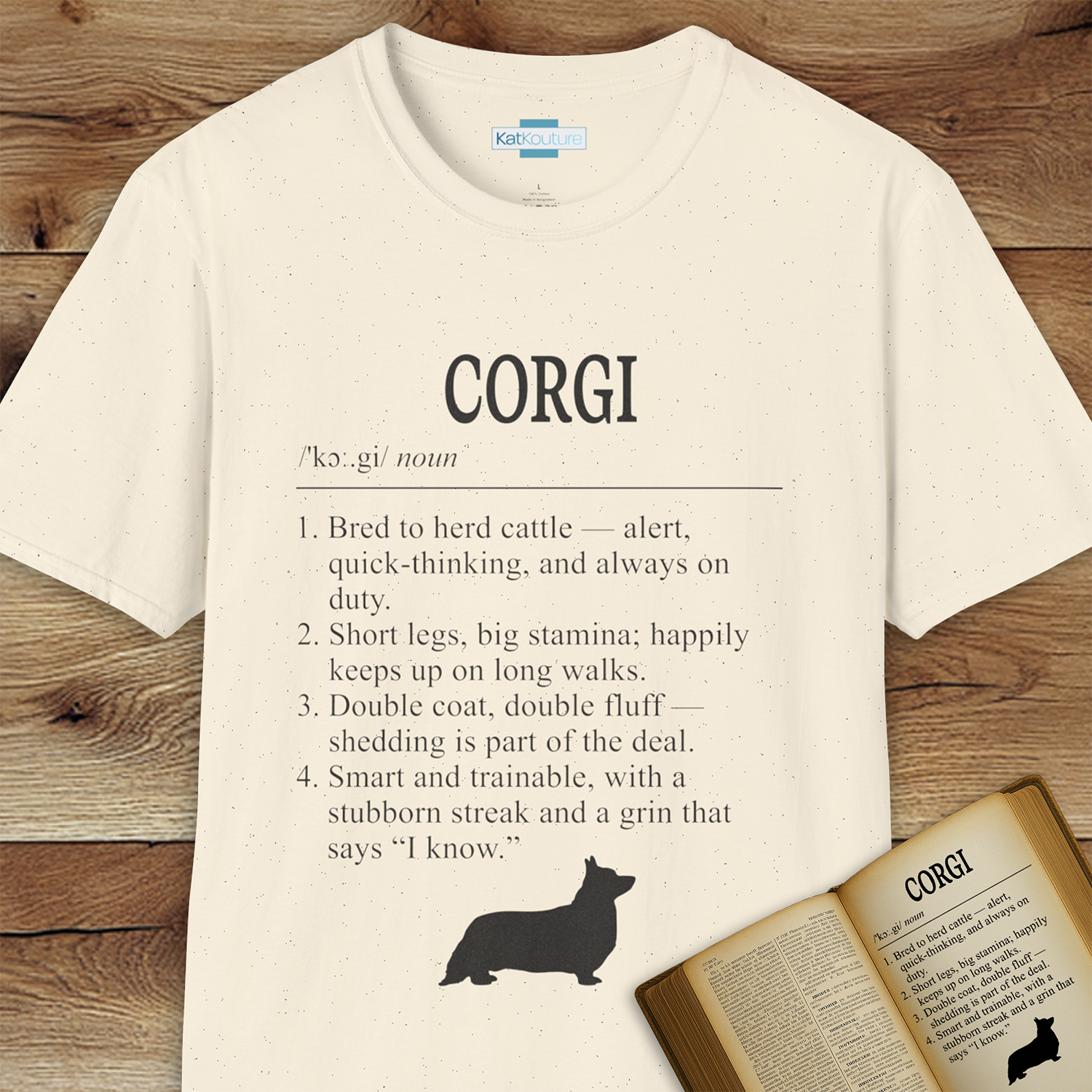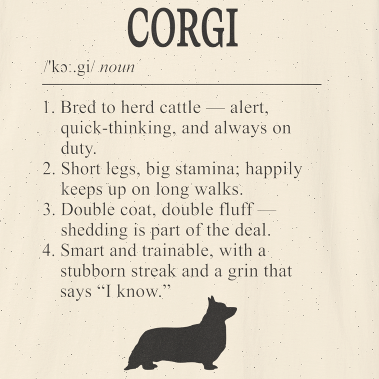 Part of KatKouture’s Dictionary Dogs Collection — a refined typographic design capturing the Corgi’s bold charm and bossy little brilliance. Presented in a classic dictionary layout with pronunciation styling and four neatly observed traits.