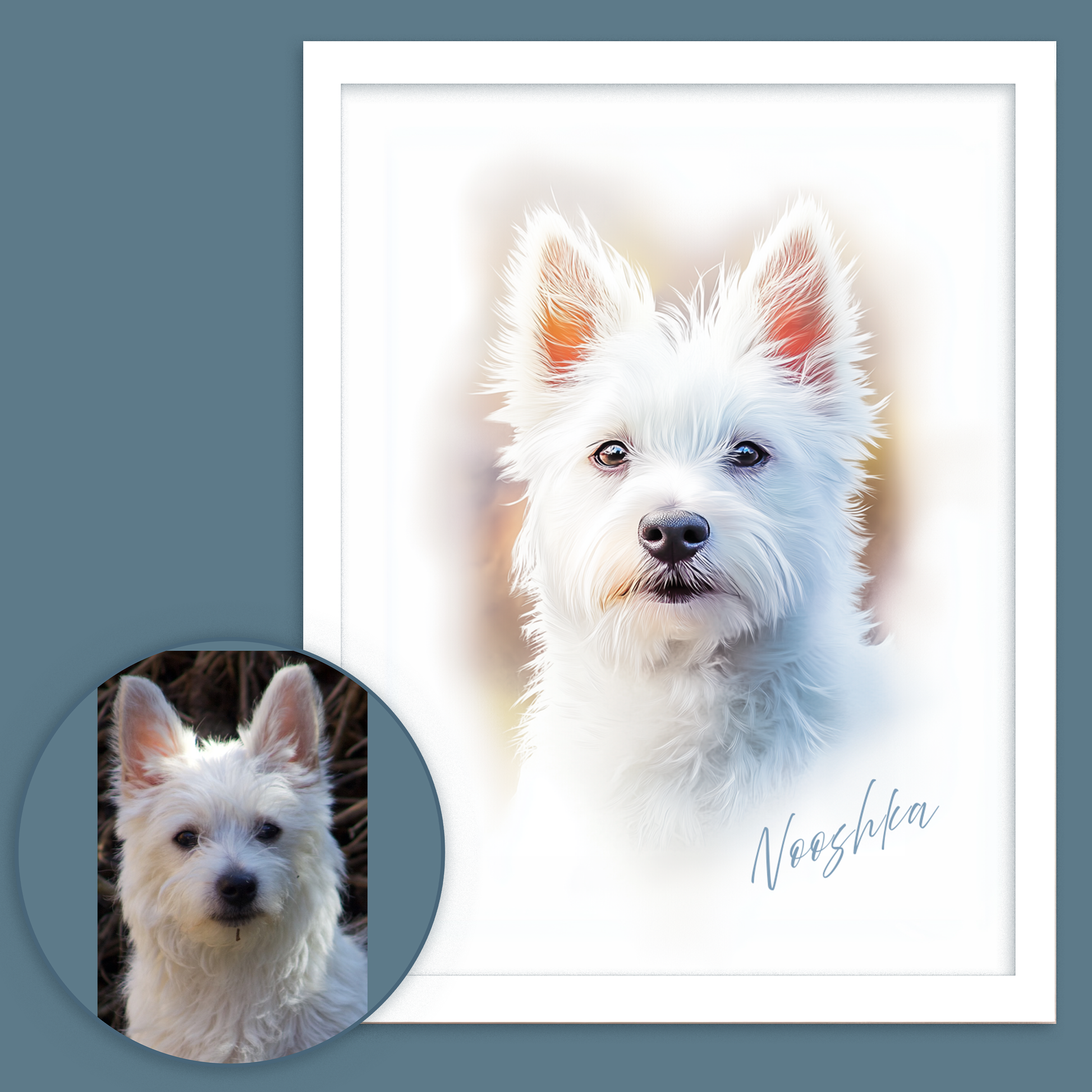 The Framed Poster features a custom pet portrait in watercolor style, perfect for pet lovers. The vibrant colors and hand-crafted wooden frame make it a beautiful addition to any home decor. Ideal for gifting on birthdays, holidays, or as a special treat for yourself.