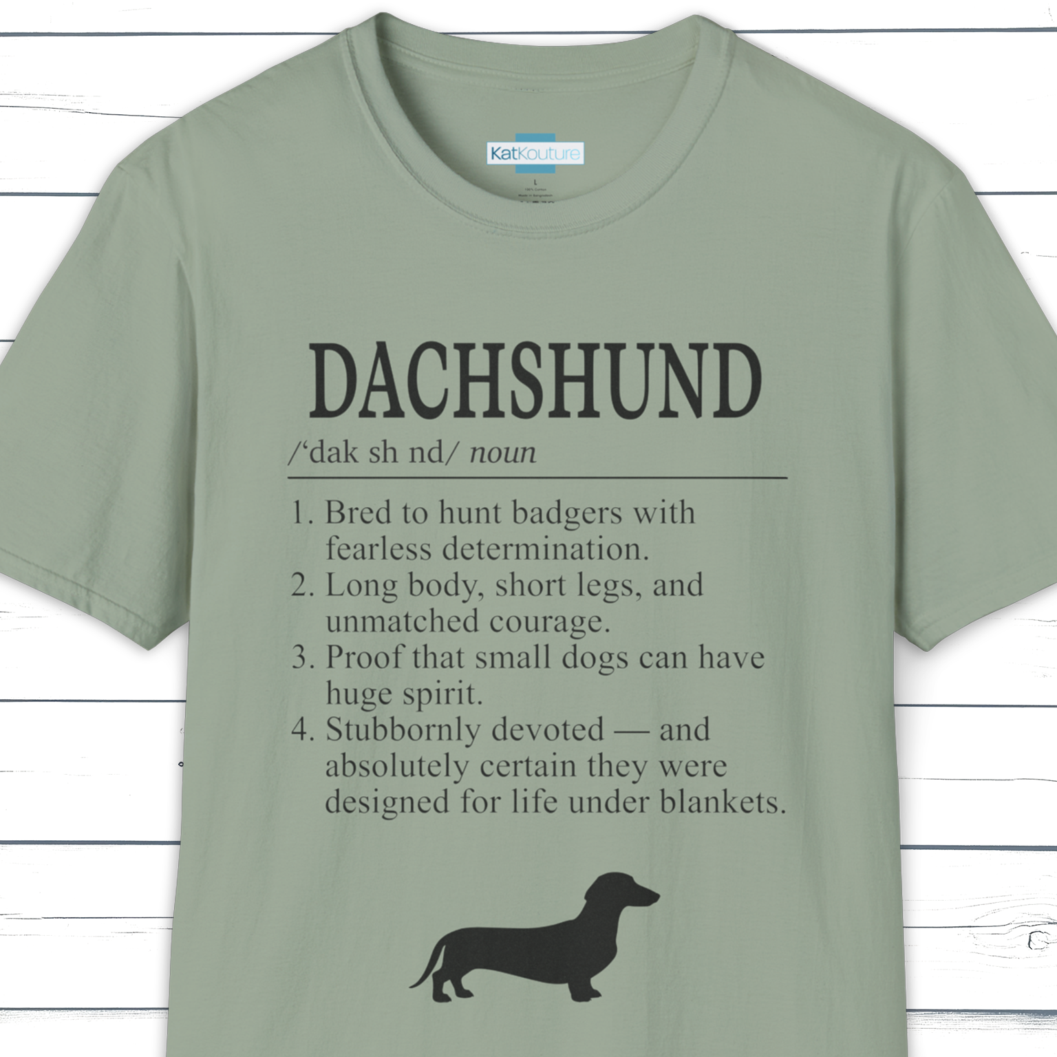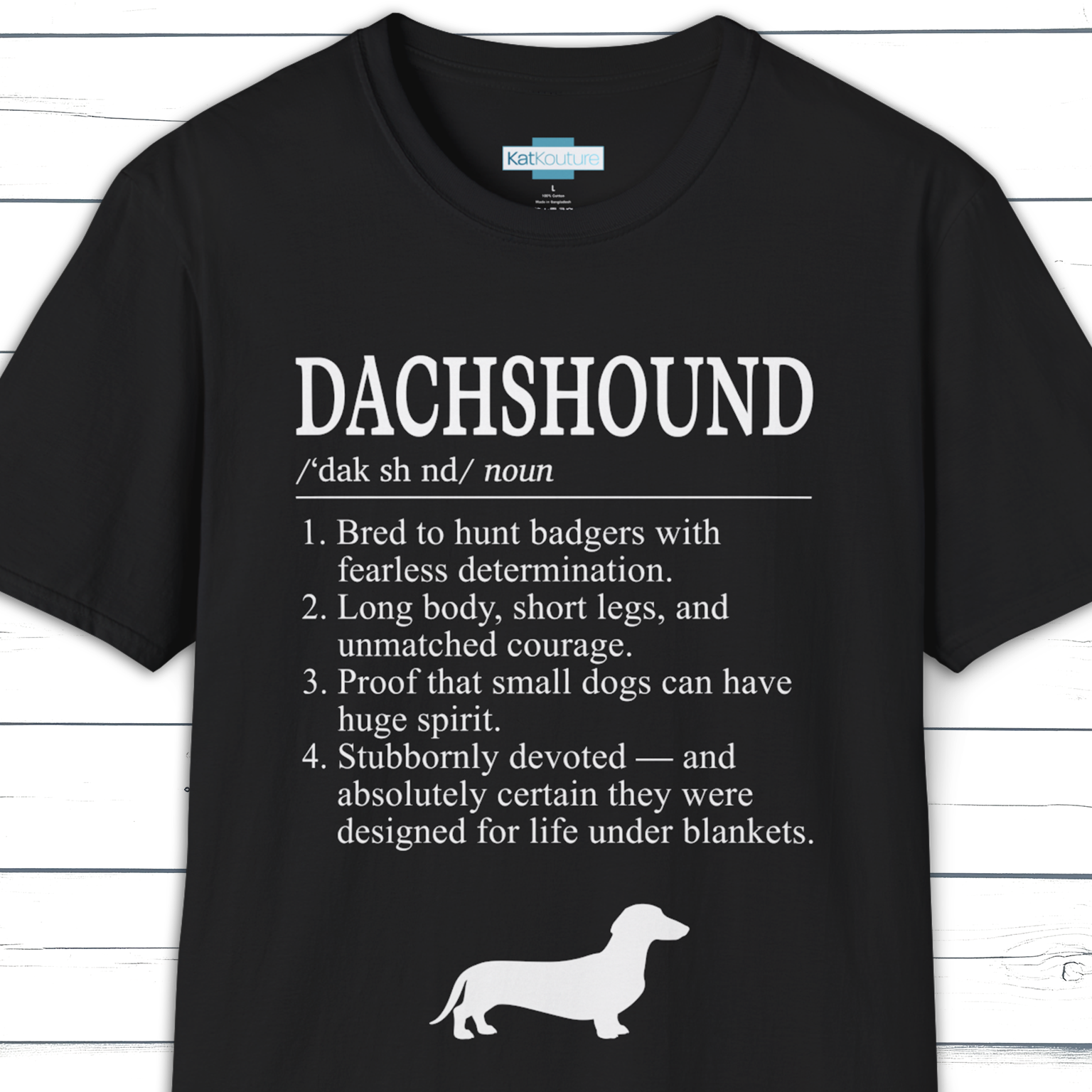 Part of KatKouture’s Dictionary Dogs Collection, this Dachshund definition T-shirt captures the breed’s brave little confidence, stubborn streak, and unmistakable “small dog, big plans” energy in a clean, minimalist dictionary-style design. Featuring classic typography, IPA pronunciation, and four thoughtfully written traits, it’s a subtle, witty nod to the sausage dog personality.