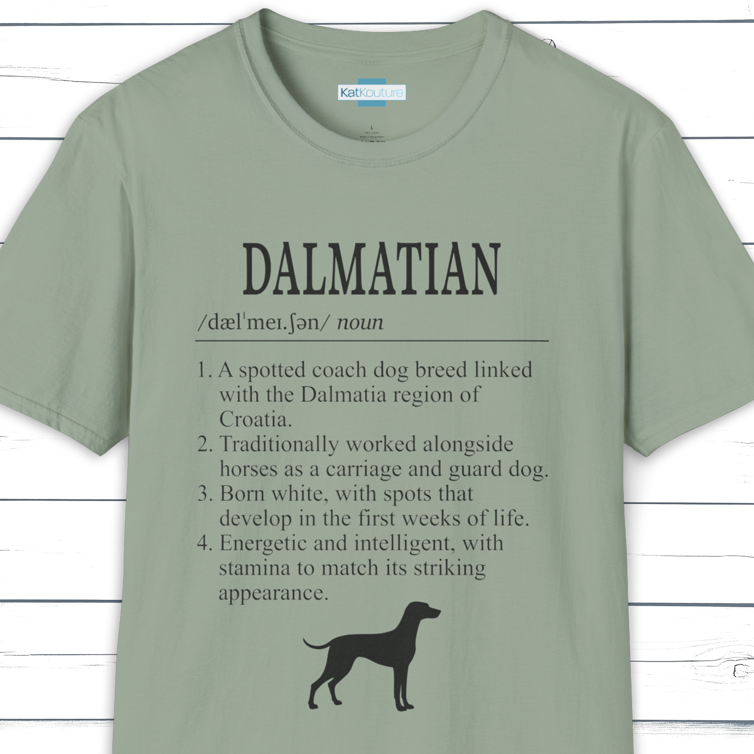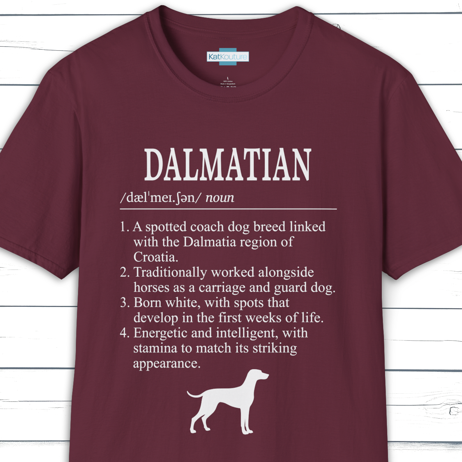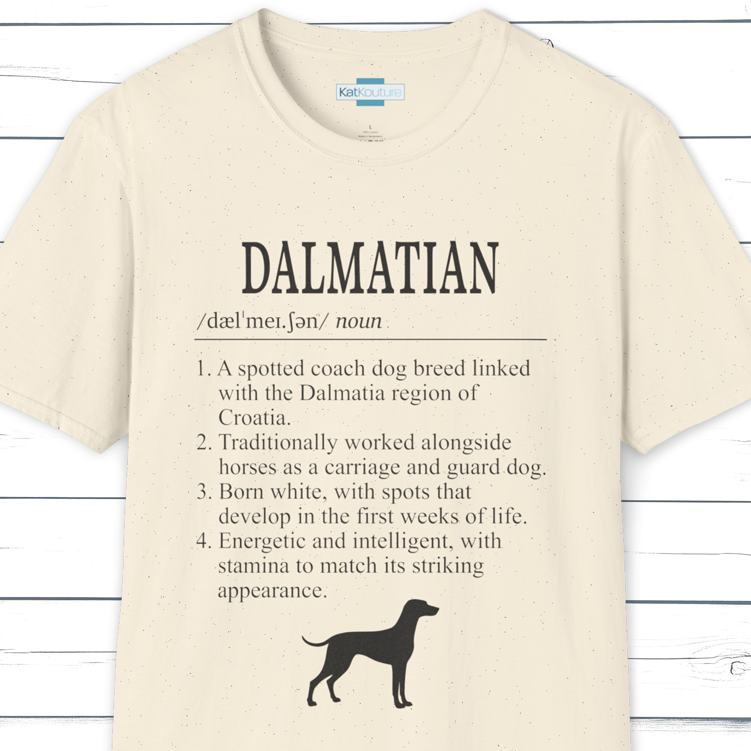 Part of KatKouture’s Dictionary Dogs Collection, this Dalmatian definition T-shirt celebrates an iconic breed known for its striking spotted coat and boundless athletic energy. Designed in a clean, dictionary-style layout with classic typography, IPA pronunciation, and four carefully written facts, it blends real breed history with a smart, informative touch.