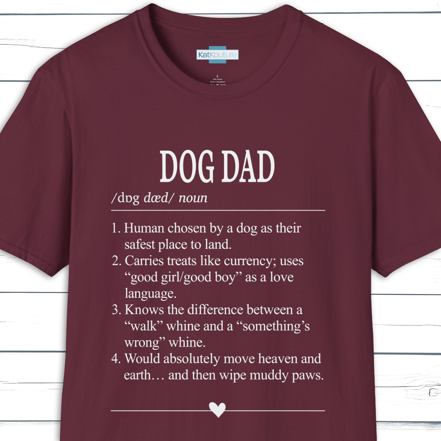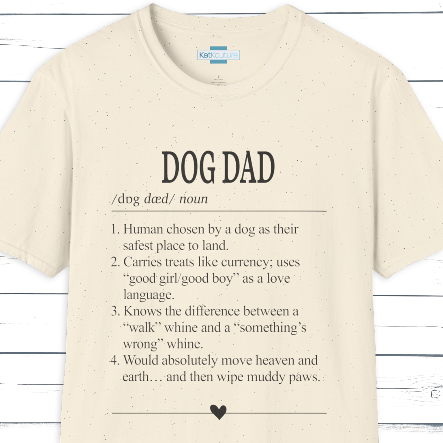Dog dads get it. This minimalist dictionary-style tee is a clean, clever nod to the everyday chaos and love that comes with being chosen by a dog. Featuring a neat “Dog Dad” heading, IPA pronunciation, and four relatable definitions, it’s the kind of design that looks smart up close and still reads bold from a distance.