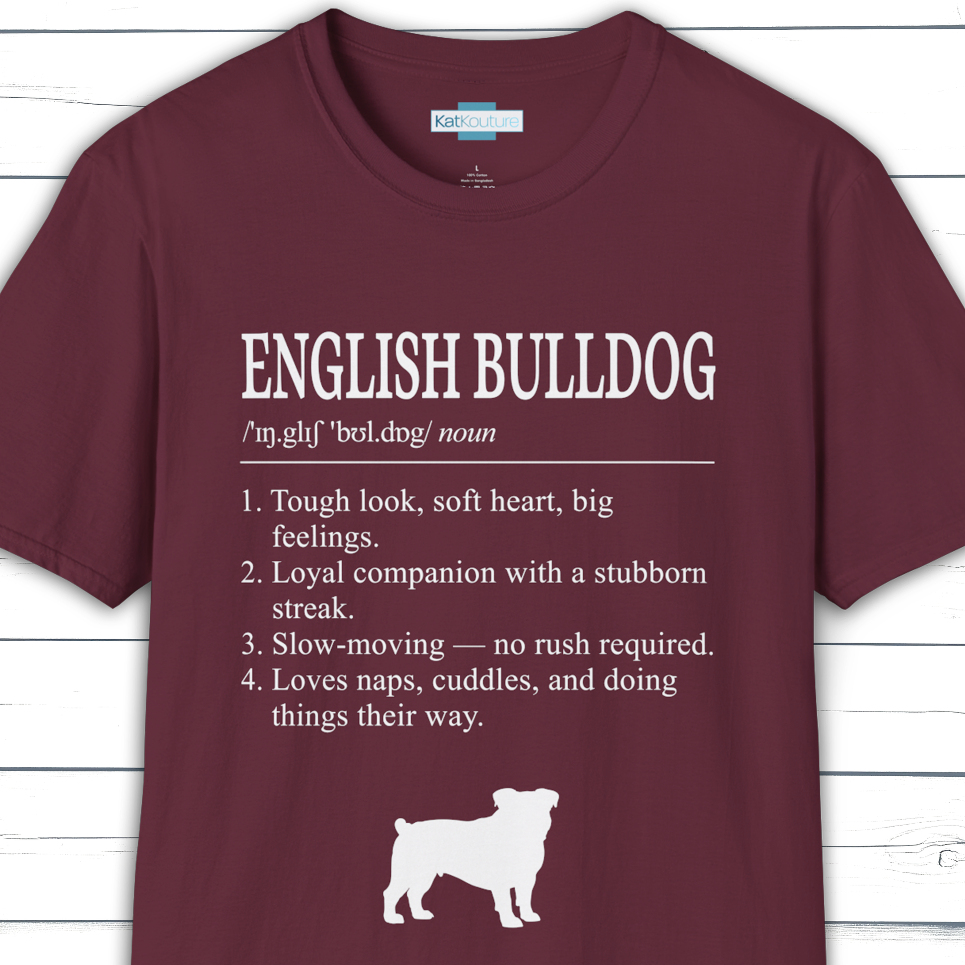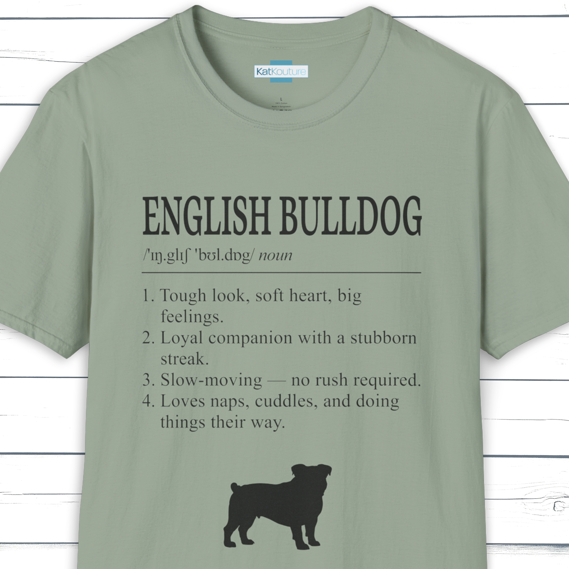 Part of KatKouture’s Dictionary Dogs Collection — a refined typographic design capturing the English Bulldog’s tough exterior and soft-hearted charm. Presented in a classic dictionary layout with pronunciation styling and four neatly observed traits.