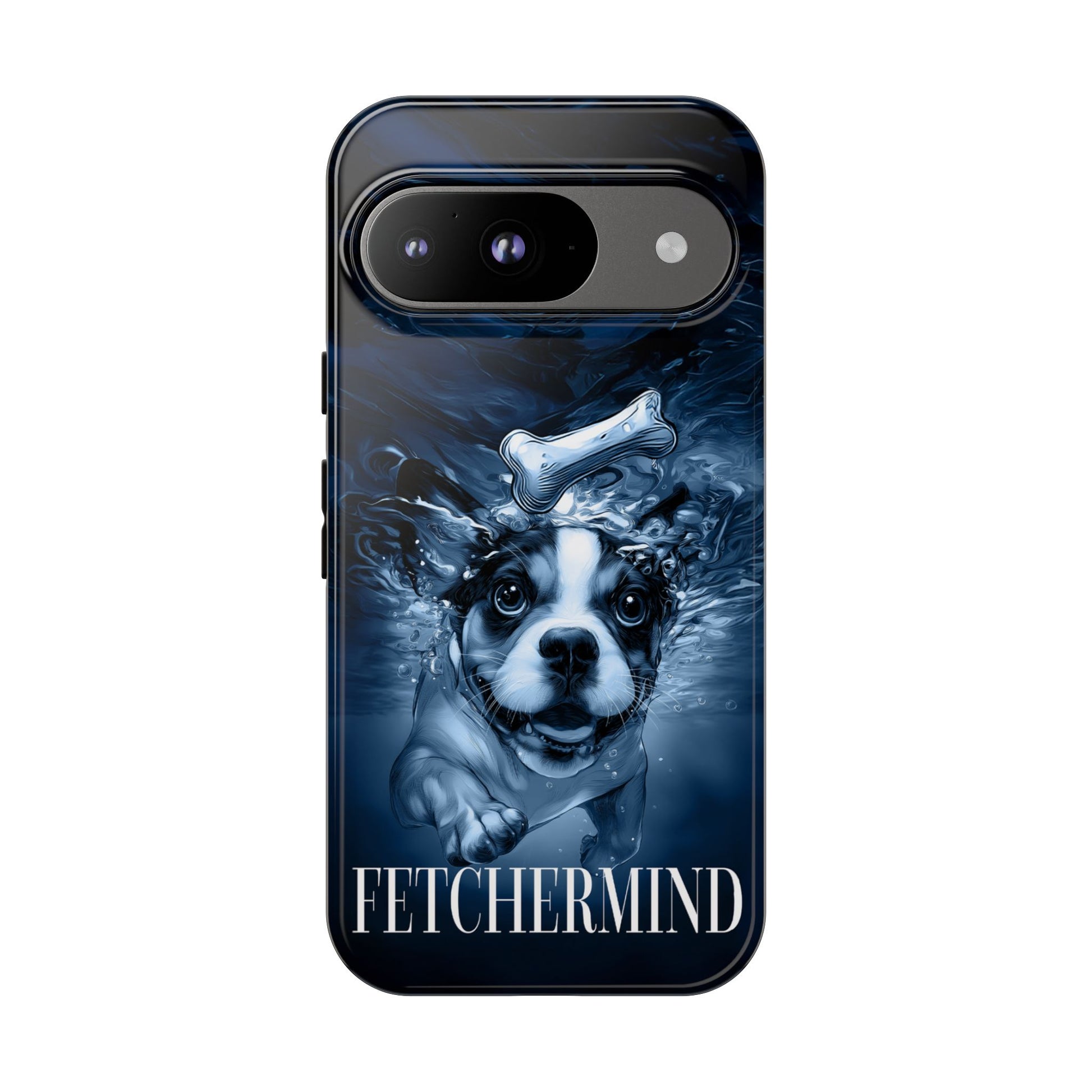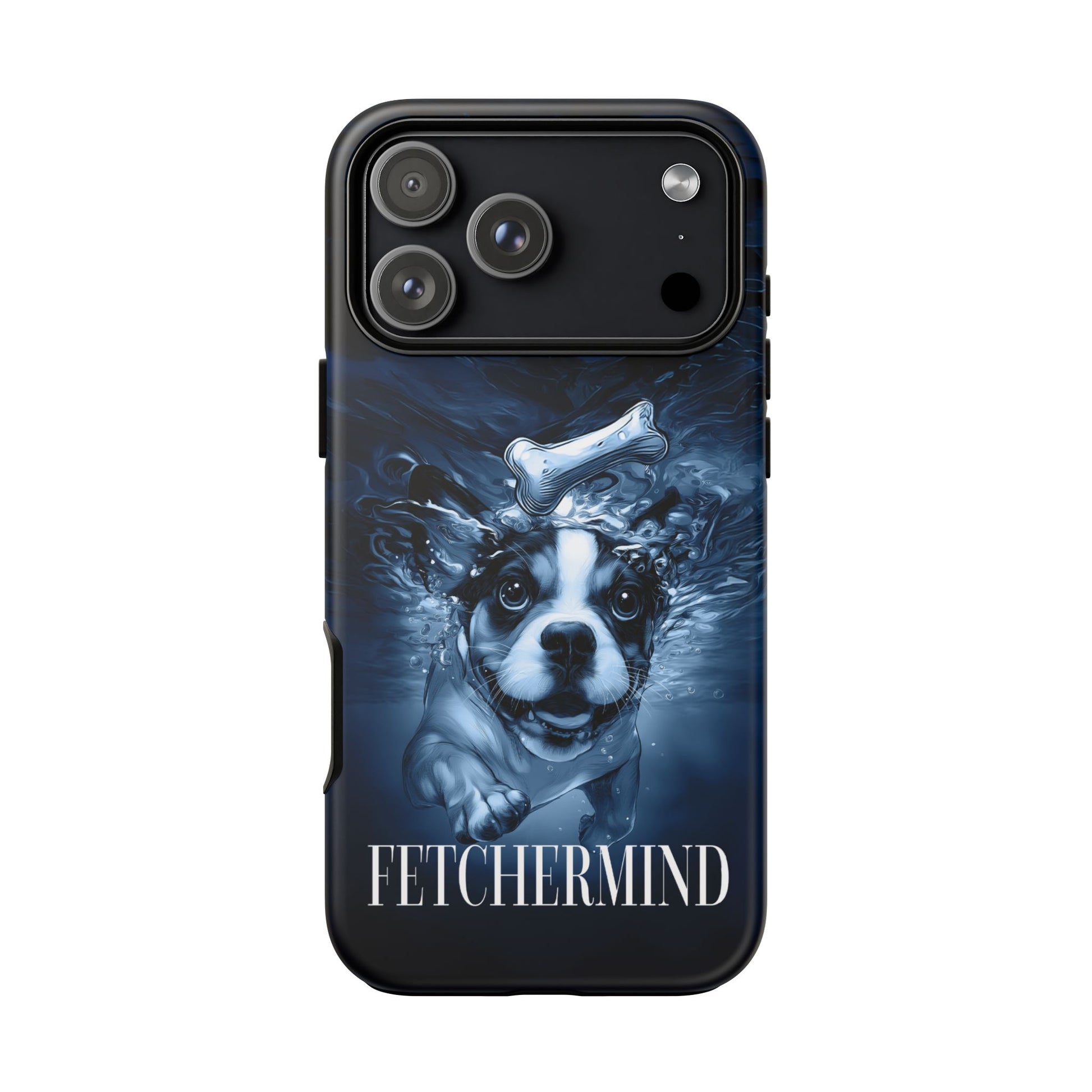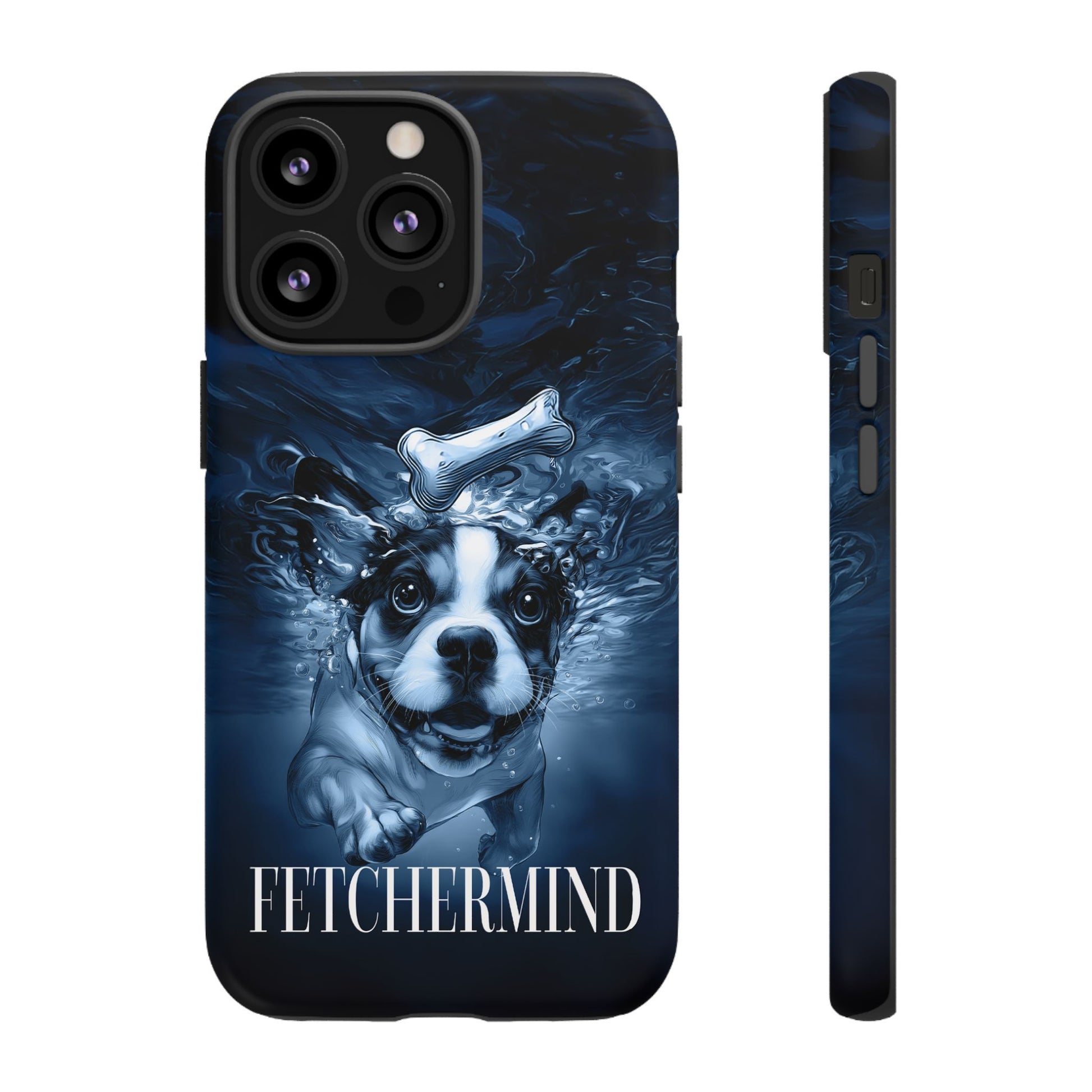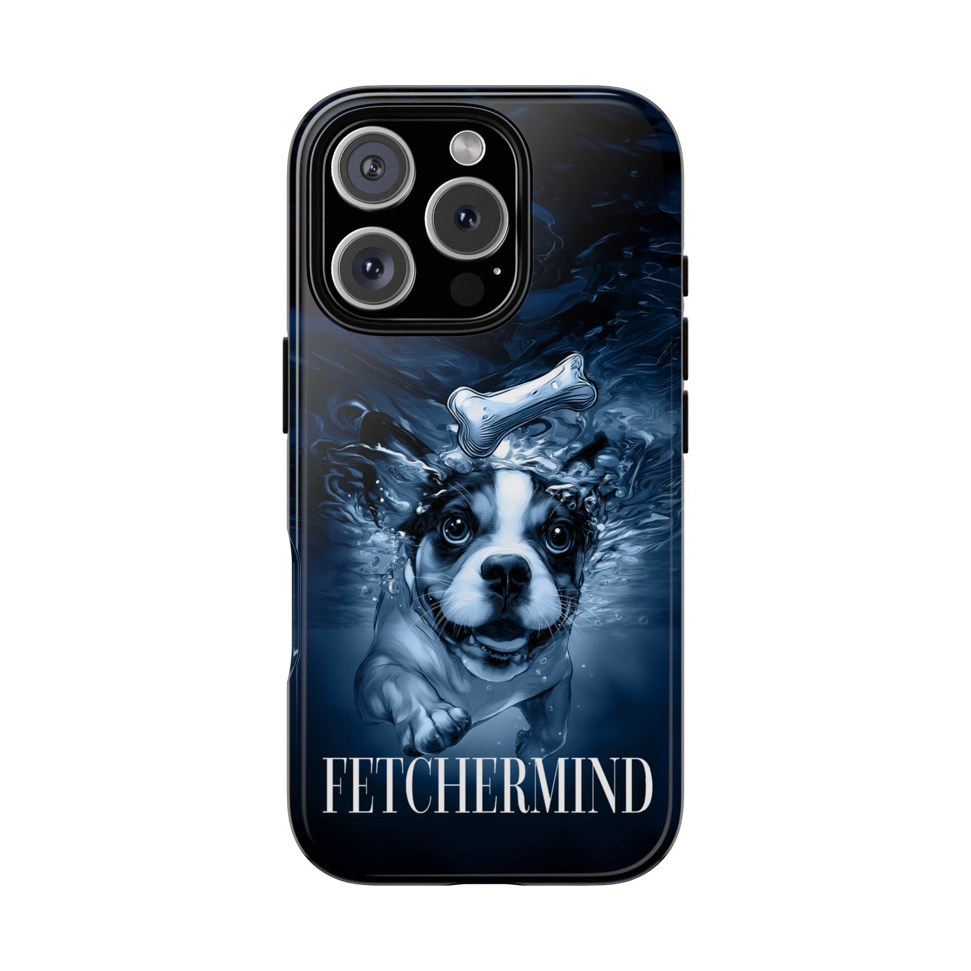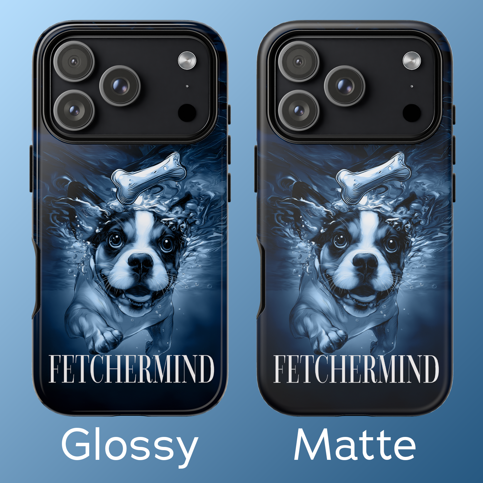 Dive into a bold, underwater parody inspired by Nirvana's Nevermind album art. Fetchingmind dog phone case. Featuring a dramatic deep-blue illustration of a pup swimming toward a floating bone, this design delivers instant attitude and album-art energy. Perfect for dog lovers who want something clever, striking, and totally unique.