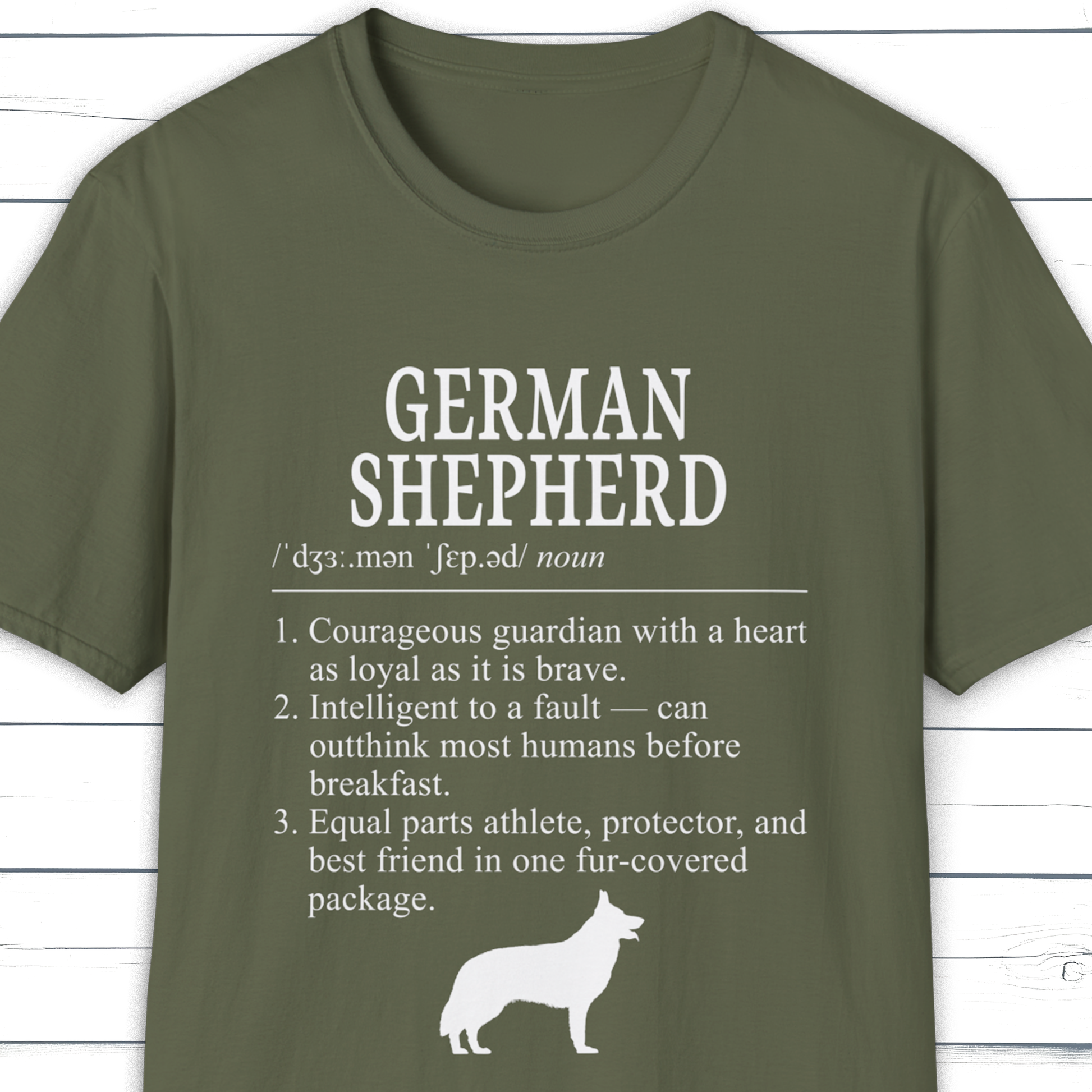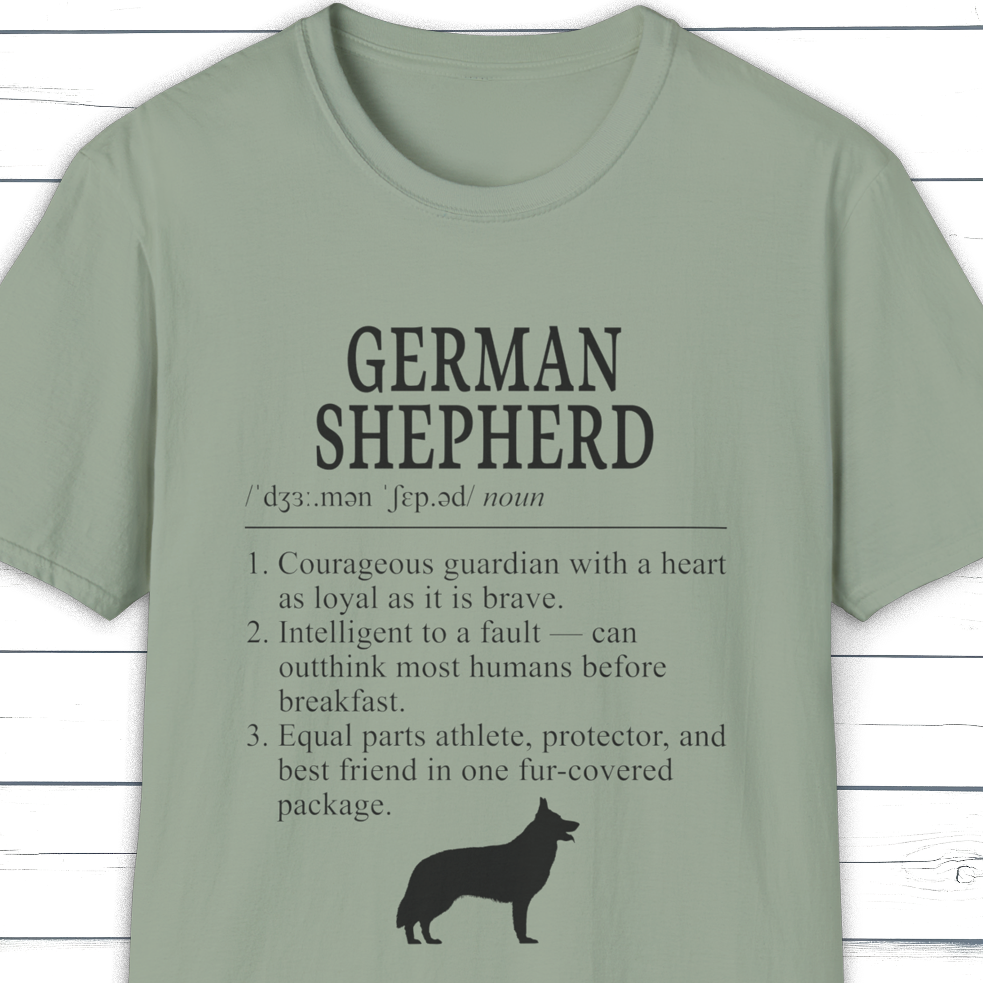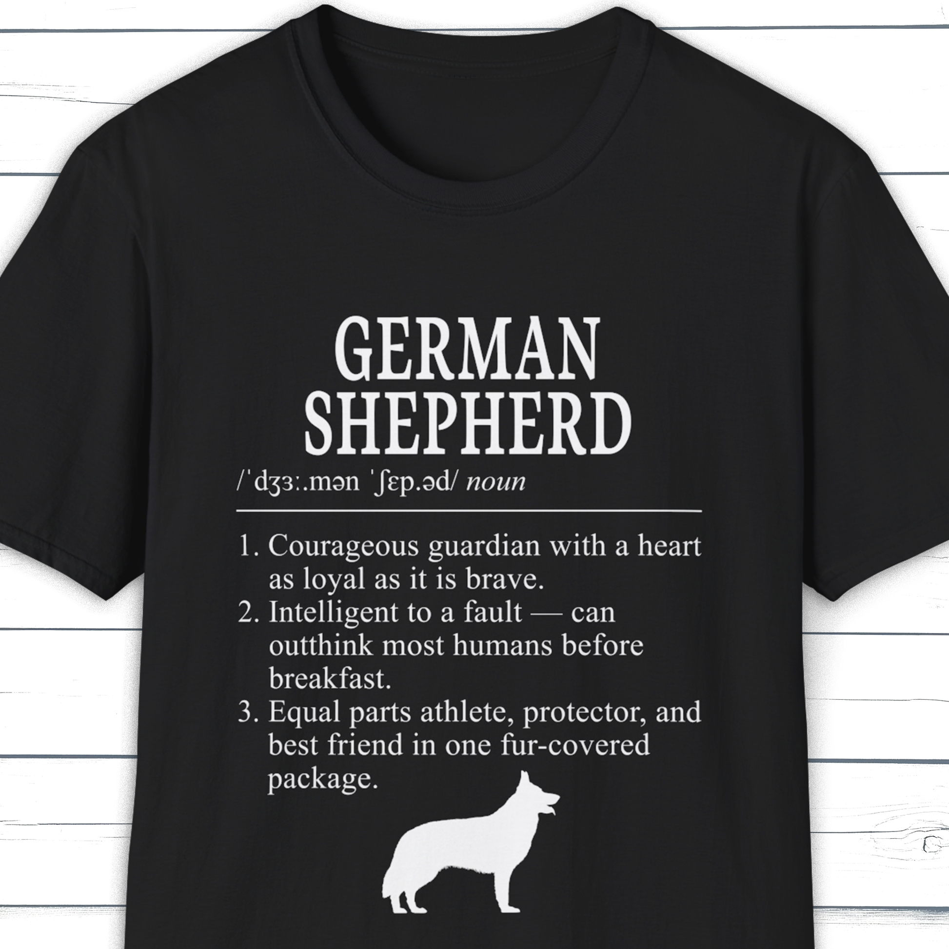 Celebrate the loyal heart and sharp mind of the German Shepherd with this minimalist definition-style tee. A clean typography design from the Dictionary Dogs Collection, capturing the breed’s courage, intelligence, and devotion.