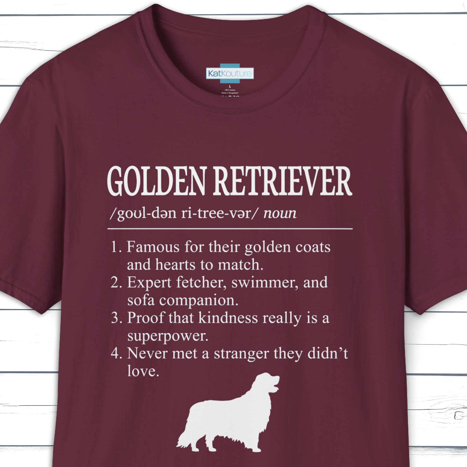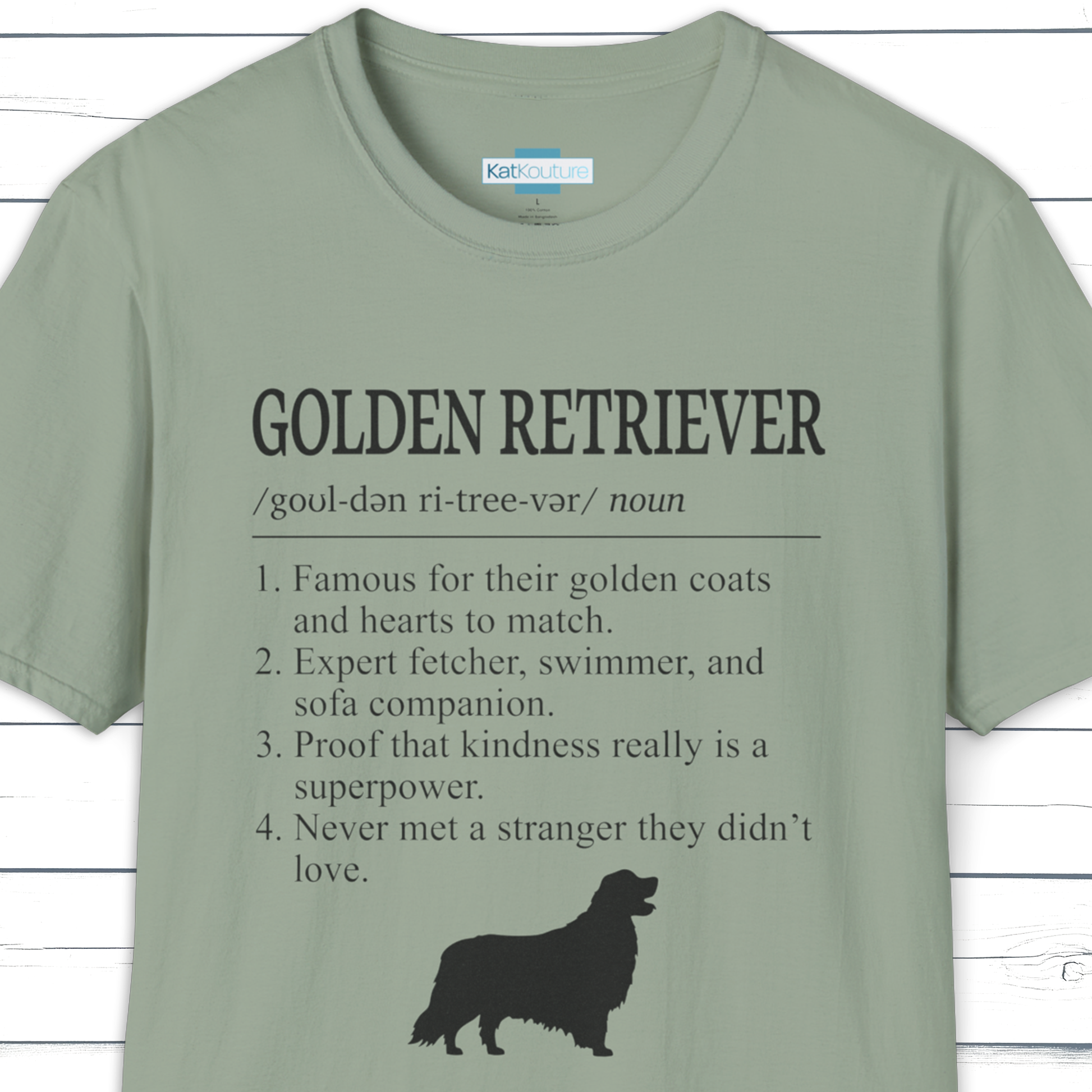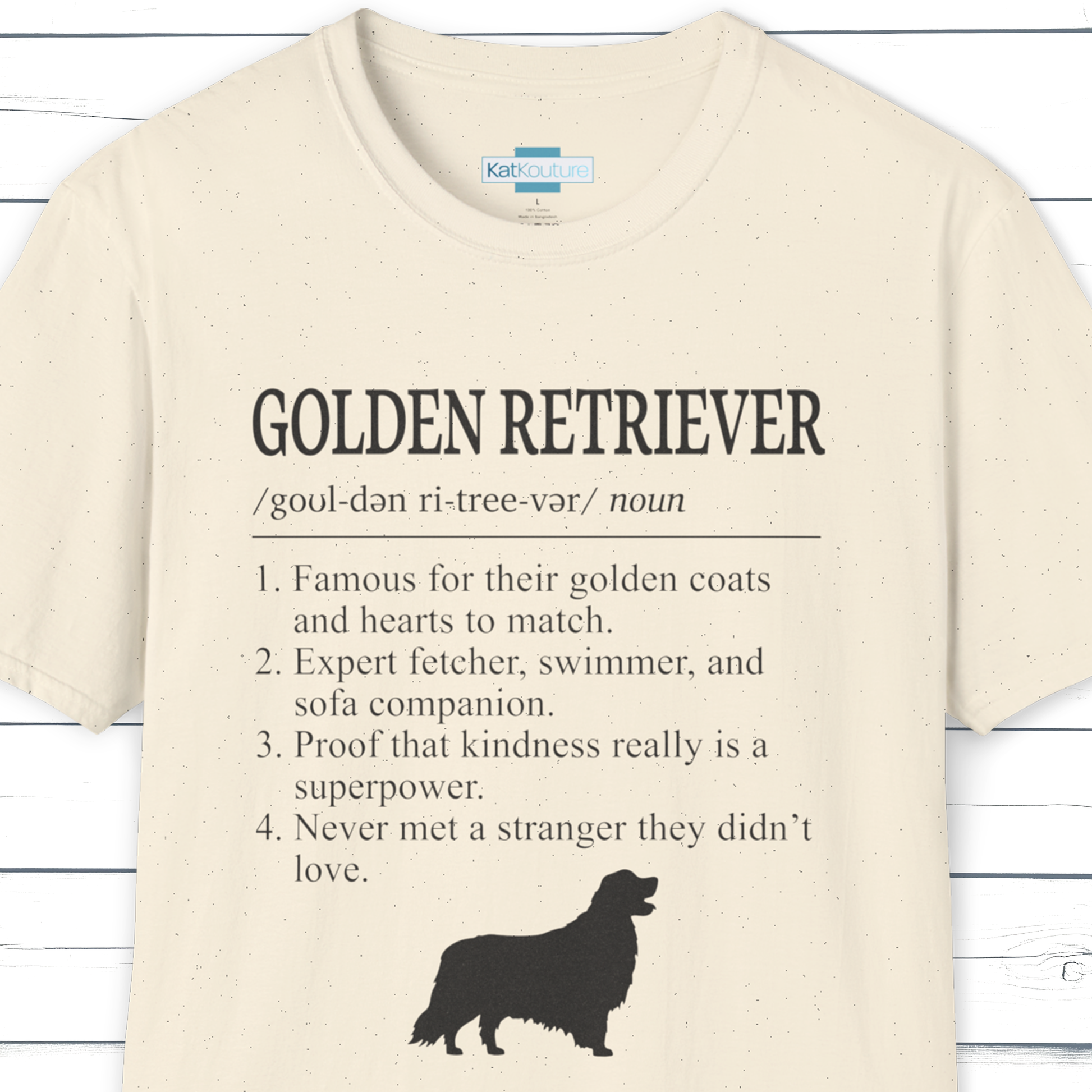 Part of KatKouture’s Dictionary Dogs Collection, this Golden Retriever definition T-shirt captures the breed’s gentle loyalty, sunny optimism, and endlessly lovable nature in a clean, minimalist dictionary-style design. Featuring classic typography, IPA pronunciation, and 4 thoughtfully written traits, it blends timeless Retriever charm with a subtle, feel-good wink of humour.