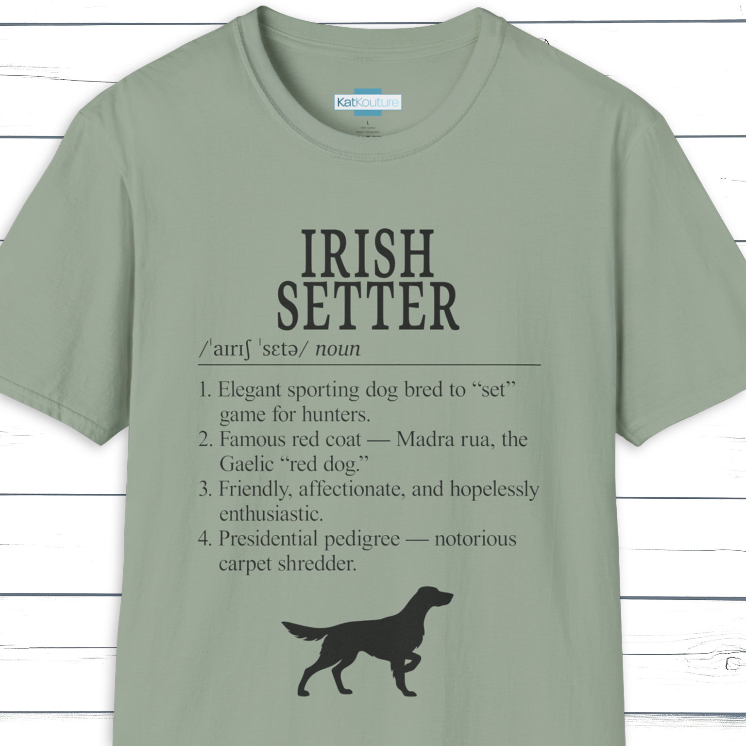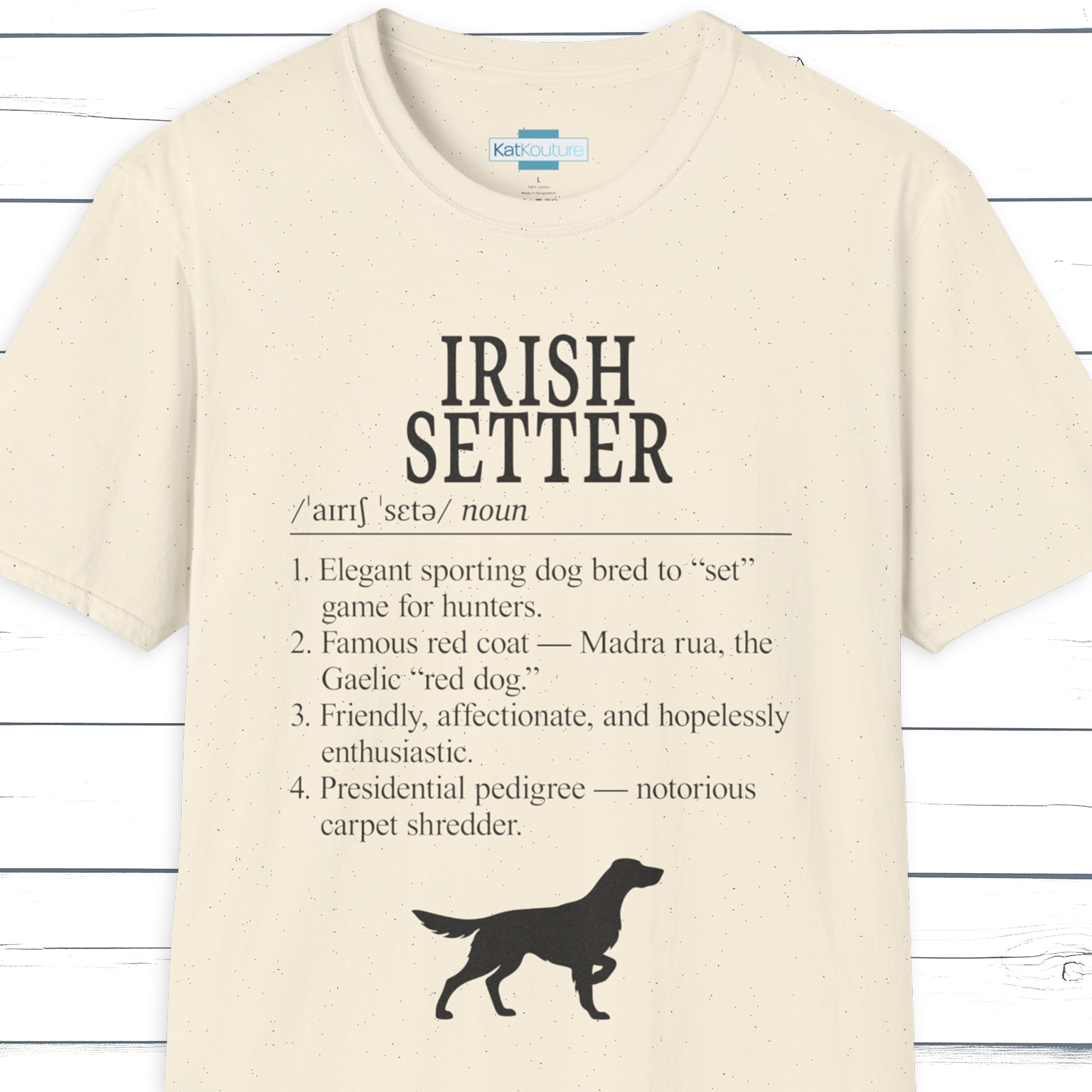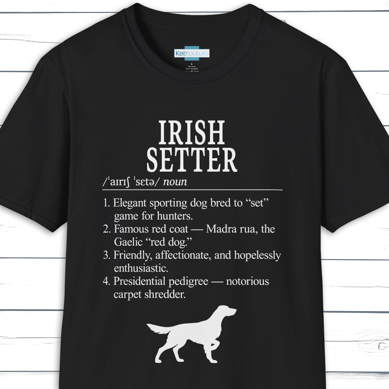 Part of KatKouture’s Dictionary Dogs Collection, this Irish Setter definition T-shirt celebrates the breed’s elegant sporting heritage, joyful spirit, and famously affectionate nature in a clean, minimalist dictionary-style design. Featuring classic typography, IPA pronunciation, and four thoughtfully written traits, it blends real Irish Setter history with a playful touch of wit.