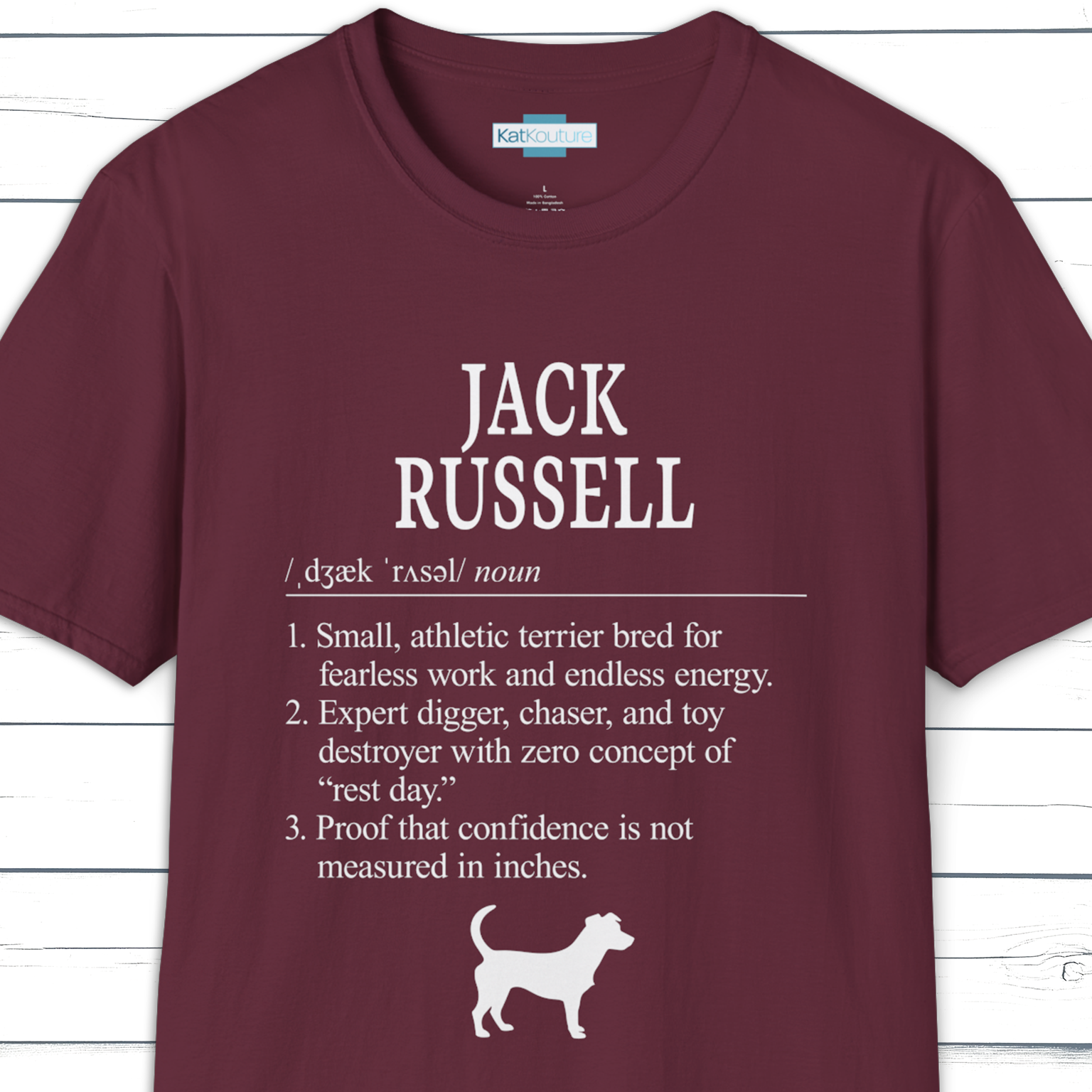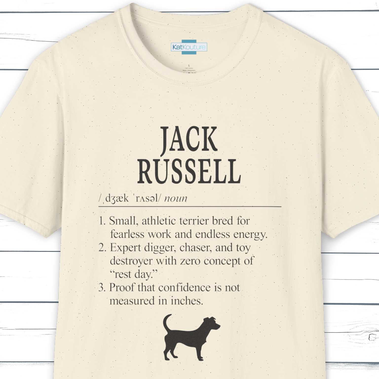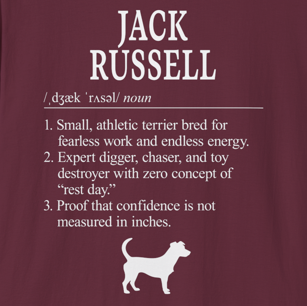 Part of KatKouture’s Dictionary Dogs Collection, this Jack Russell definition T-shirt captures the breed’s fearless energy, sharp intelligence, and big-dog confidence in a clean, minimalist dictionary-style design. Featuring classic typography, IPA pronunciation, and three thoughtfully written traits, it blends real terrier personality with a subtle wink of wit.