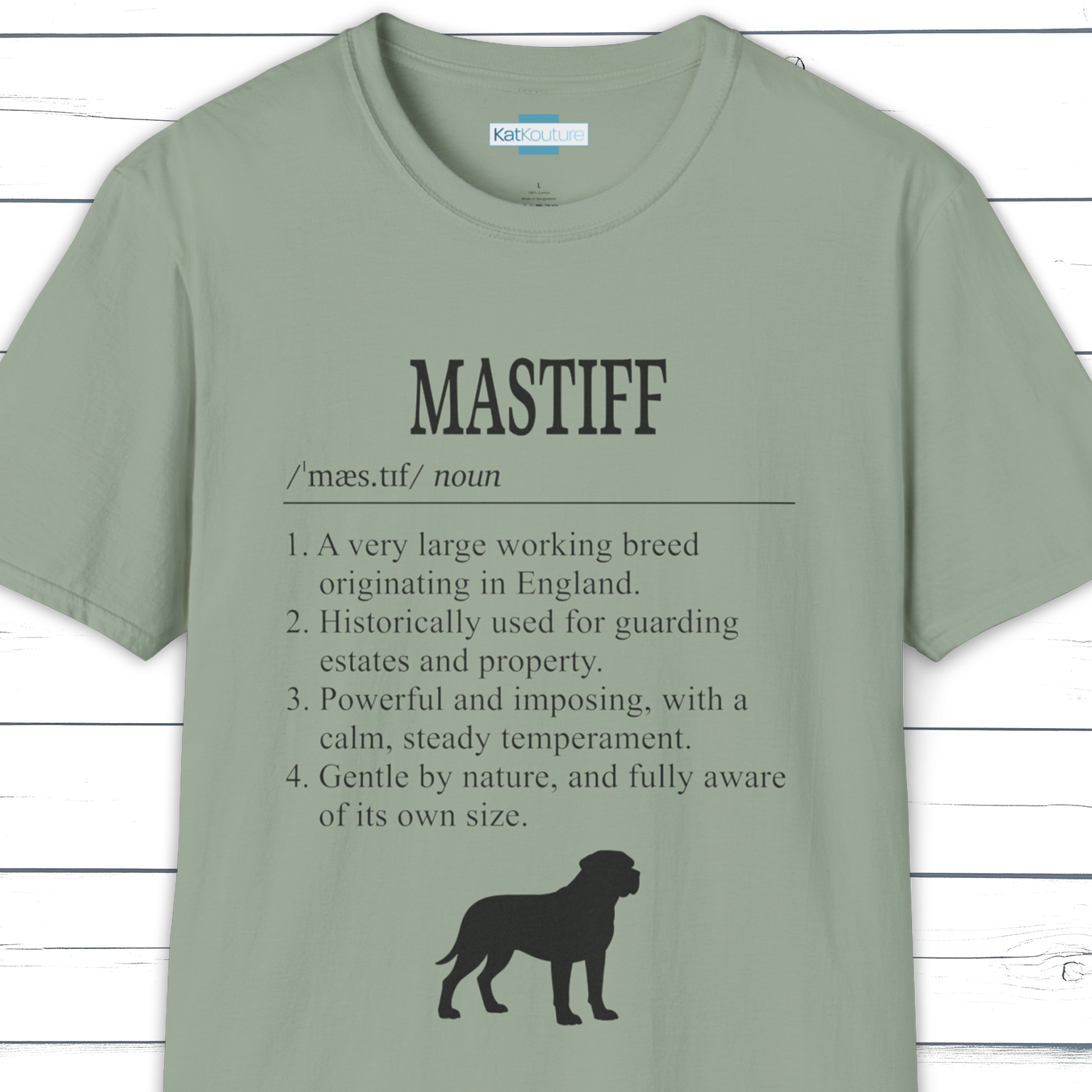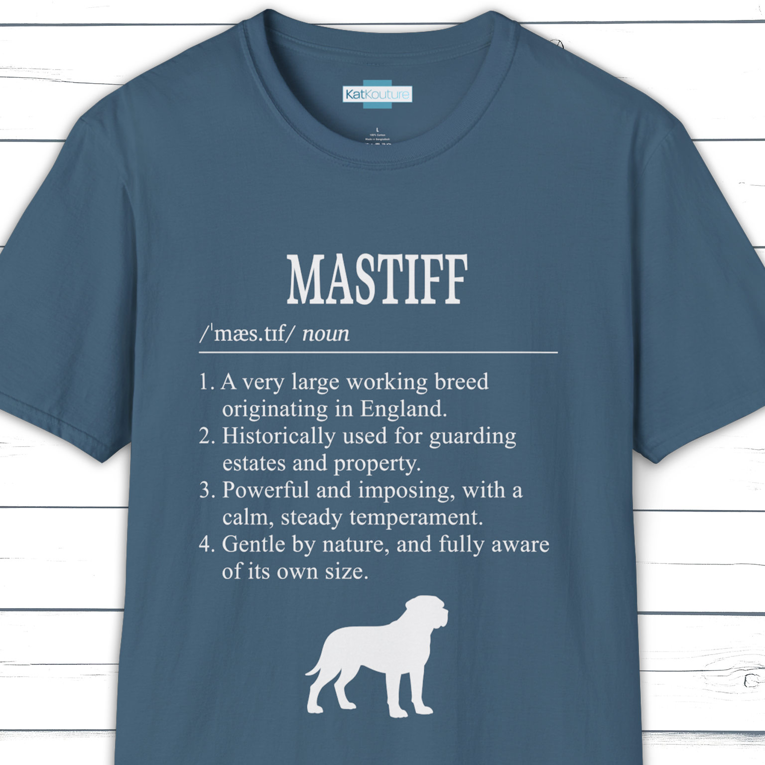 Part of KatKouture’s Dictionary Dogs Collection, this Mastiff definition T-shirt celebrates a powerful English giant with a calm, steady nature. Designed in a clean, dictionary-style layout with classic typography, IPA pronunciation, and four carefully written facts, it combines real breed history with a subtle, understated wink.
