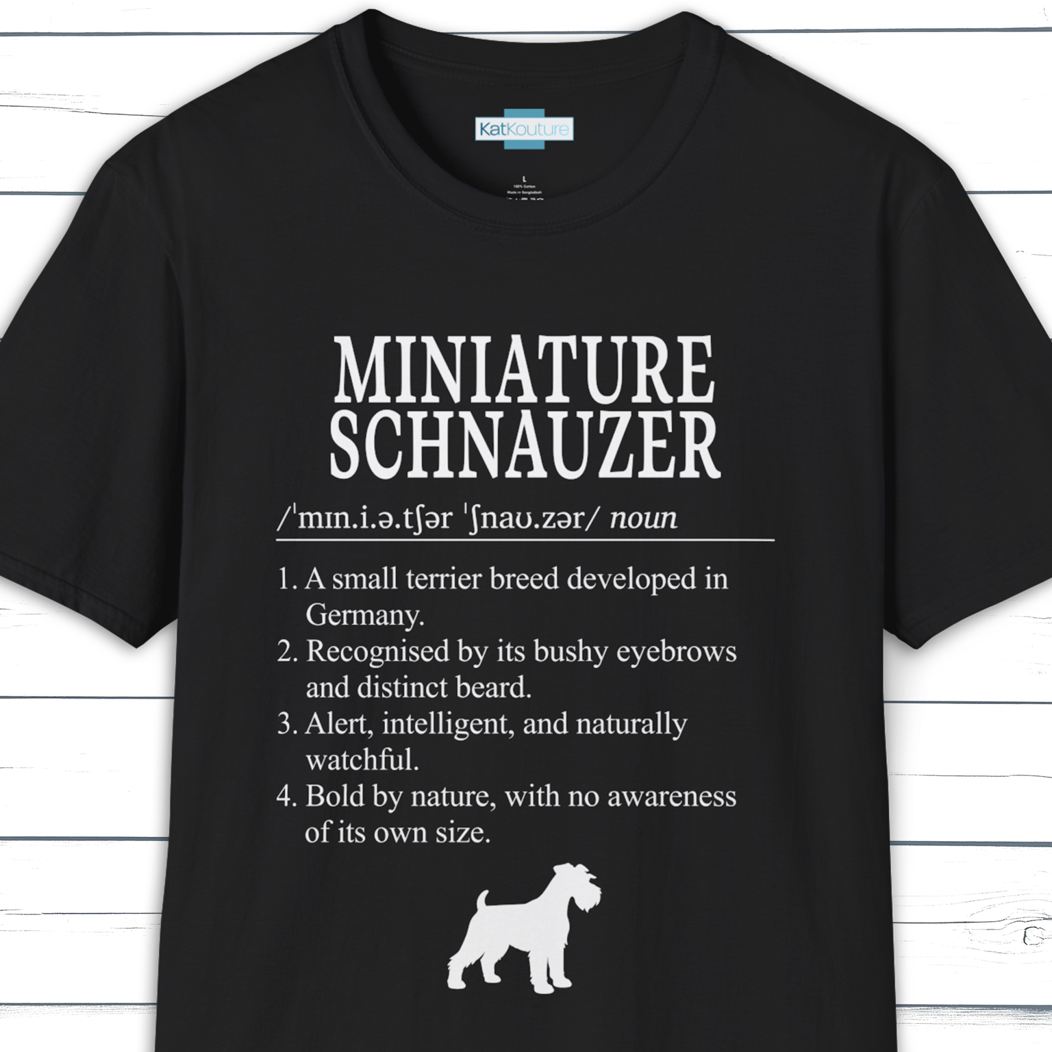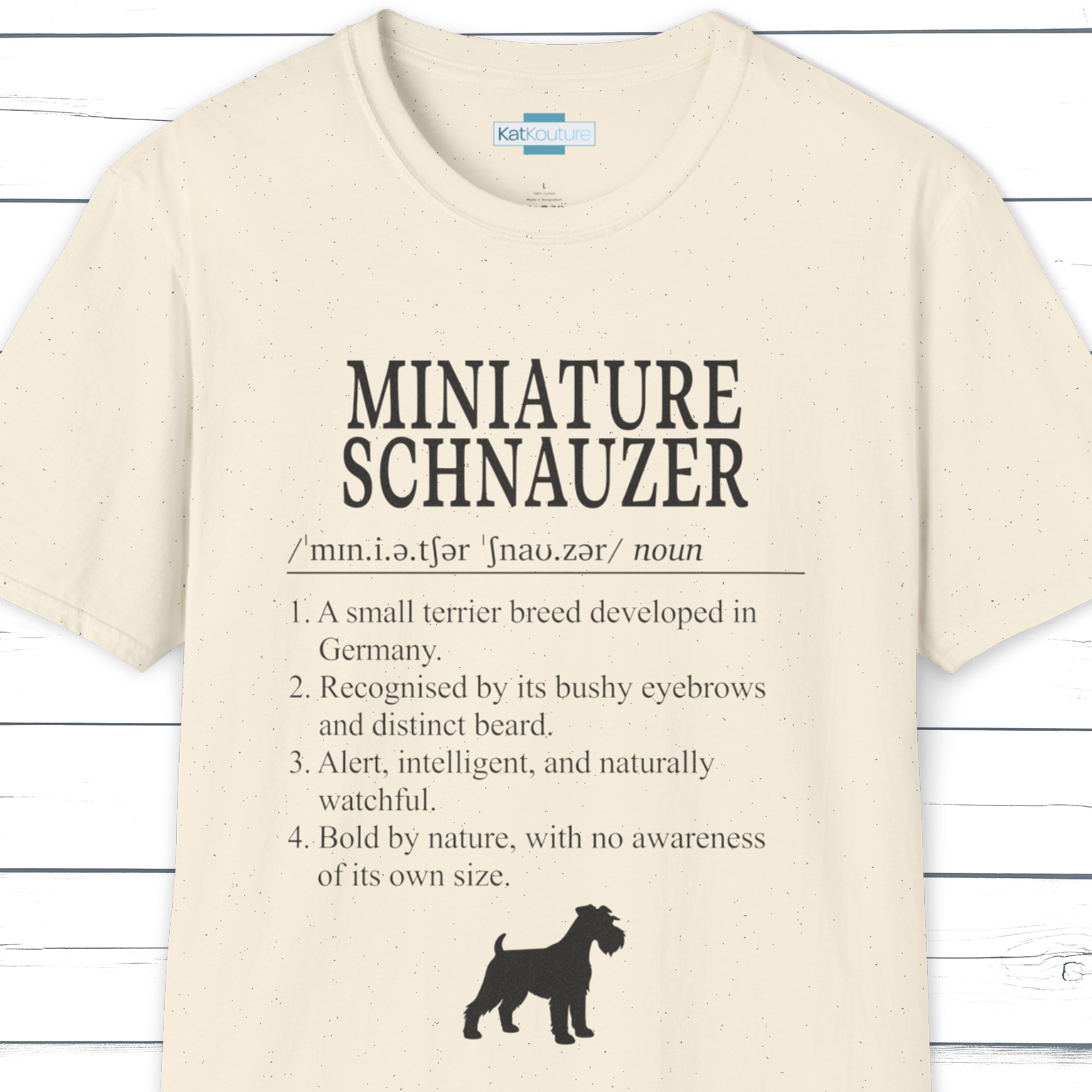 Part of KatKouture’s Dictionary Dogs Collection, this Miniature Schnauzer definition T-shirt celebrates a bold little breed with unmistakable eyebrows and a serious beard. Designed in a clean, dictionary-style layout with classic typography, IPA pronunciation, and four carefully written facts, it blends real breed character with a subtle wink of humour.