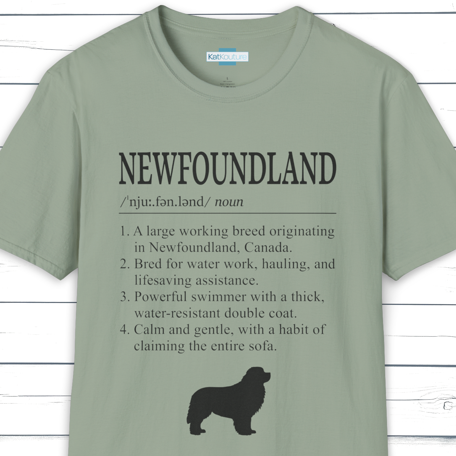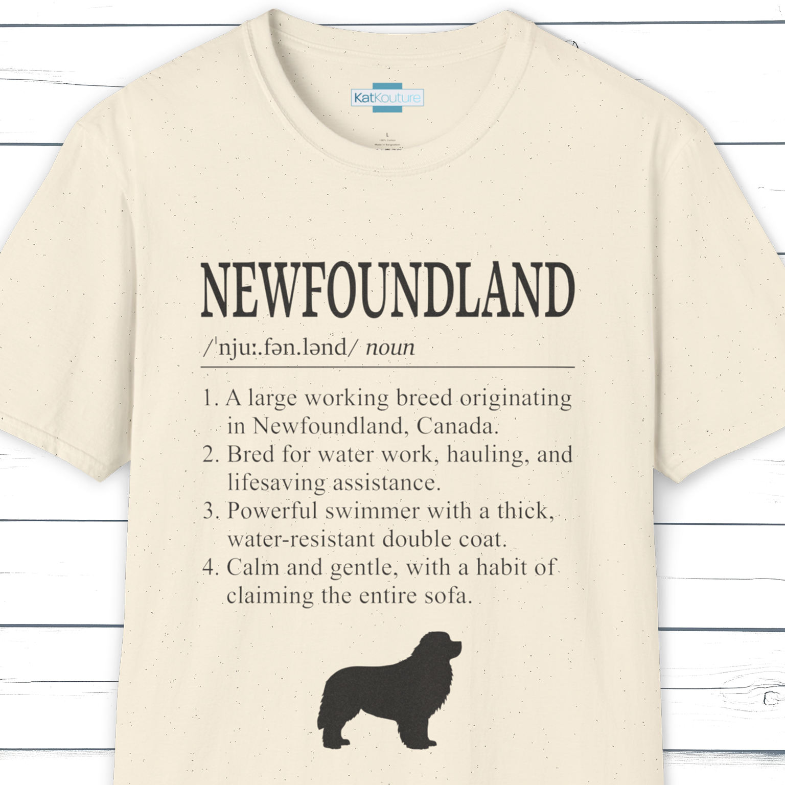 Part of KatKouture’s Dictionary Dogs Collection, this Newfoundland definition T-shirt celebrates one of the gentlest giants in the dog world. Designed in a clean, dictionary-style layout with classic typography, IPA pronunciation, and four carefully written facts, it combines true breed history with a warm touch of understated humour.
