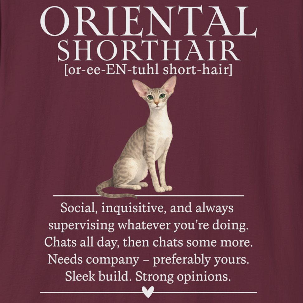 This Oriental Shorthair Definition T-Shirt is part of the Cat Chronicles collection, celebrating the breed’s unmistakable presence and expressive personality. Featuring a refined illustrated portrait and clean, timeless typography, this design captures the Oriental Shorthair’s social nature, sharp intelligence, and constant need to be involved. Made for people who live with a cat that doesn’t just observe life — it actively participates in it.