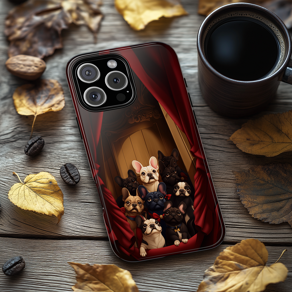 Adorable French Bulldog phone case featuring a group of dogs on stage at the theatre, each with their own unique expressions. This fun and stylish phone case is perfect for dog lovers and theatre enthusiasts. Ideal for adding a touch of personality to your phone during holidays, celebrations, and everyday life.