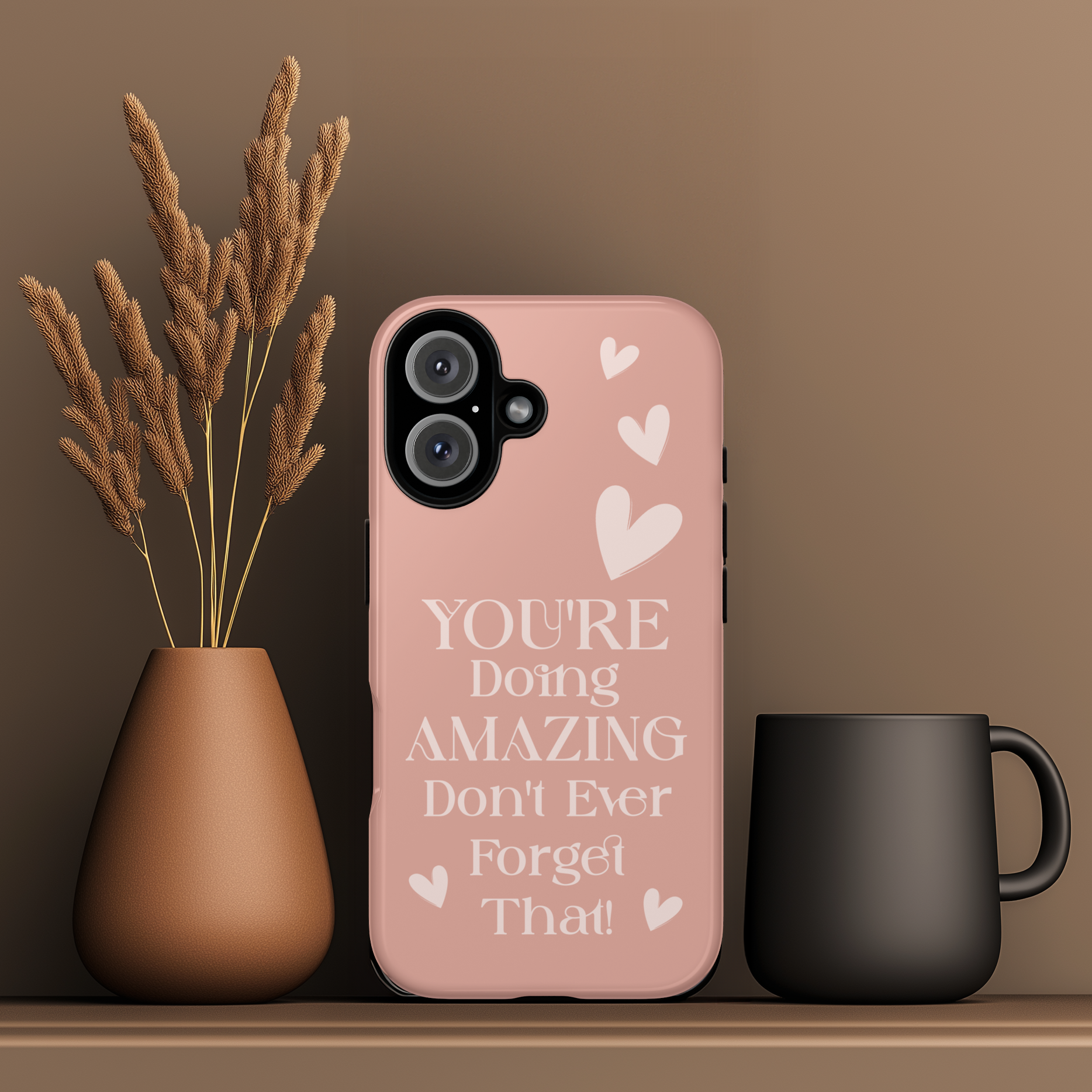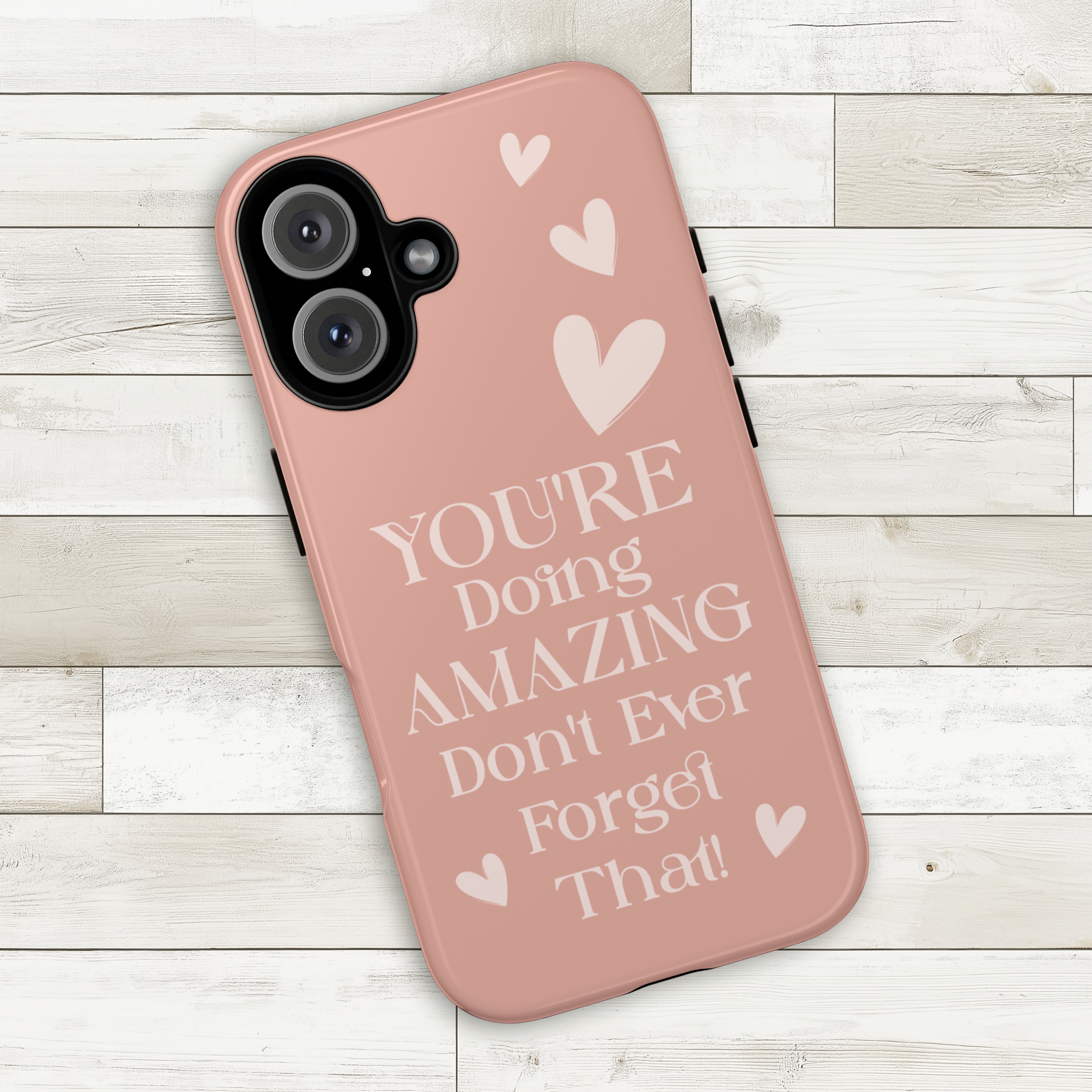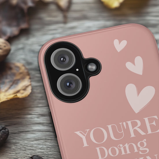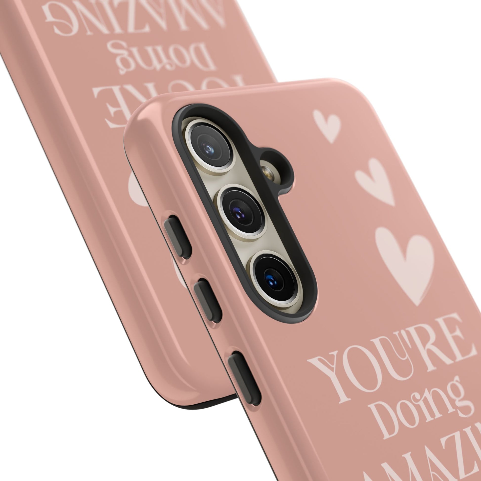 This phone case features an uplifting message on a soft pink background, with scattered light pink heart graphics for added warmth and encouragement. The design is motivational and sweet, perfect for anyone needing a little positivity throughout the day. Ideal for those looking to carry a reminder of their amazingness wherever they go.