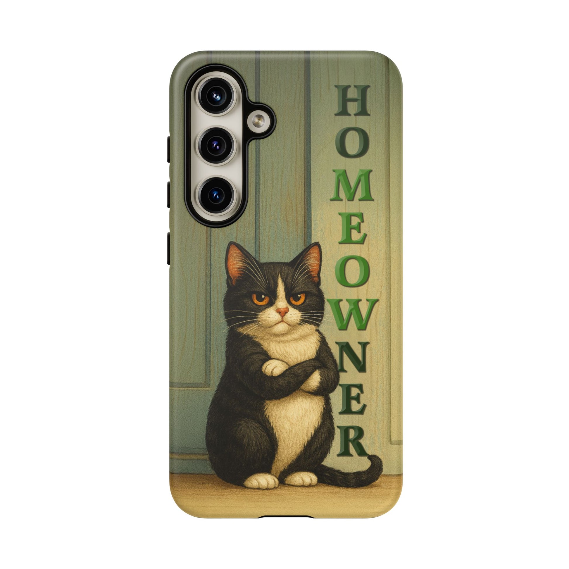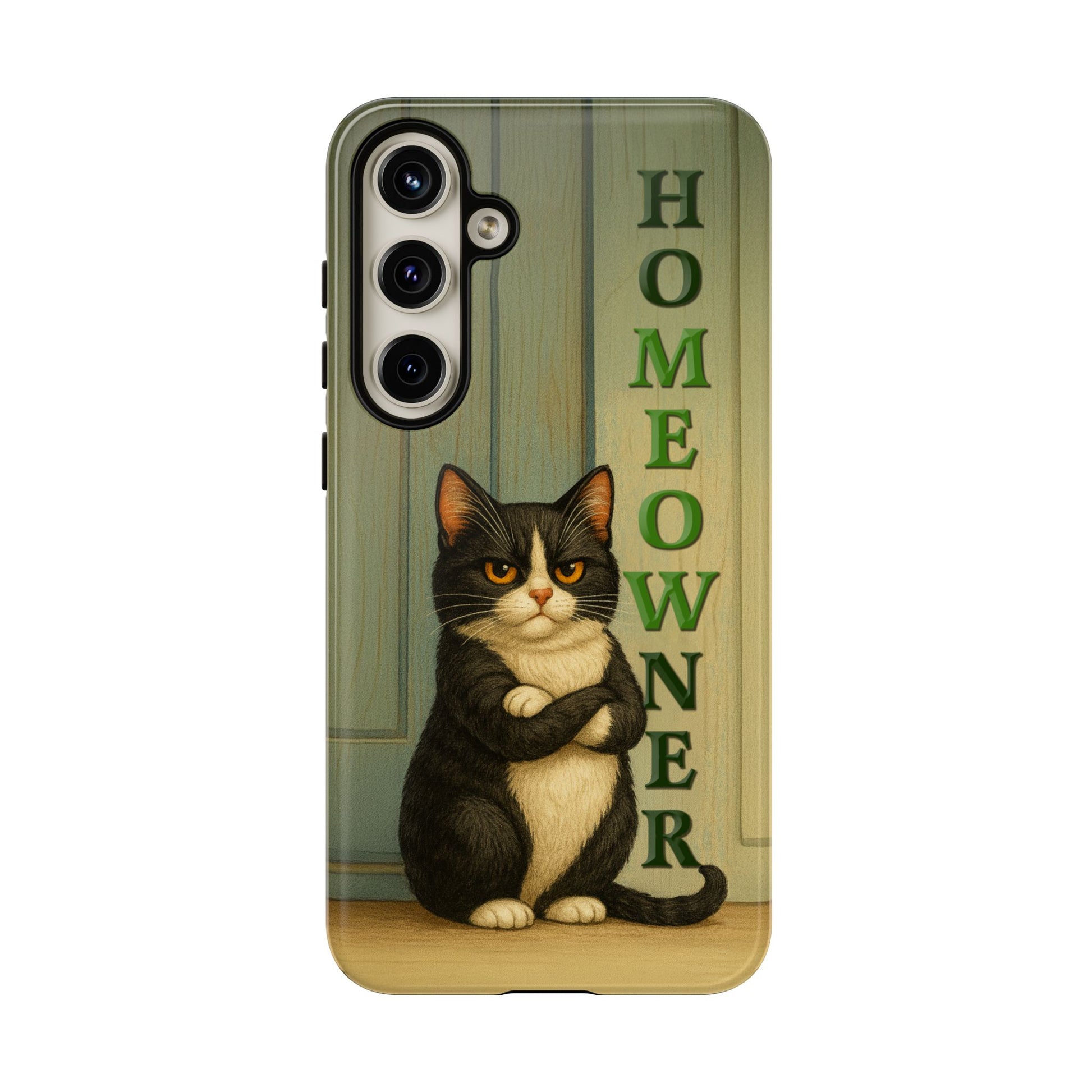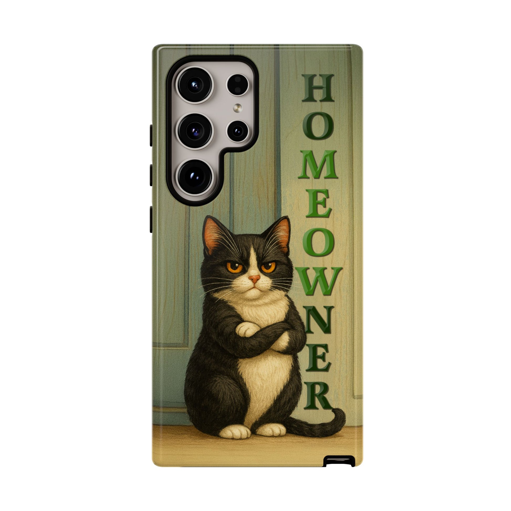 Meet the real boss of the house. This hilarious phone case features a proud, grumpy black-and-white tuxedo cat standing with crossed arms in front of a door, alongside the bold text "HOMEOWNER" (with a cheeky "MEOW" hidden inside). Perfect for cat lovers with attitude, this design blends sarcasm, style, and feline flair.
