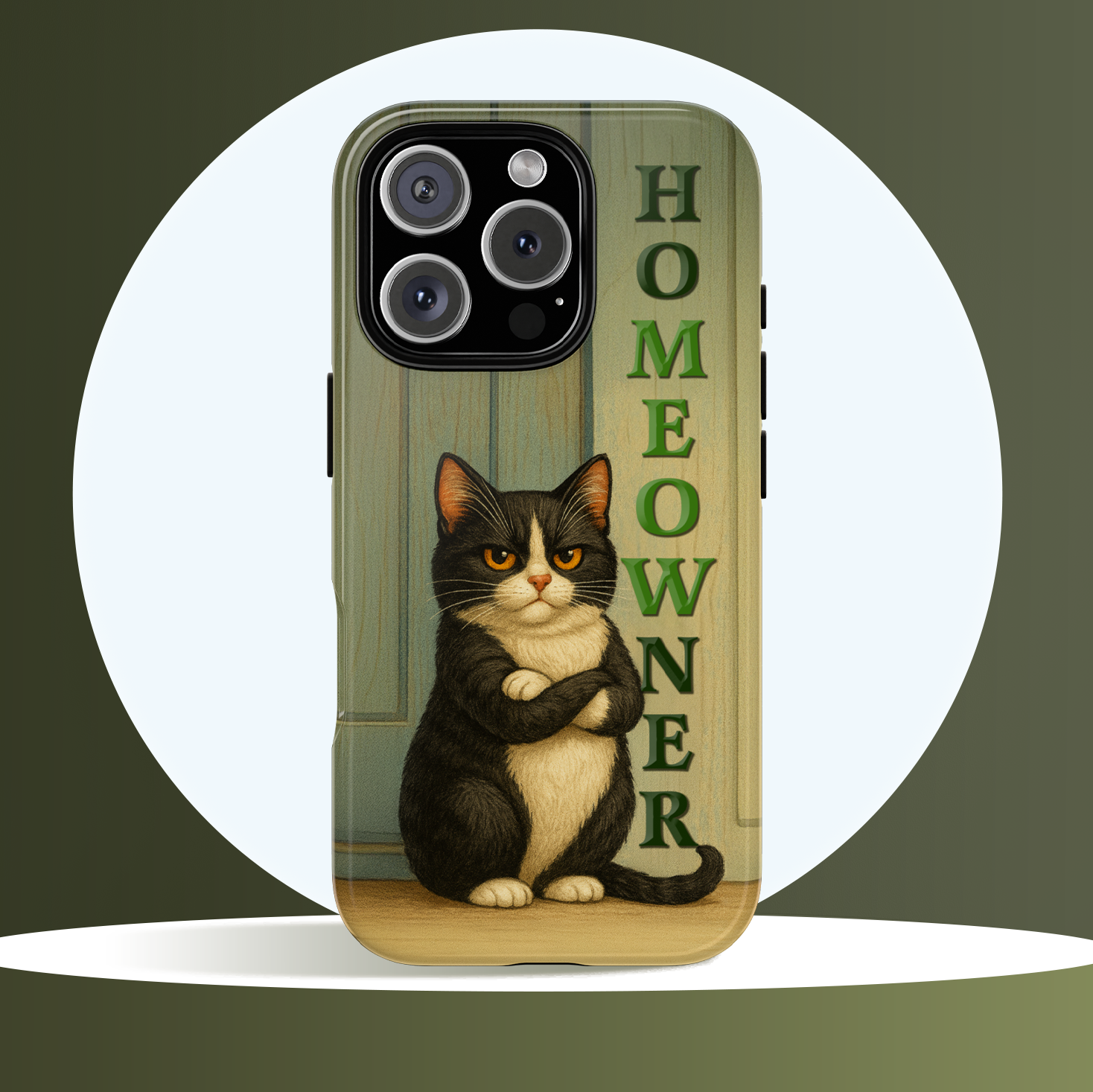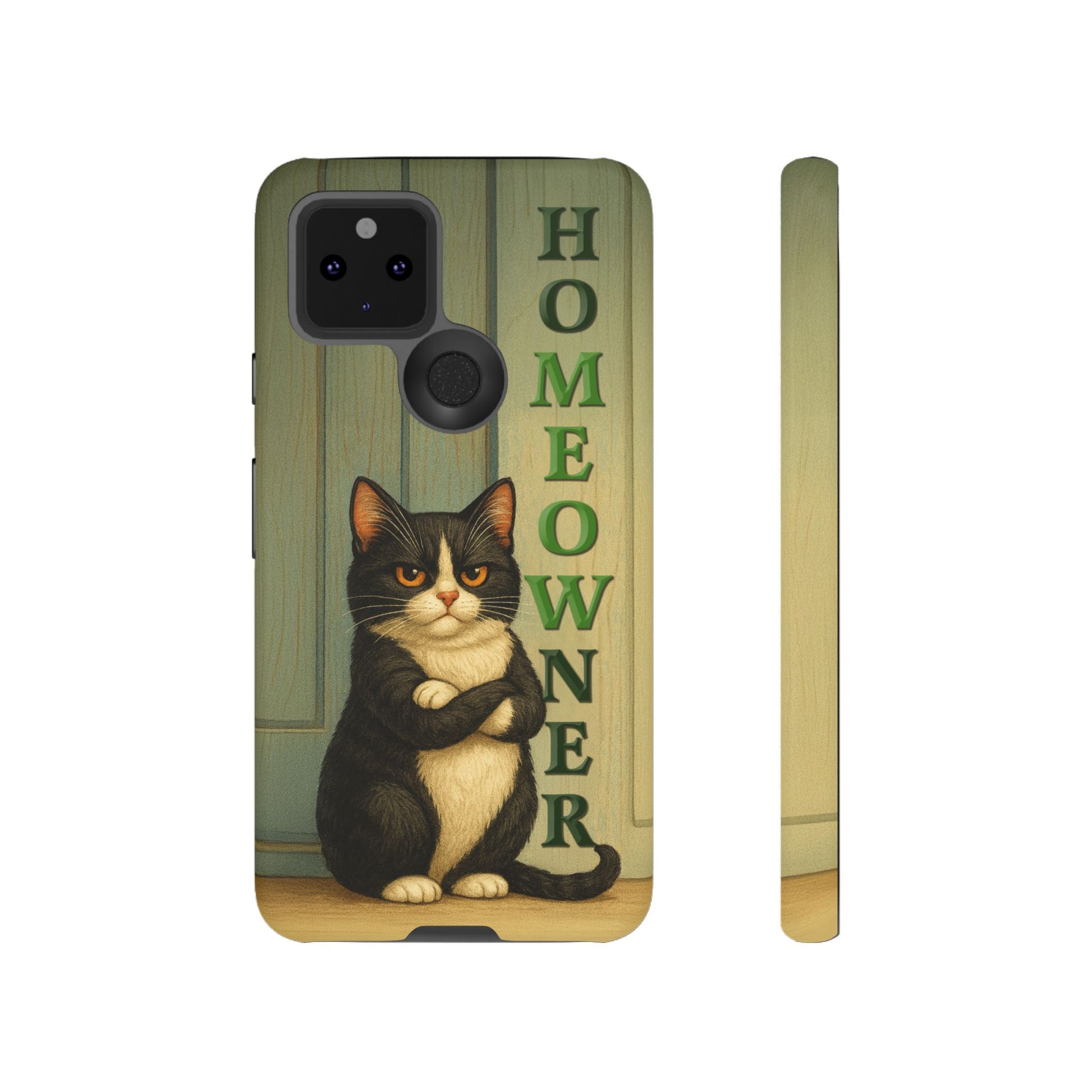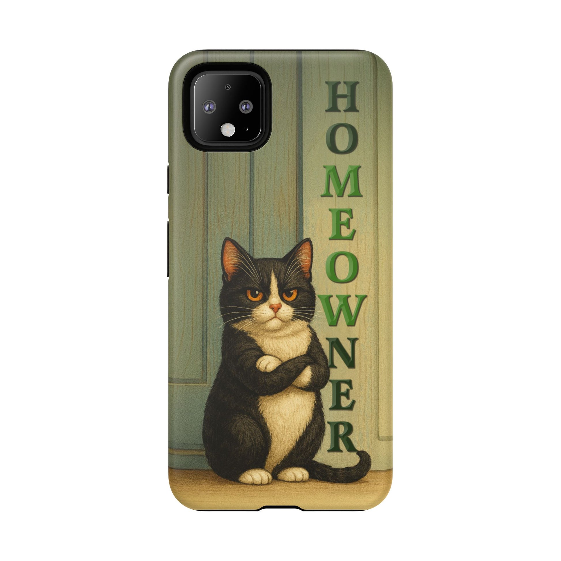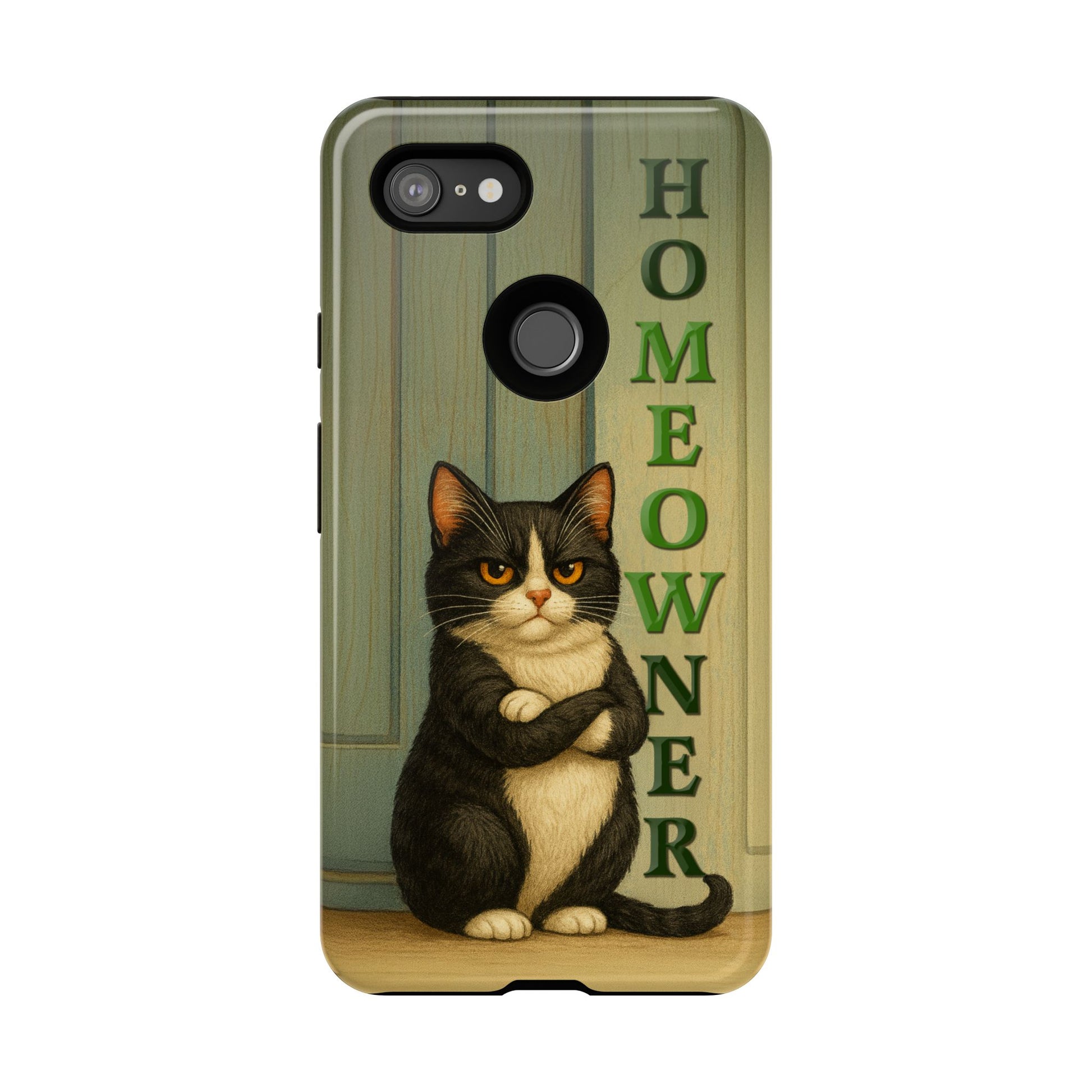 Meet the real boss of the house. This hilarious phone case features a proud, grumpy black-and-white tuxedo cat standing with crossed arms in front of a door, alongside the bold text "HOMEOWNER" (with a cheeky "MEOW" hidden inside). Perfect for cat lovers with attitude, this design blends sarcasm, style, and feline flair.