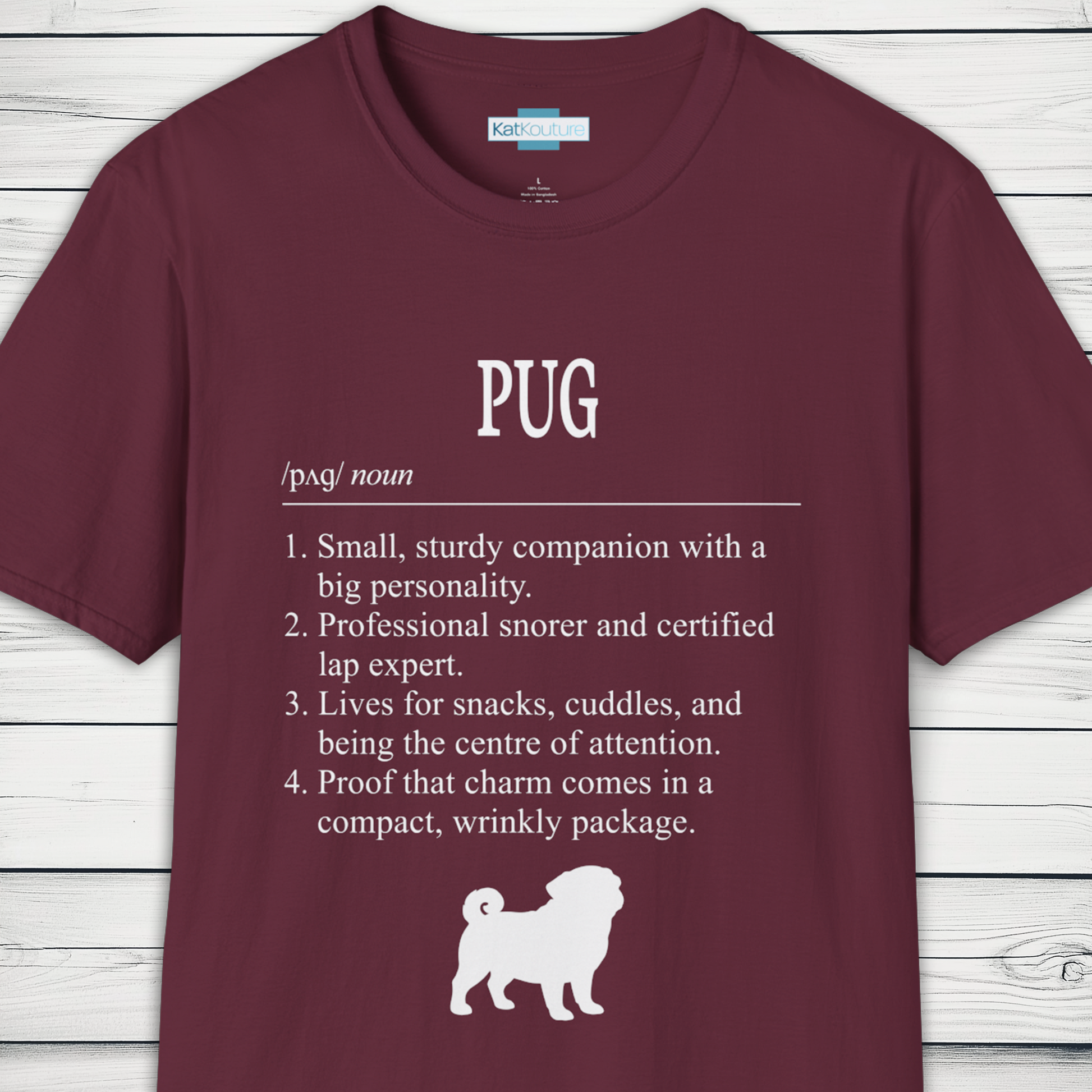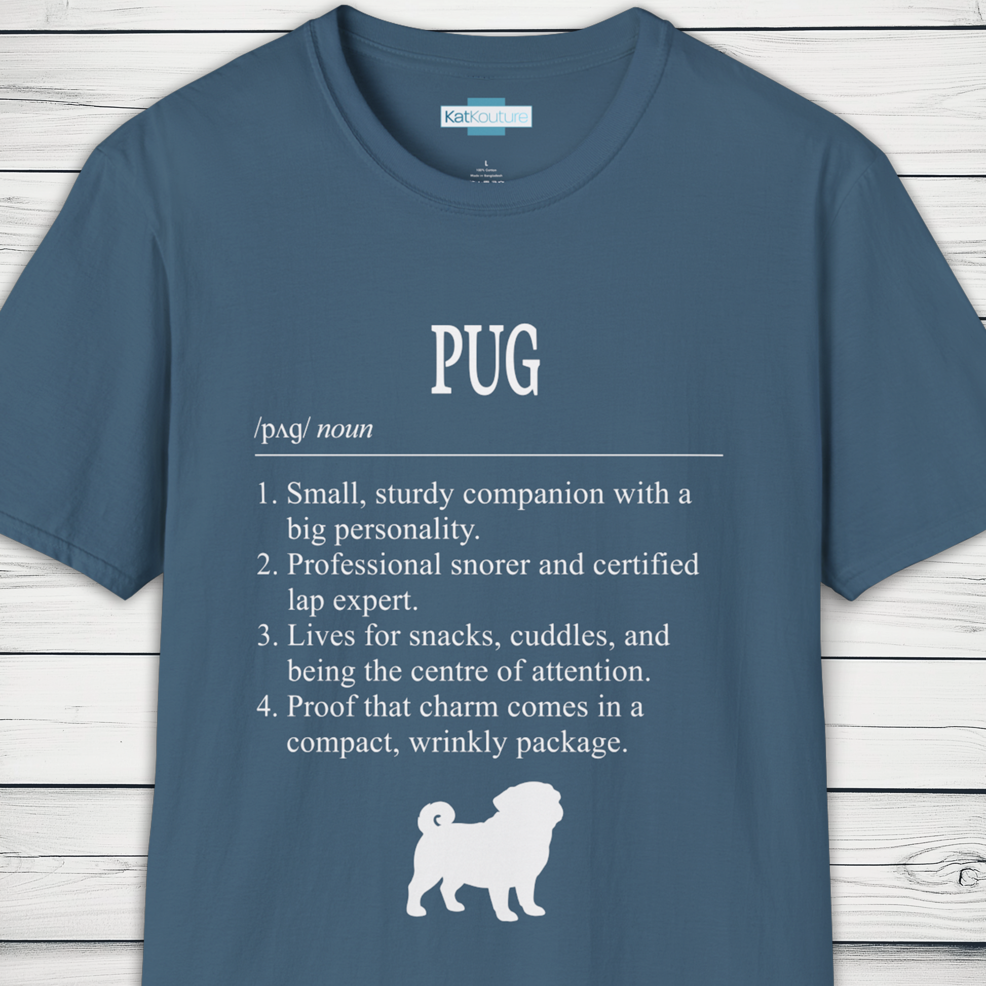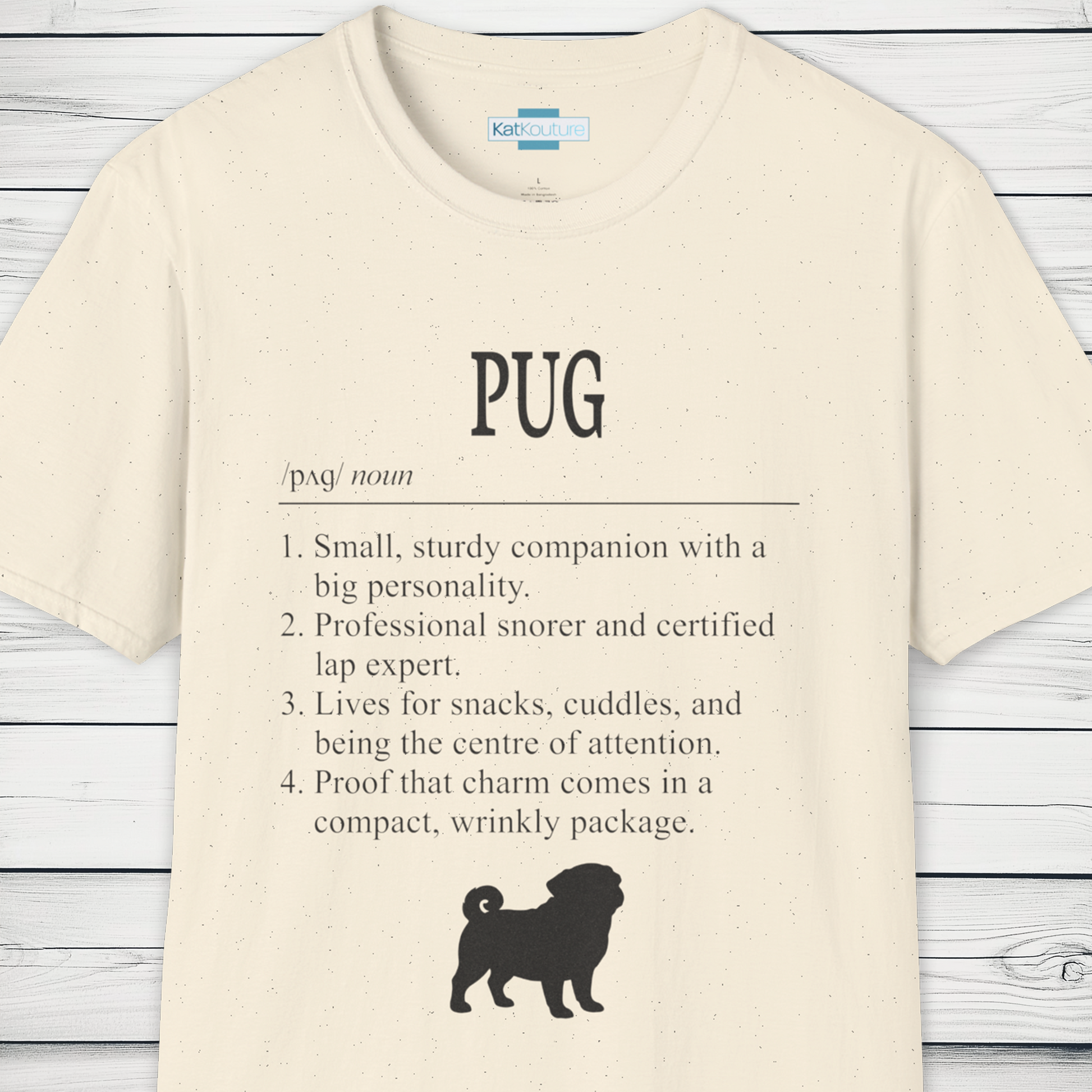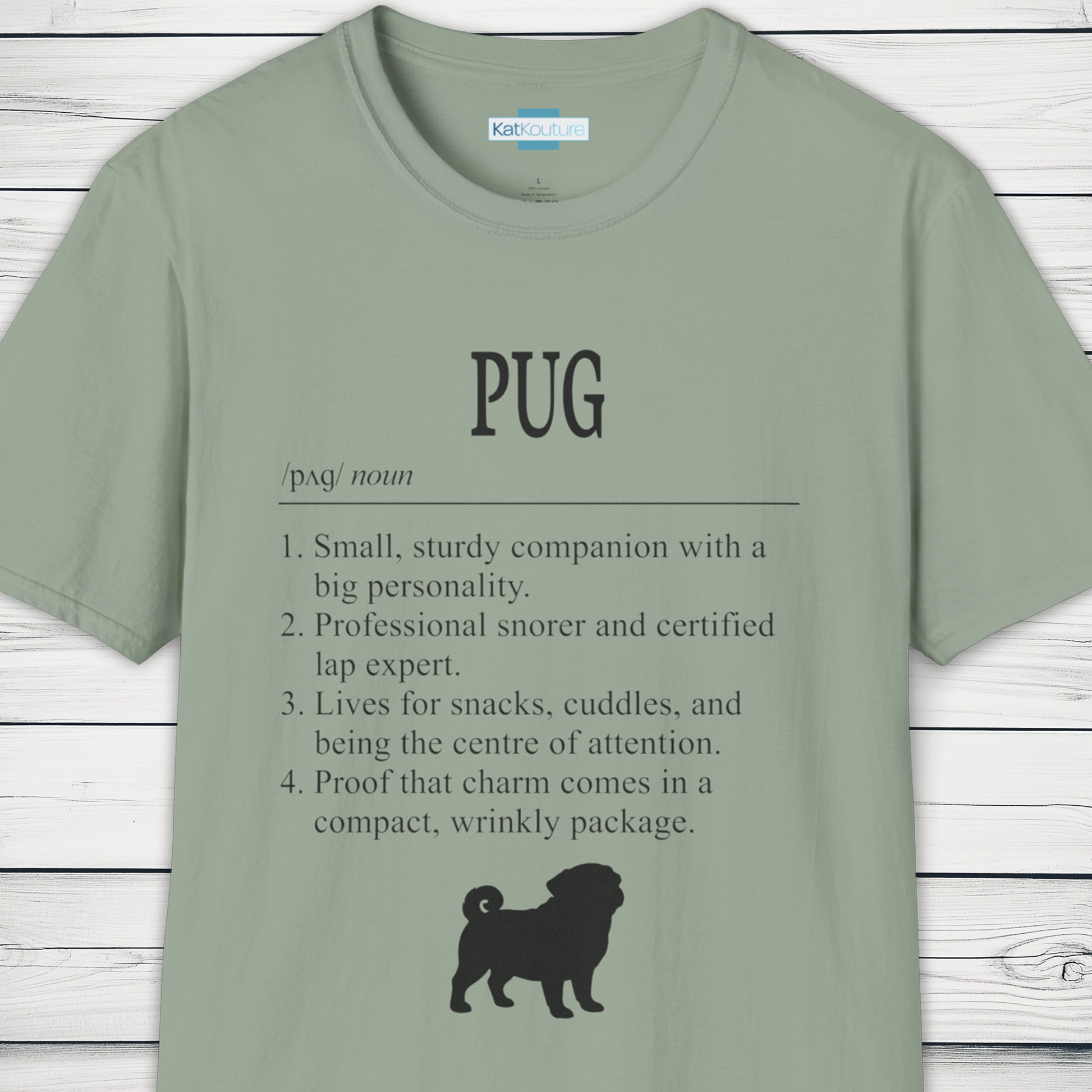 Part of KatKouture’s Dictionary Dogs Collection, this Pug definition T-shirt captures the breed’s compact charm, comic confidence, and cuddle-first lifestyle in a clean, minimalist dictionary-style design. Featuring classic typography, IPA pronunciation, and four thoughtfully written traits, it blends real Pug personality with a subtle wink of wit.