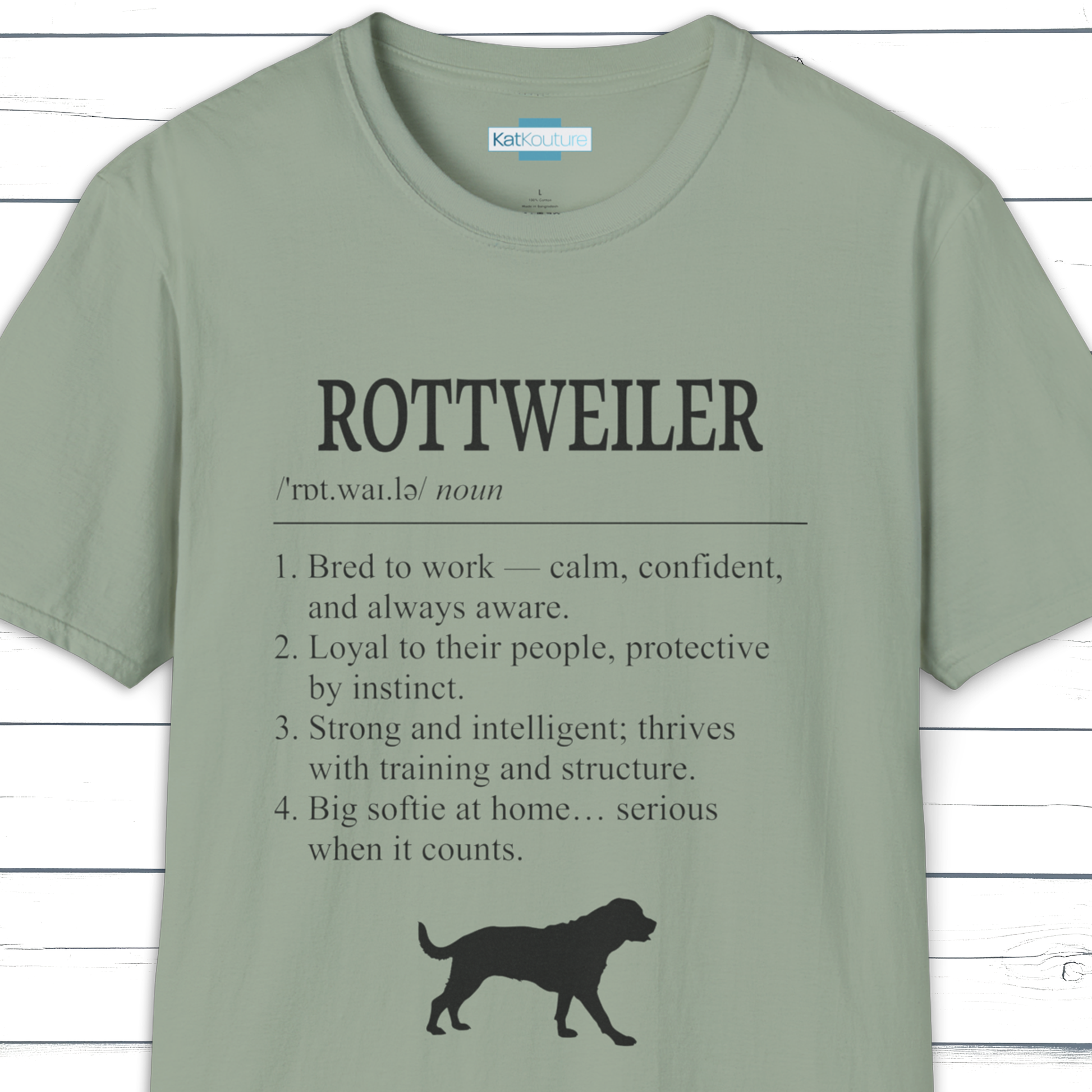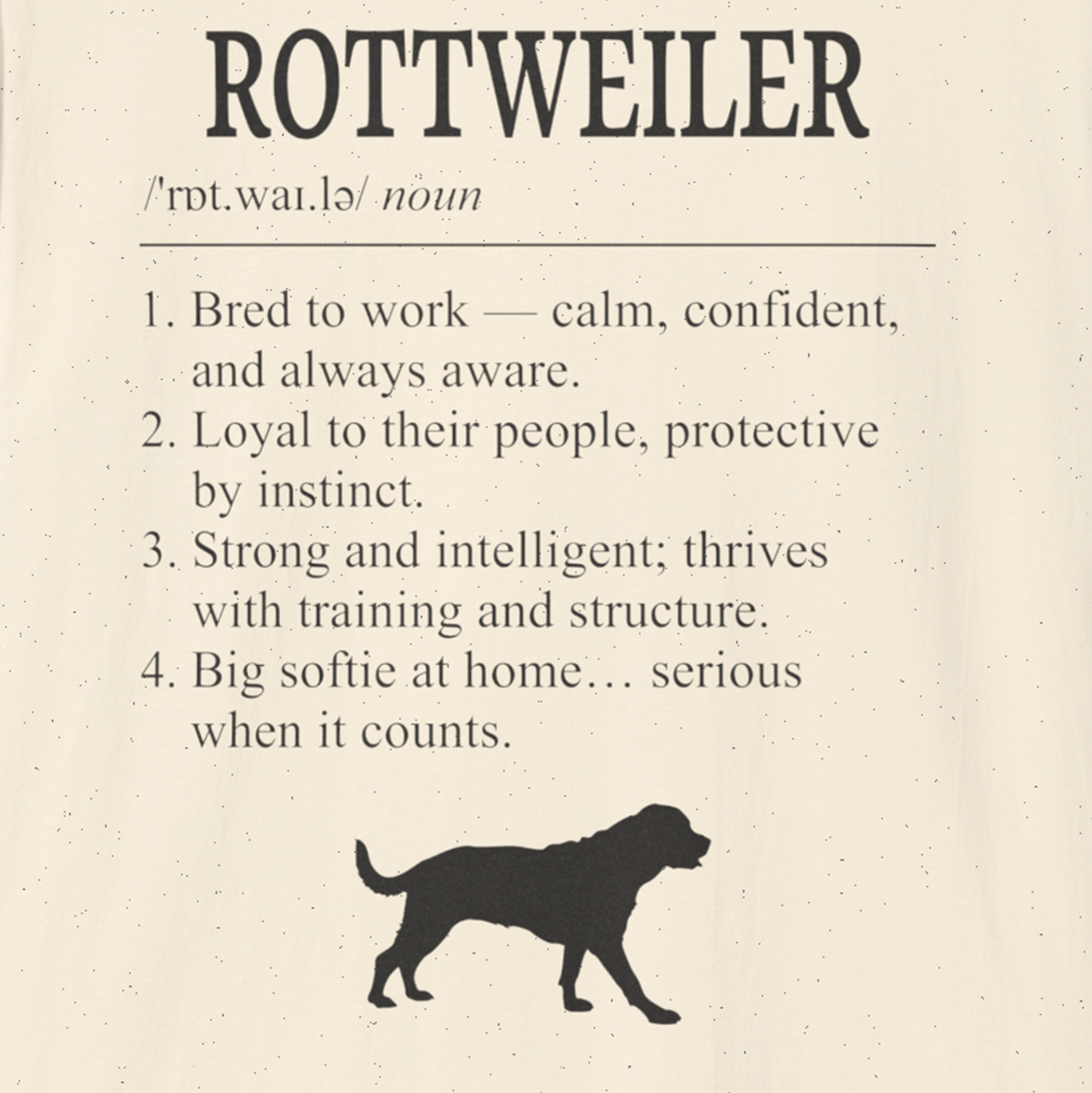 Part of KatKouture’s Dictionary Dogs Collection — a refined typographic design capturing the Rottweiler’s calm confidence and loyal, protective nature. Presented in a classic dictionary layout with pronunciation styling and four neatly observed traits.