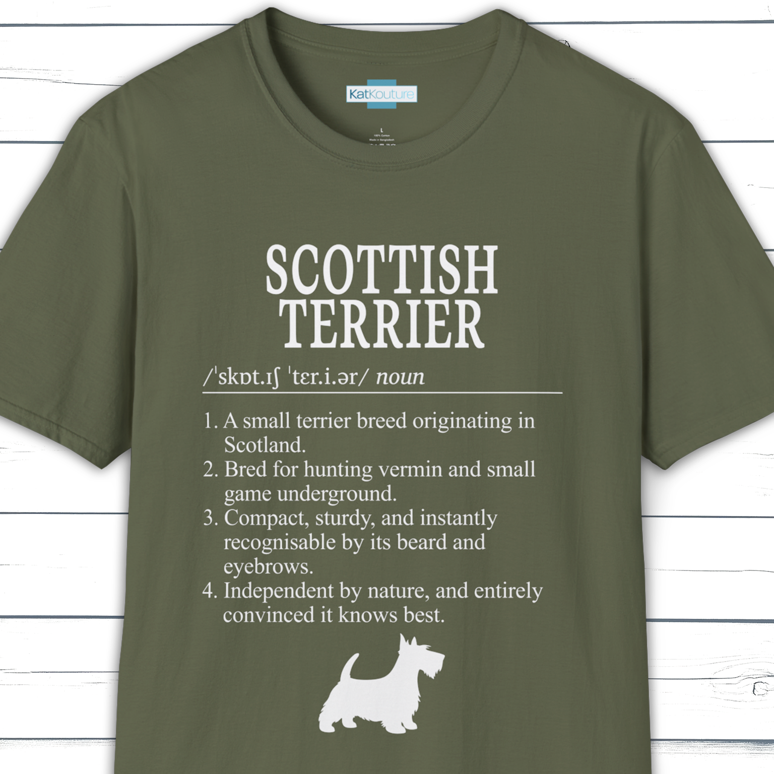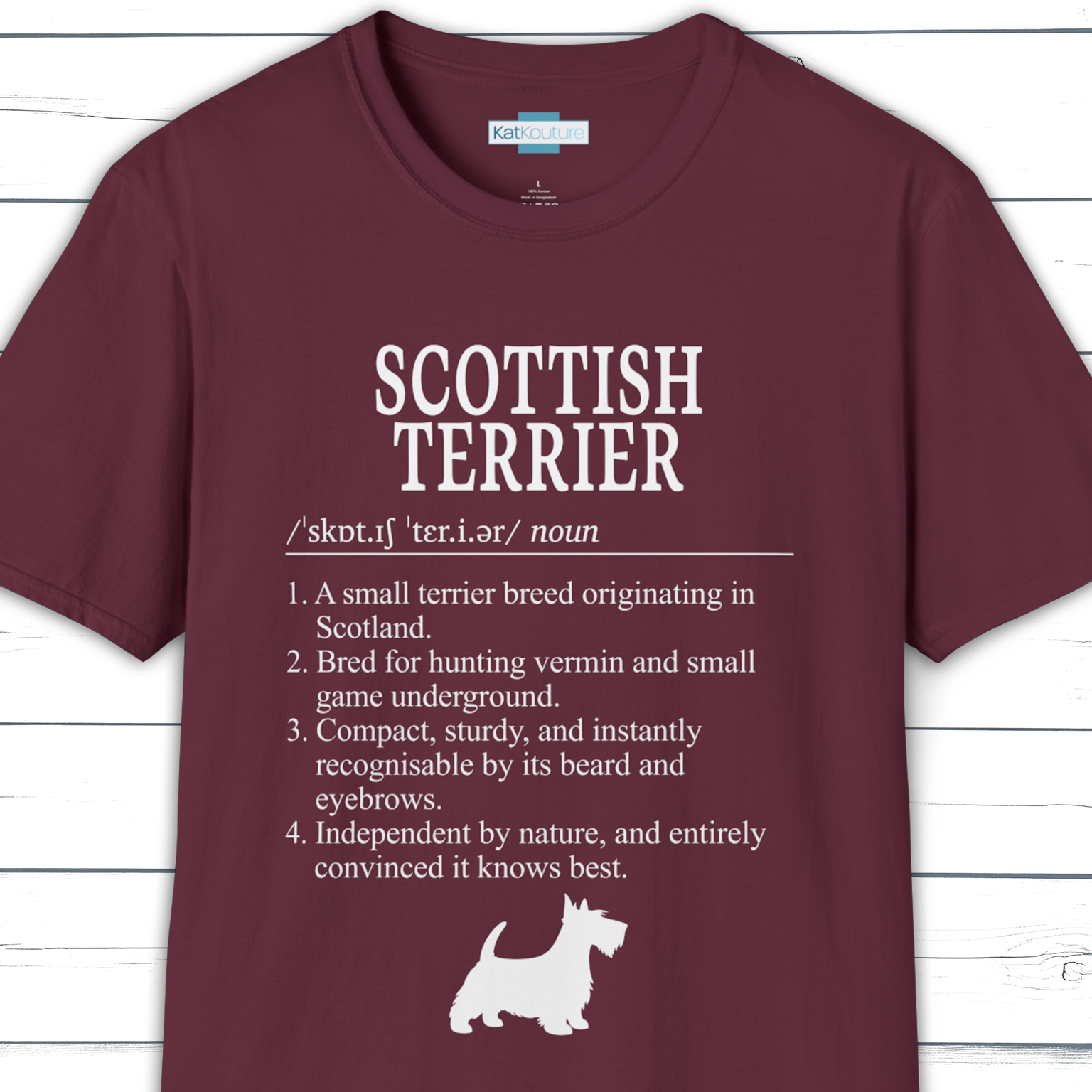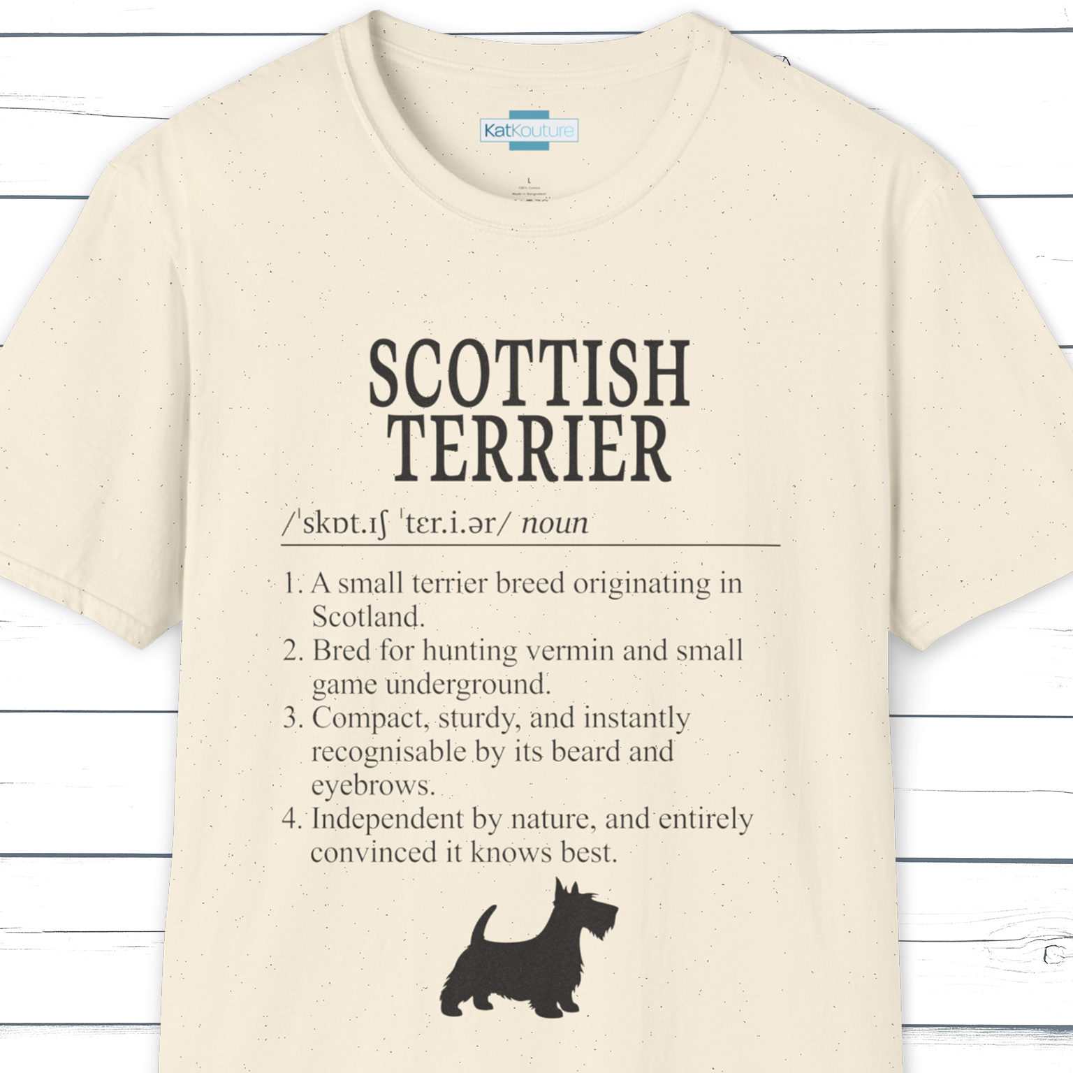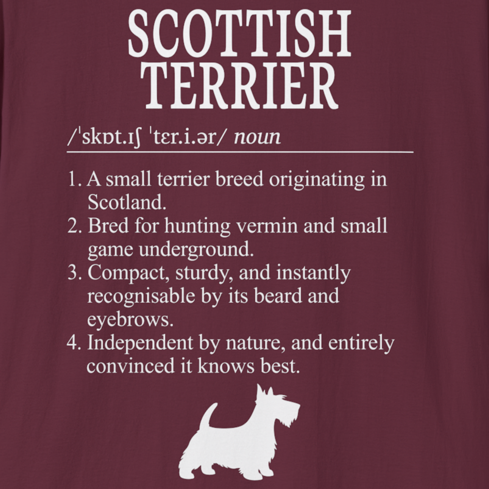 Part of KatKouture’s Dictionary Dogs Collection, this Scottish Terrier definition T-shirt celebrates a classic small terrier with a big personality. Designed in a clean, dictionary-style layout with classic typography, IPA pronunciation, and four carefully written facts, it combines true breed heritage with a subtle, dry wink of humour.