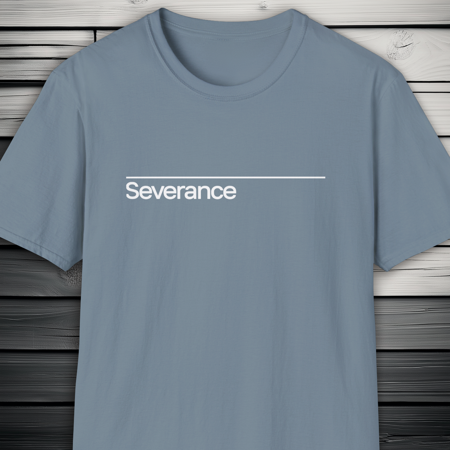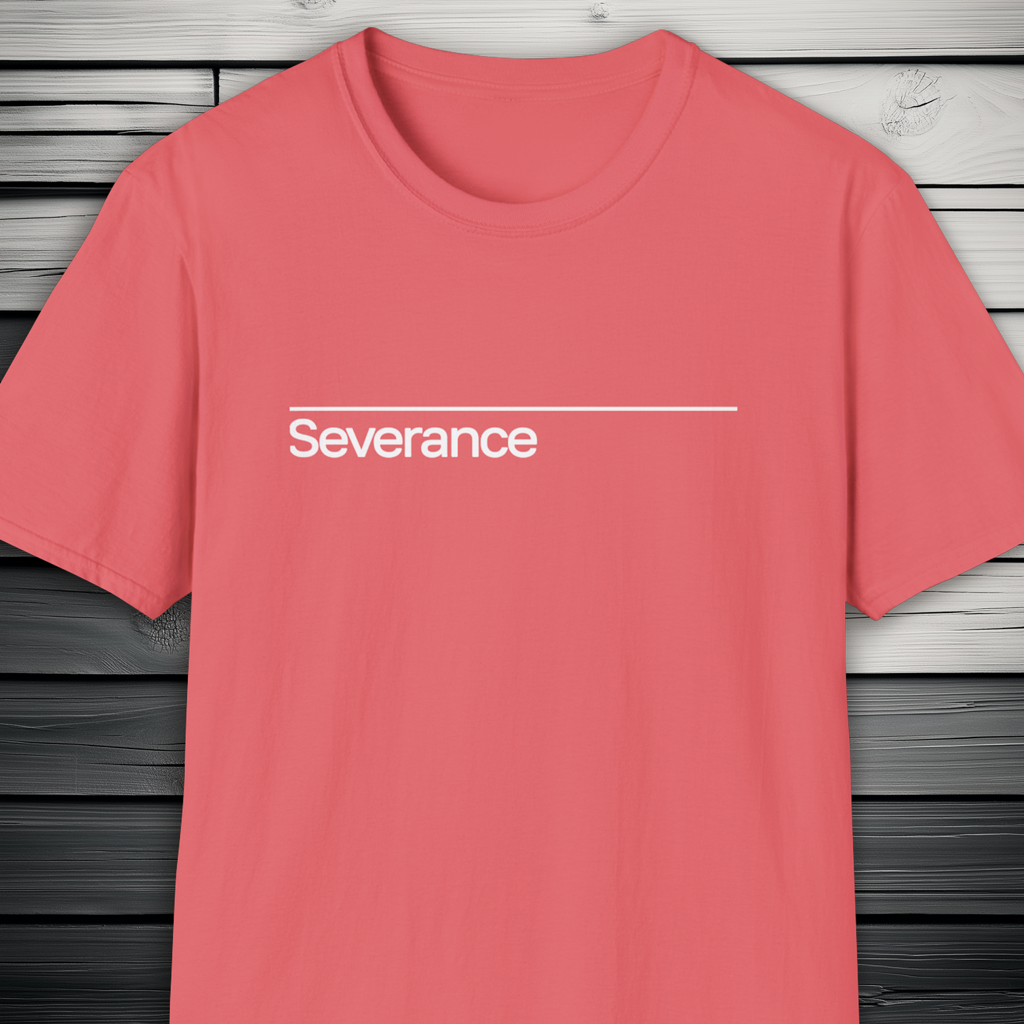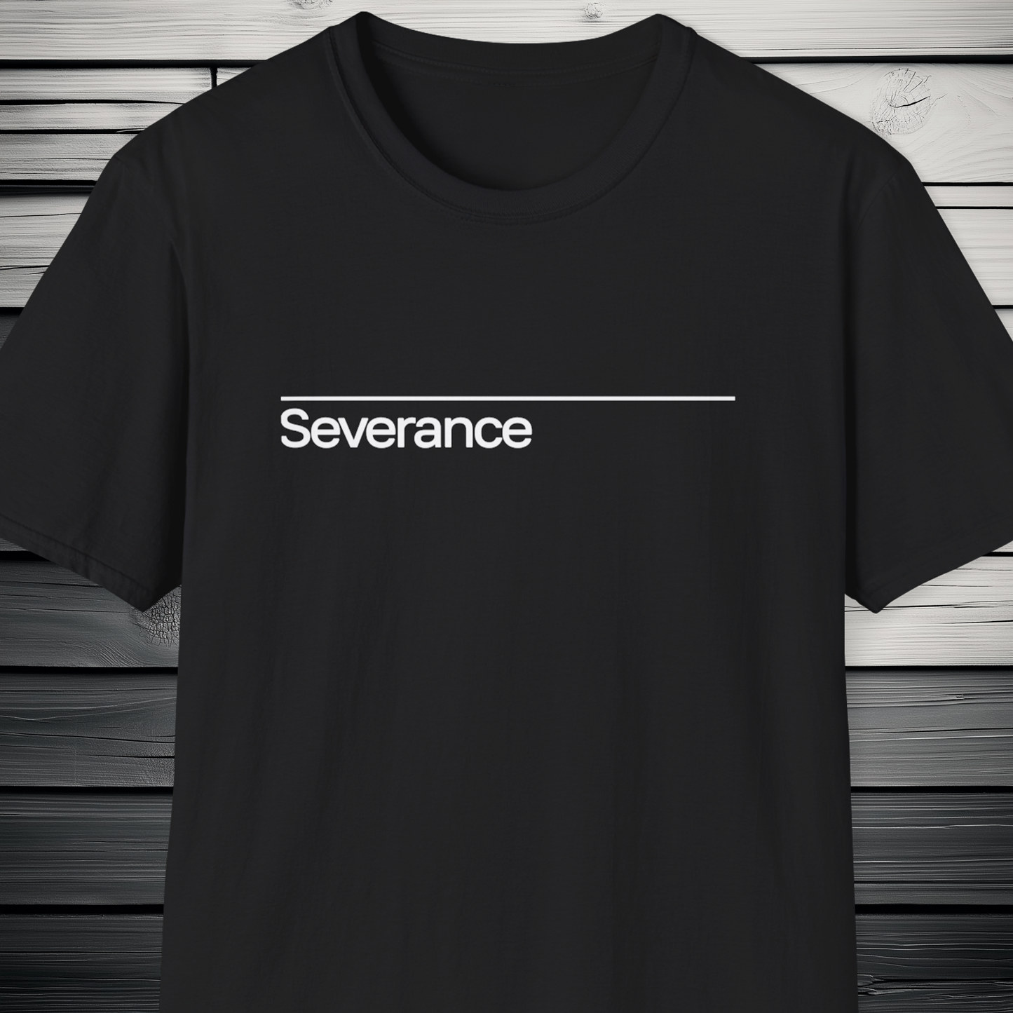 This T-shirt design is inspired by the Apple TV series Severance. The minimalist aesthetic reflects the show's clean, corporate tone. The word "Severance" is featured prominently in a sleek, sans-serif font, underlined by a thin horizontal line, evoking the stark, structured visuals of the show's branding. The design emphasizes simplicity and modernity, capturing the enigmatic and thought-provoking essence of the series. This T-shirt is versatile enough to be worn on any occasion.