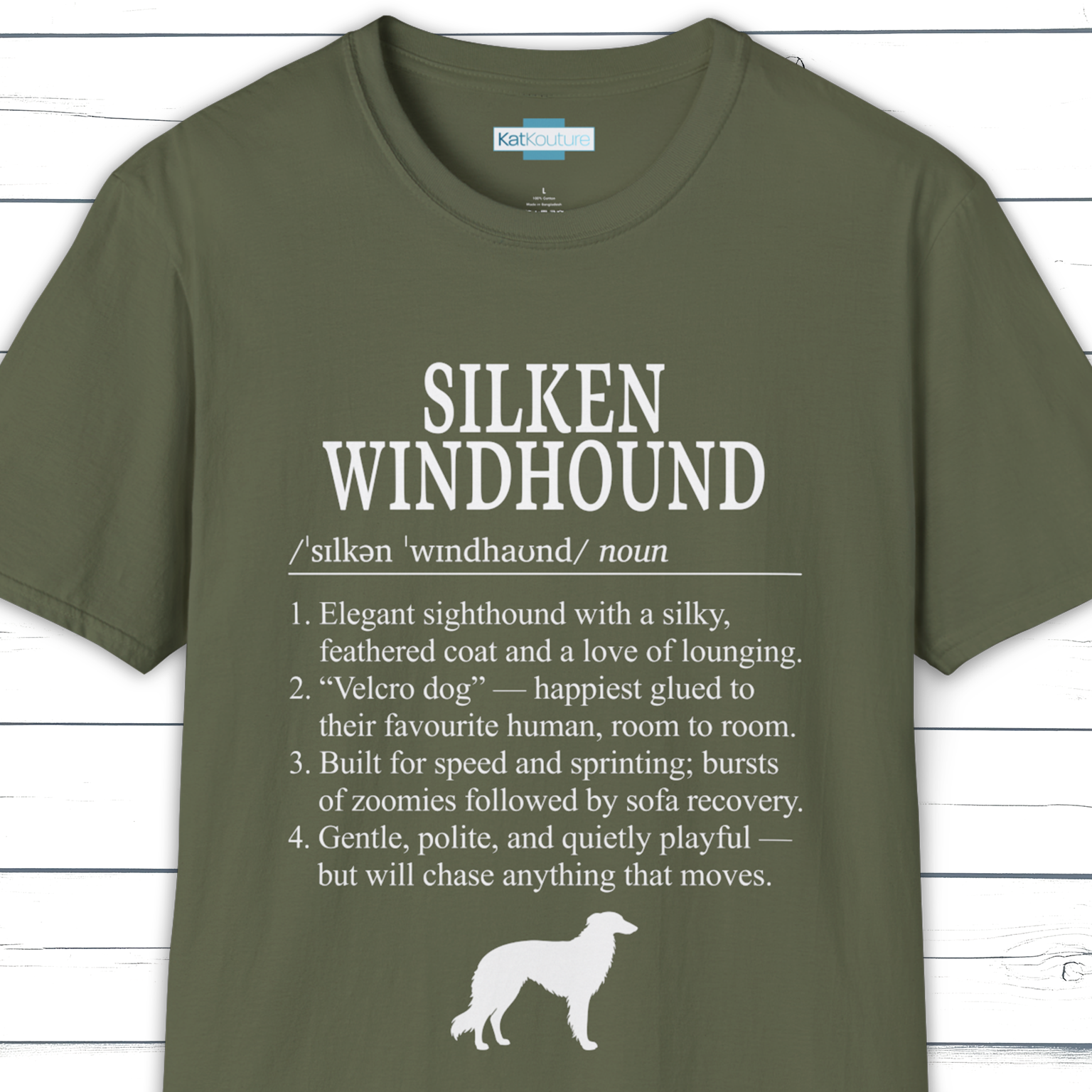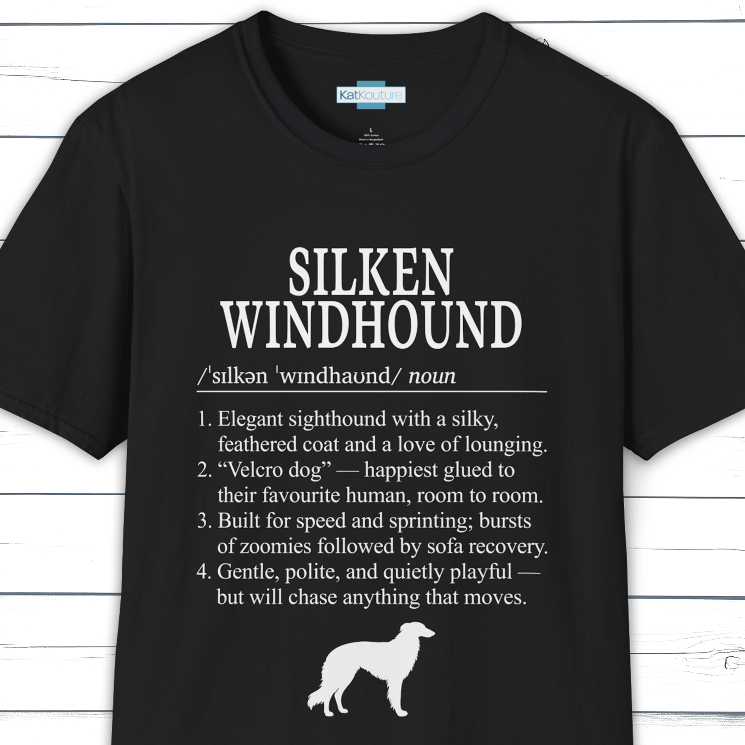 Part of KatKouture’s Dictionary Dogs Collection, this Silken Windhound definition T-shirt celebrates the breed’s graceful elegance, gentle nature, and quietly playful charm in a clean, minimalist dictionary-style design. Featuring classic typography, IPA pronunciation, and four thoughtfully written traits, it blends real Silken Windhound heritage with a subtle wink of wit.