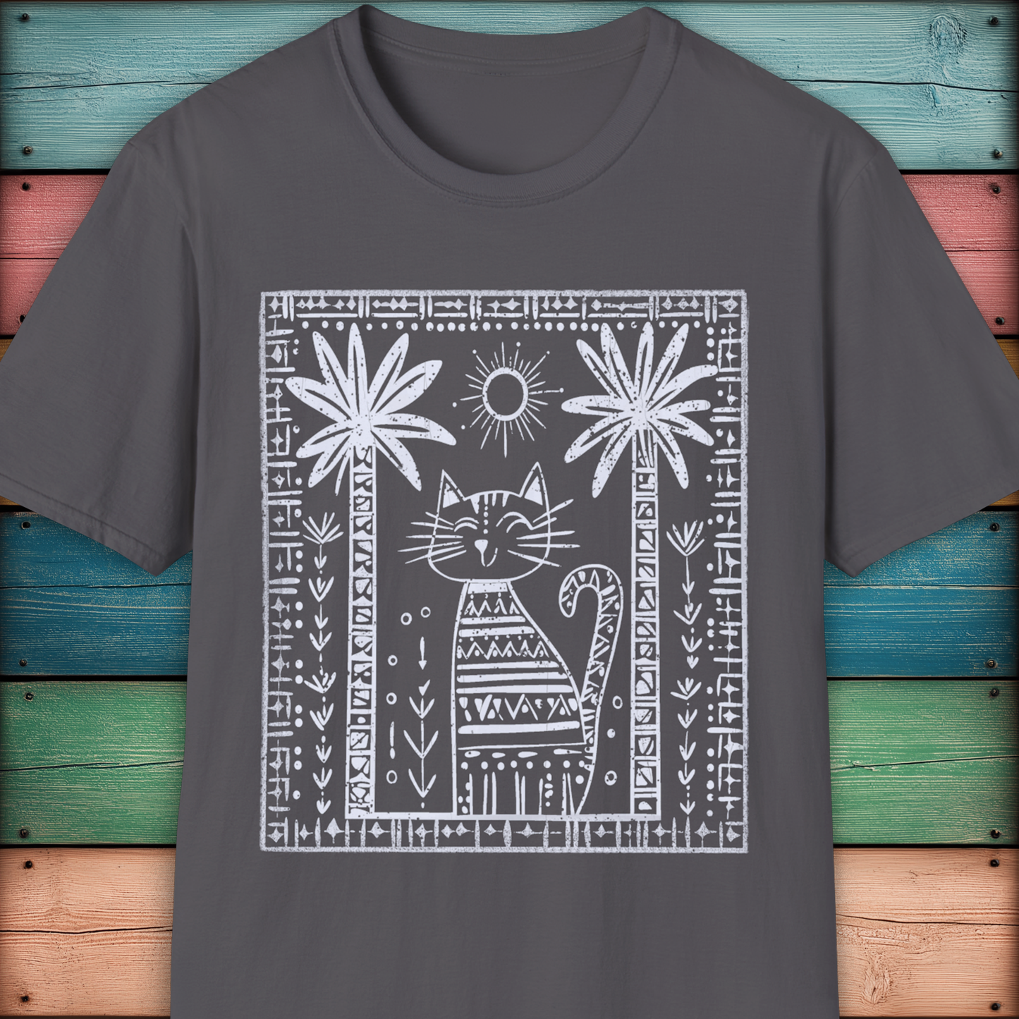 Embrace the relaxed vibes with this tribal-style cat T-Shirt featuring a hand-drawn design with geometric patterns, folk-art texture, and a confident feline. Perfect for those who love unique and charming apparel. Suitable for casual wear, lounging, or as a statement piece for cat lovers. Ideal for gifting on birthdays, holidays, or just because. Printed in a variety of colours, each with themed tones, this shirt has that perfect vintage-meets-modern feel. It's great for cat lovers, boho souls, or anyone who likes their wardrobe to say “artsy and chill” without trying too hard.
