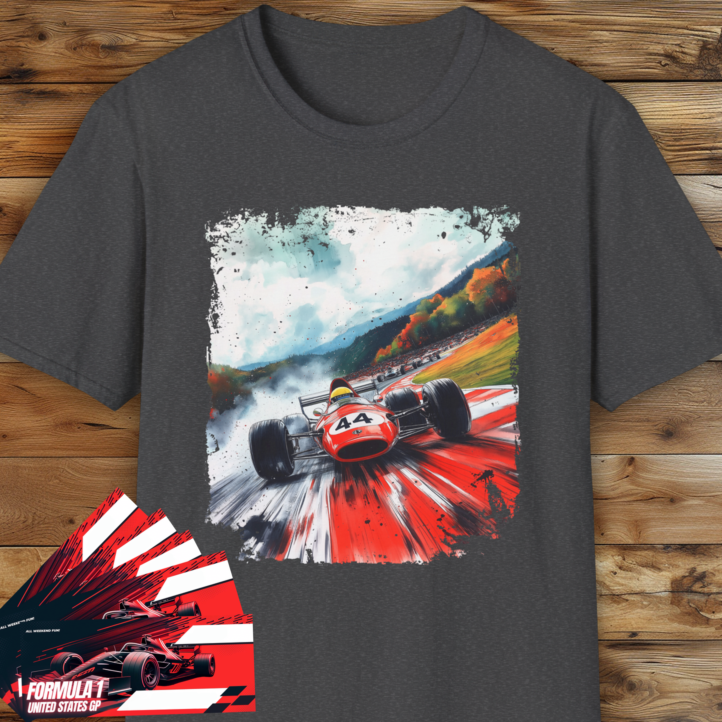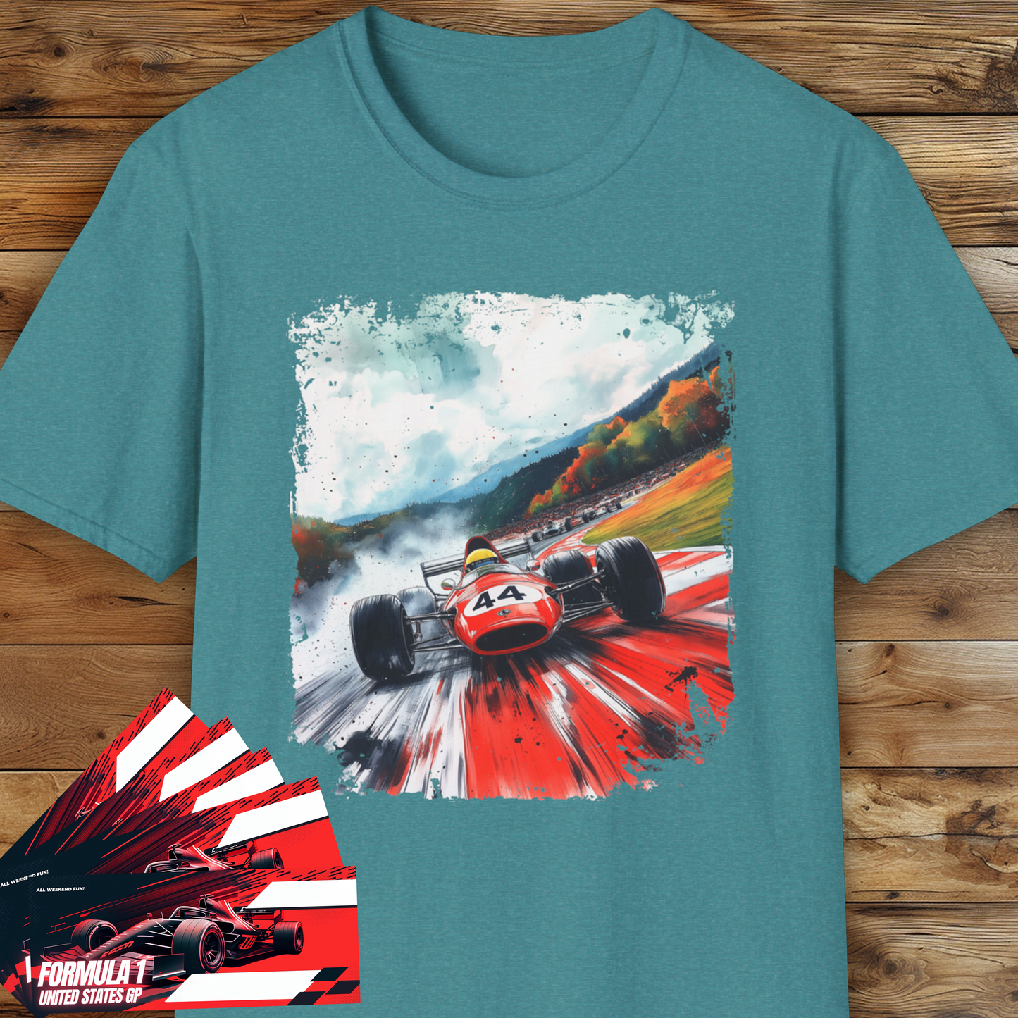 This T-shirt design features a vintage Formula 1 racing car speeding along a racetrack with the number '44' prominently displayed. The dynamic, painterly style and vibrant fall colours create a sense of motion and excitement, perfect for racing enthusiasts. This unisex T-shirt is made from 100% ringspun cotton, lightweight and smooth, suitable for year-round wear. The classic fit and crew neckline offers a versatile style for any occasion.
