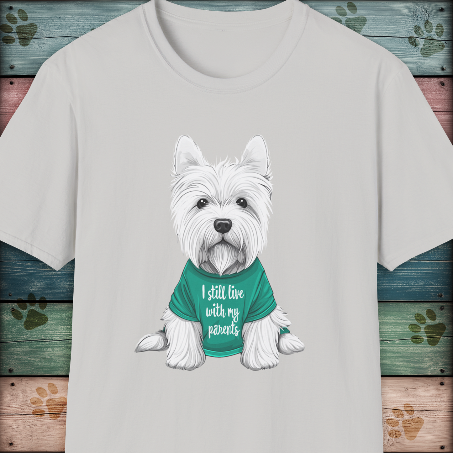 This adorable T-shirt features a beautifully illustrated West Highland White Terrier (Westie) wearing a green shirt with the humorous phrase, 'I still live with my parents.' Perfect for dog lovers and pet parents, this design adds a touch of charm and lighthearted style. Great as a gift for dog owners or Westie enthusiasts, this shirt is ideal for casual wear, lounging, or running errands with your furry best friend. It gives off a fun and playful vibe, making it a standout piece in any dog lover's wardrobe. Relevant for dog-related holidays and celebrations.