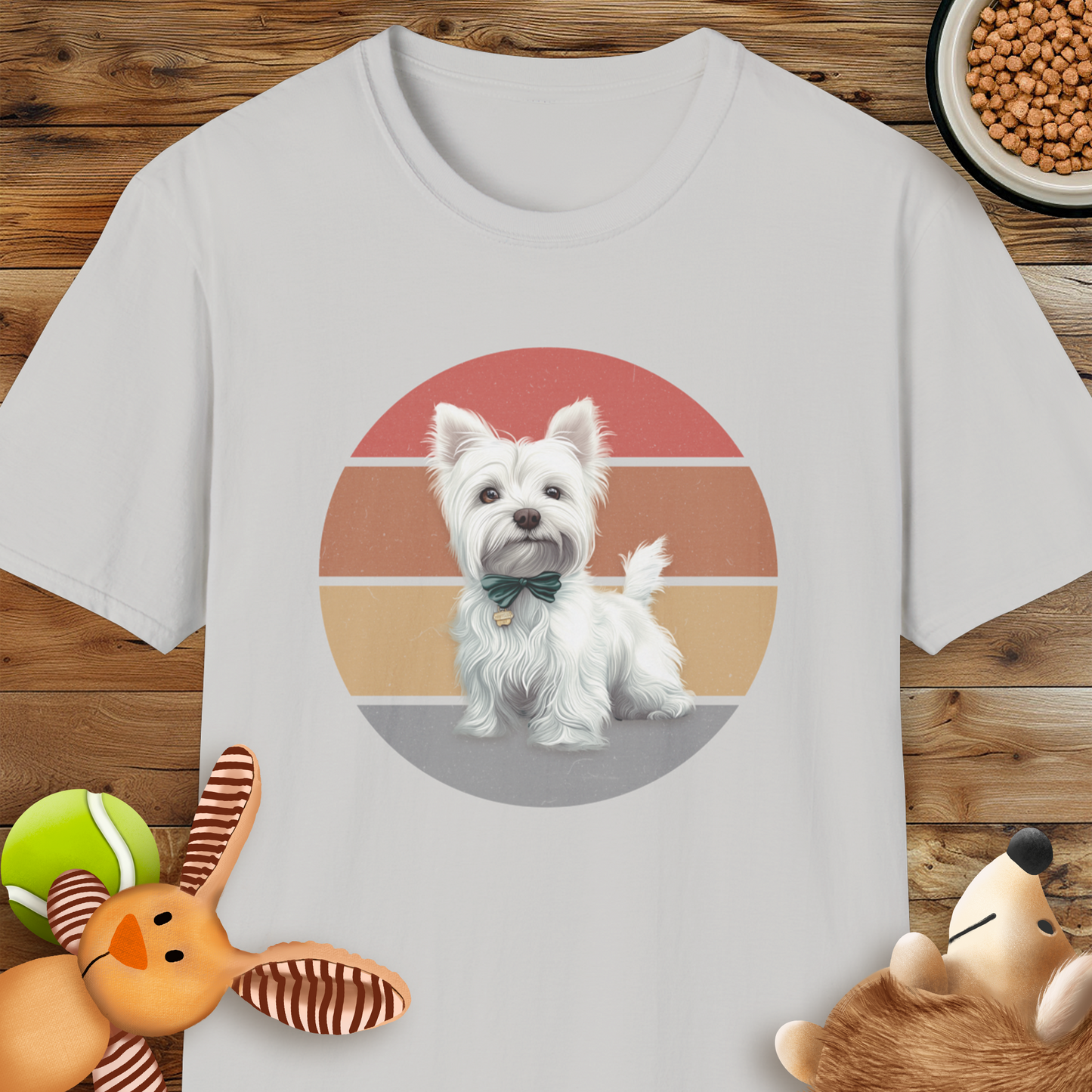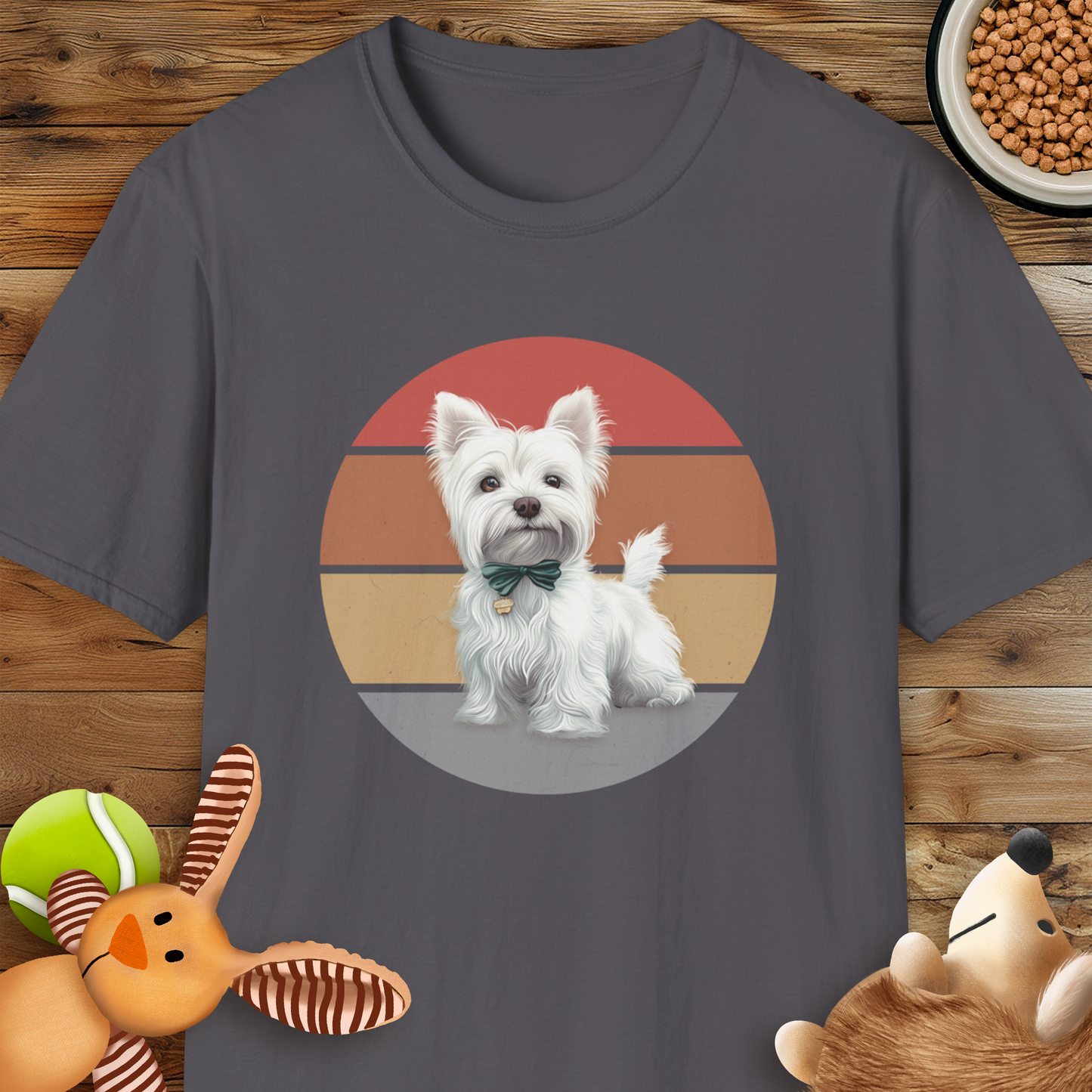 This T-shirt design features an adorable white West Highland Terrier sitting proudly, adorned with a stylish green bow tie and a small golden tag on its collar. The background incorporates a retro-inspired circular gradient of horizontal stripes in warm shades of red, orange, beige, and grey, creating a vintage yet modern aesthetic. This playful and heartwarming design is ideal for dog lovers and anyone who appreciates charming, pet-themed apparel.
