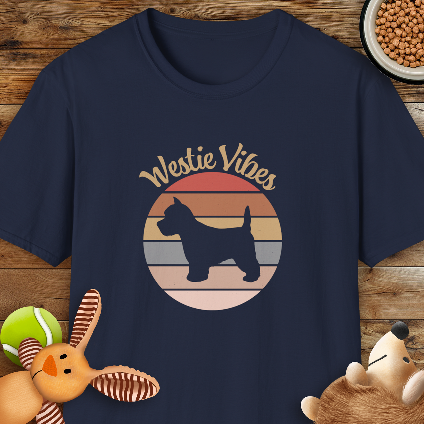 This t-shirt features a West Highland White Terrier (Westie) centred within a retro-style circular background. The warm-toned stripes and cursive 'Westie Vibes' phrase bring a playful and nostalgic vibe. Perfect for Westie owners and dog lovers, this t-shirt is ideal for casual wear or as a thoughtful gift for dog-themed holidays.