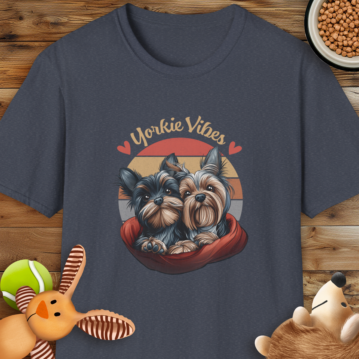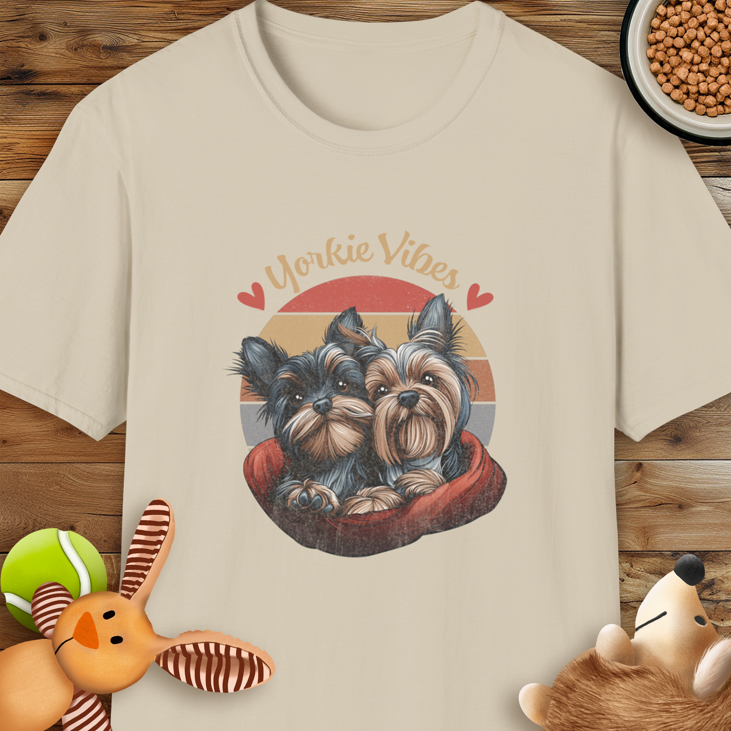 A cosy and fun T-shirt featuring two adorable Yorkshire Terriers snuggled together in a vibrant illustration style, set against a retro-style sunset gradient background. The text "Yorkie Vibes" adds a playful touch, perfect for dog lovers, especially fans of Yorkies. This T-shirt is ideal for casual everyday wear and makes a great gift for dog enthusiasts, especially during dog-related celebrations and holidays.